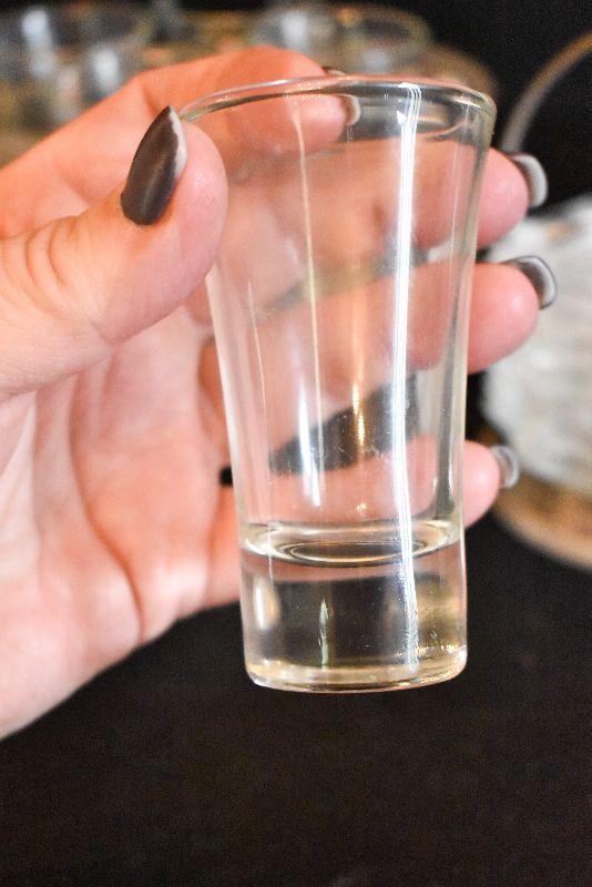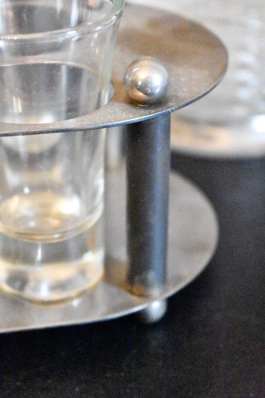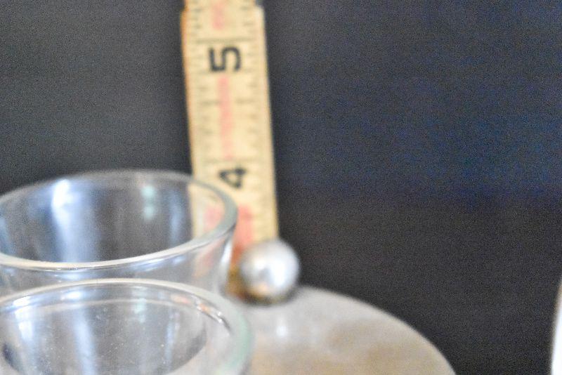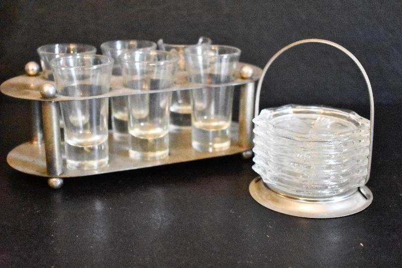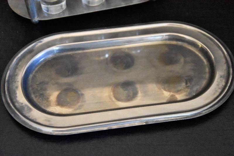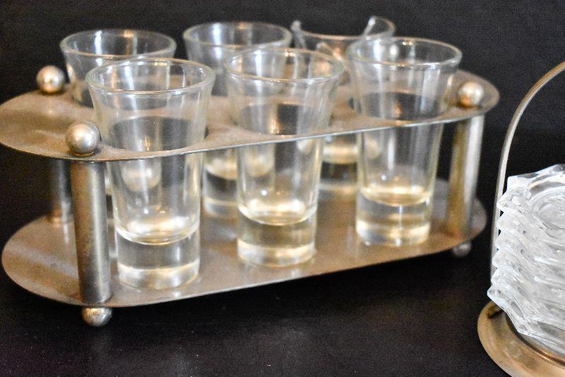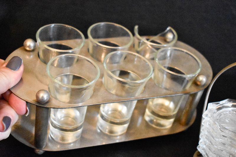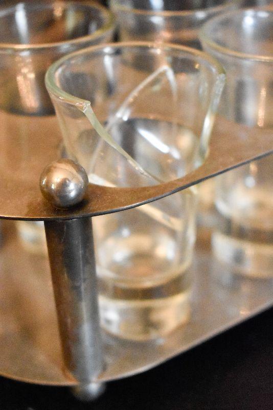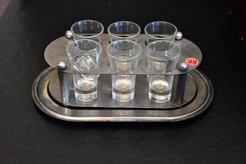One of the shot glasses is broken, but I'm sure could be replaced. Comes with a holding try as well.