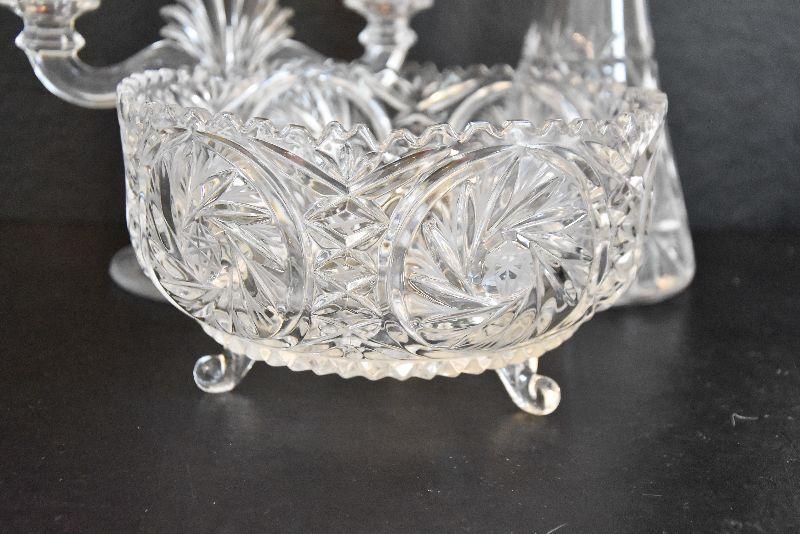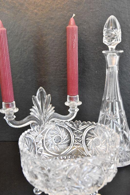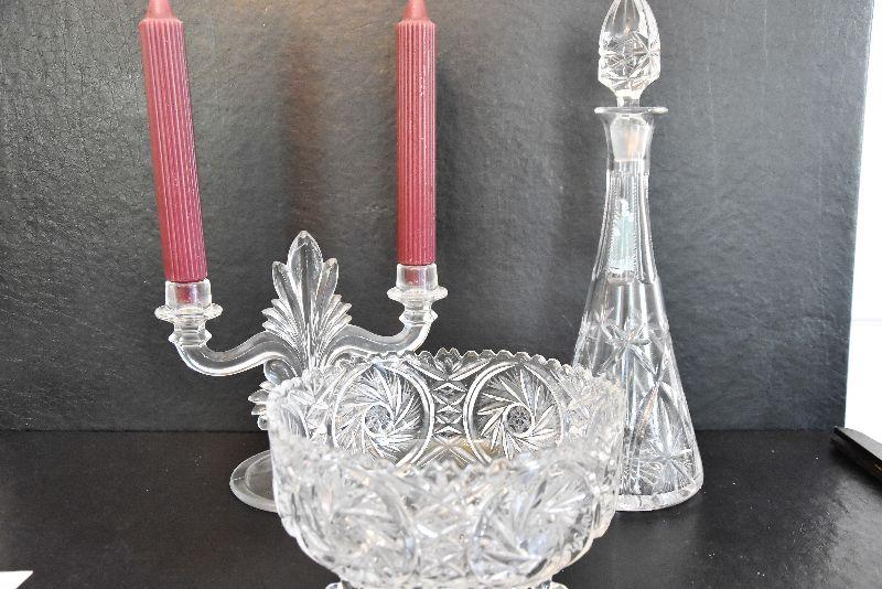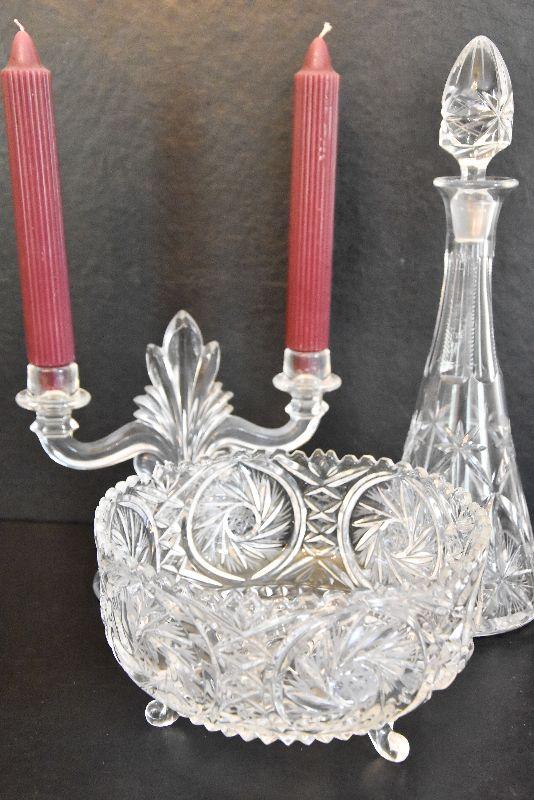Vintage Footed Glass Bowl, Decanter, and Candlestick