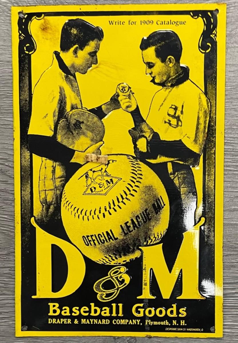 Description: D & M Baseball Goods Advertising Sign. Measures approximately: 9.5 X 6 Inches. Material : Metal.