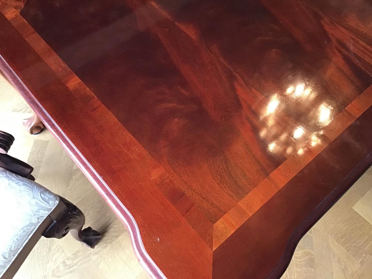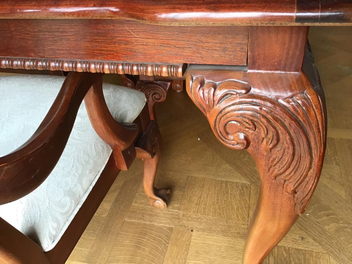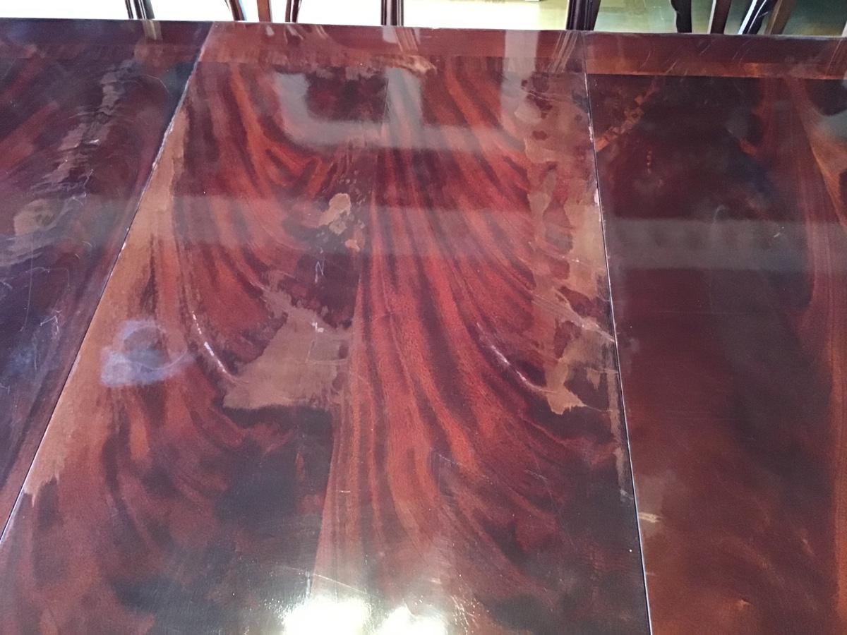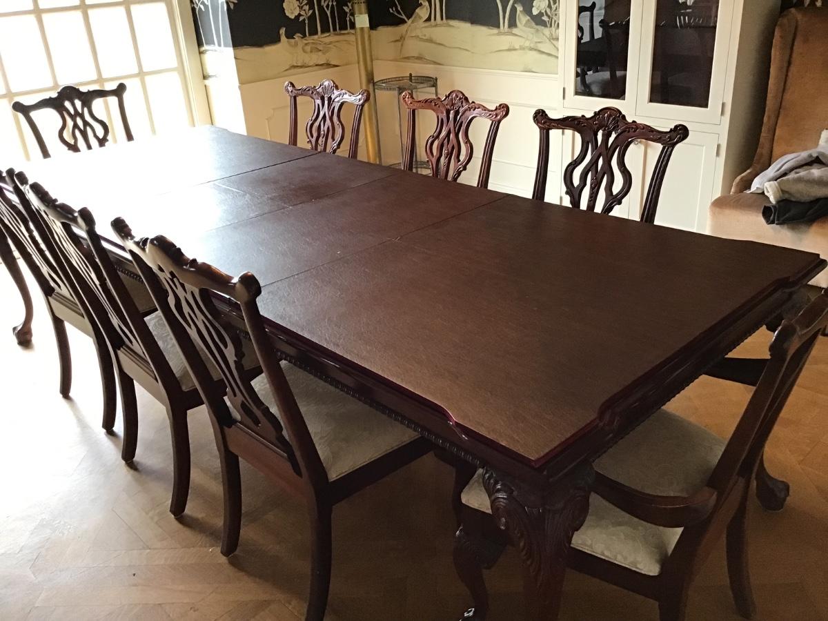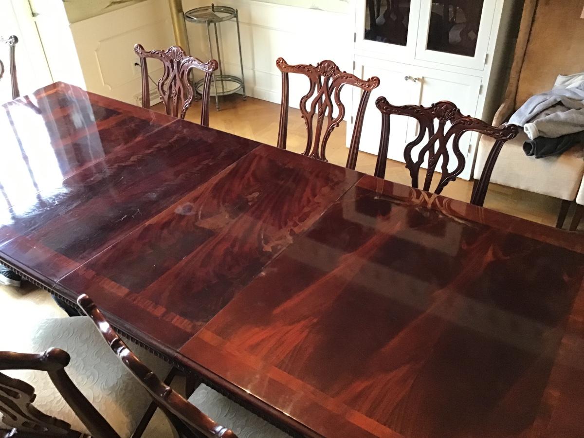 Beautiful! Measures 45”w x 115”l with leaves - includes two leaves (each measures 20” wide). 2 Captain Chairs and 6 Side Chairs. Items on table not included. Two leaves have a bit of damage on top.