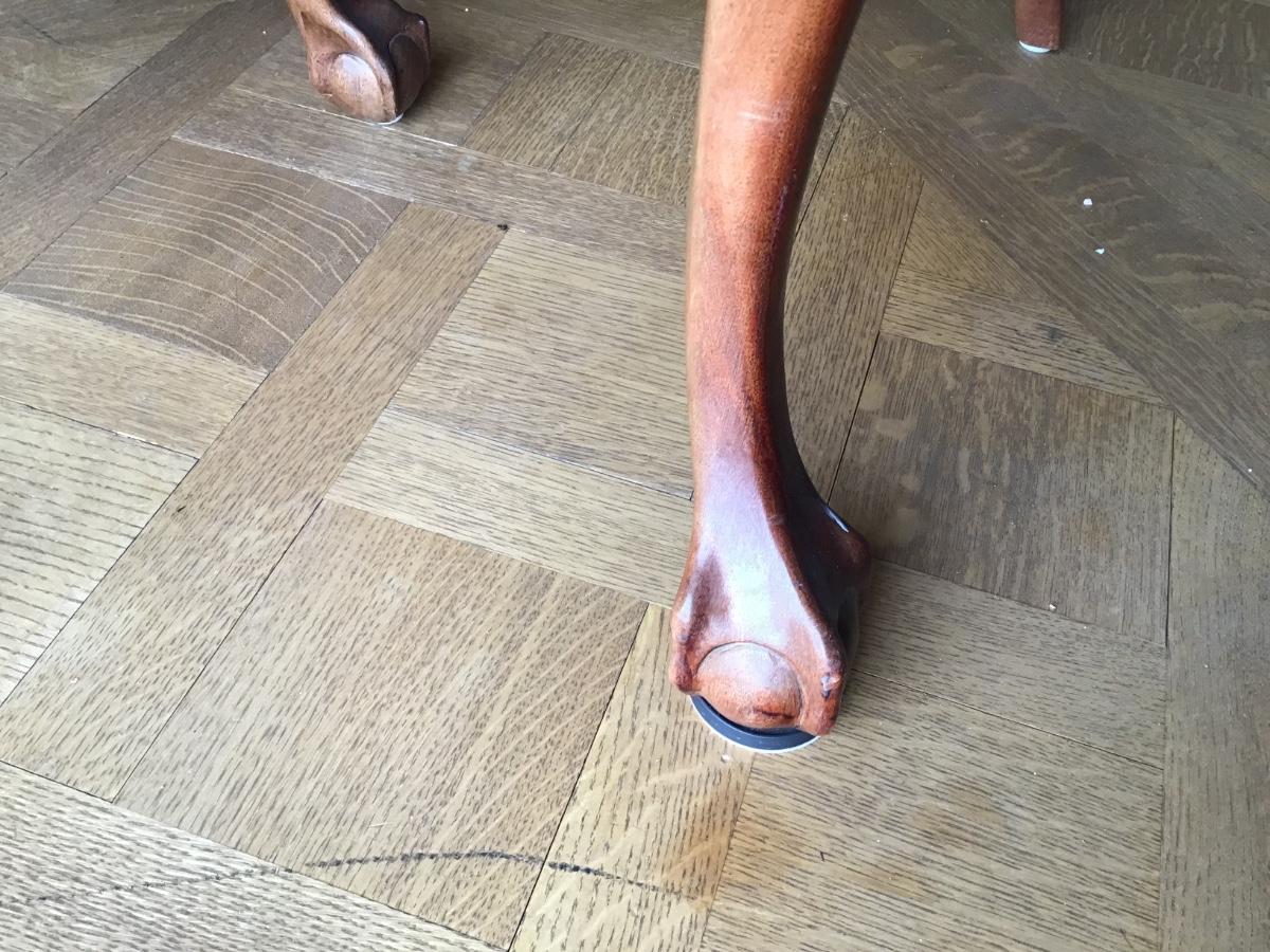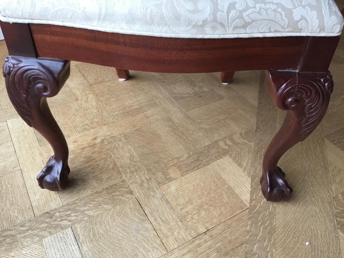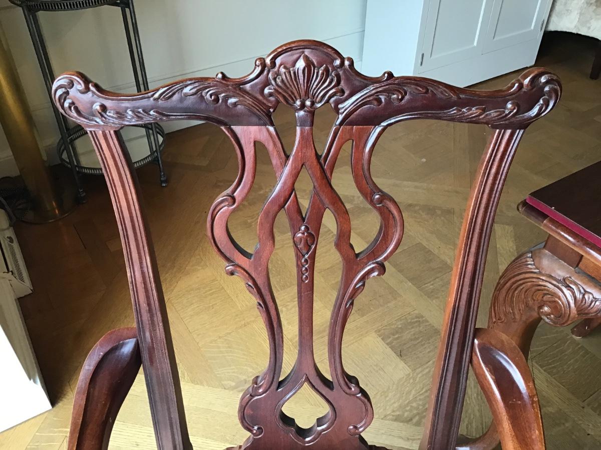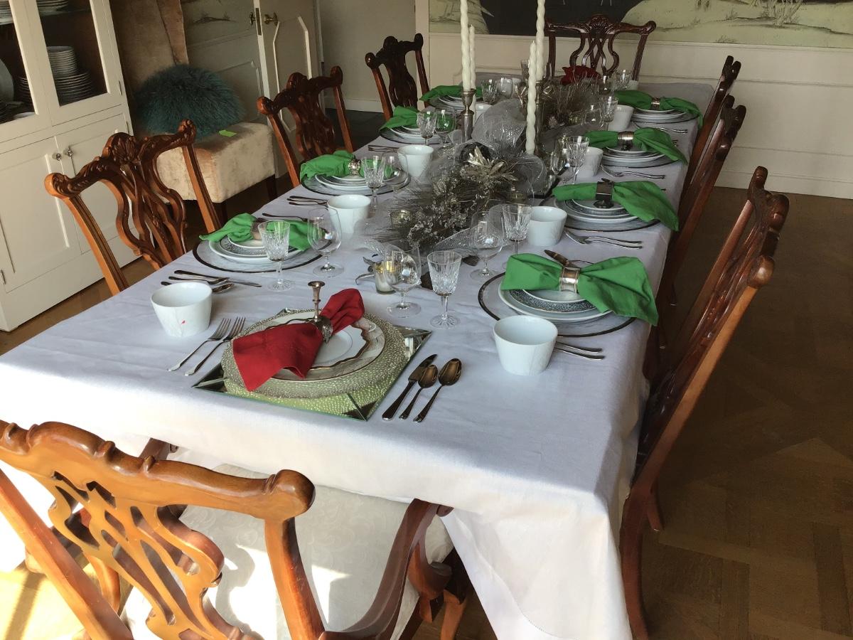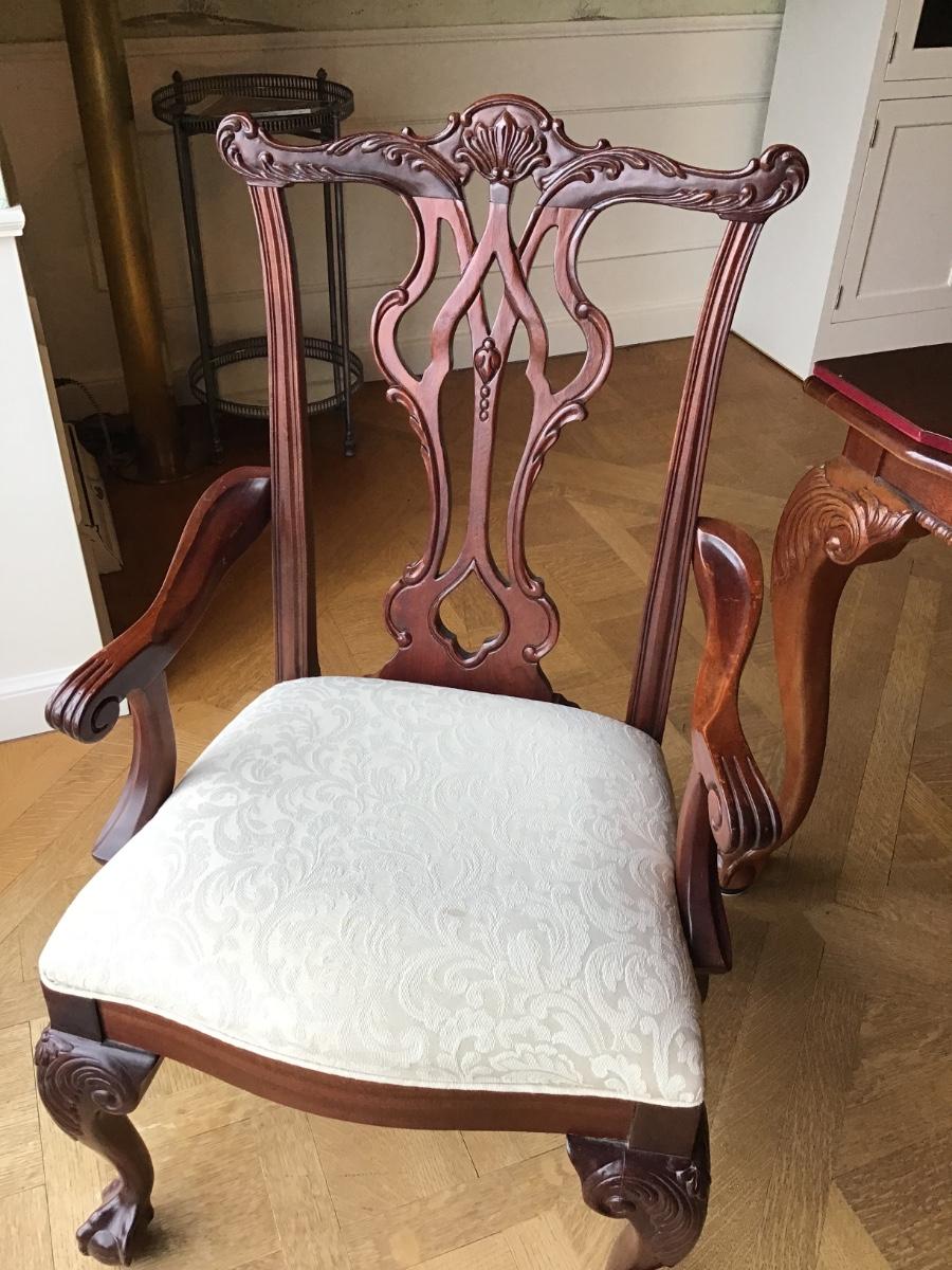 Beautiful! Measures 45”w x 115”l with leaves - includes two leaves (each measures 20” wide). 2 Captain Chairs and 6 Side Chairs. Items on table not included. Two leaves have a bit of damage on top.