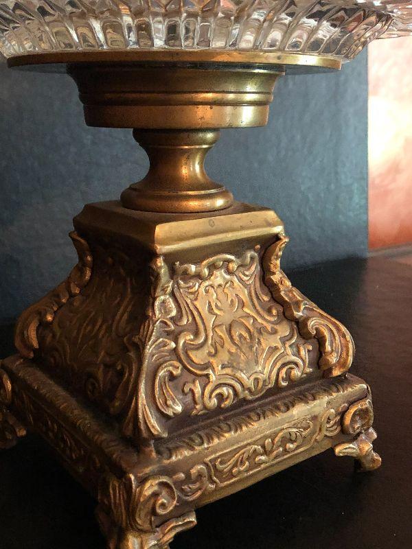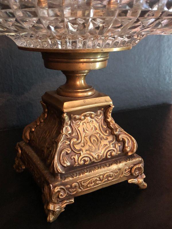 This is a gorgeous piece that can serve almost any function! Perfect for everyday use as votive or jewelry holder, and on special occasions can be used as a tidbit tray for hors d'oeuvres, candies, cookies, or petit fours! Elegant serving at its finest! Brass pedestal stand with brass handled center! Please see pics for sizing and condition!