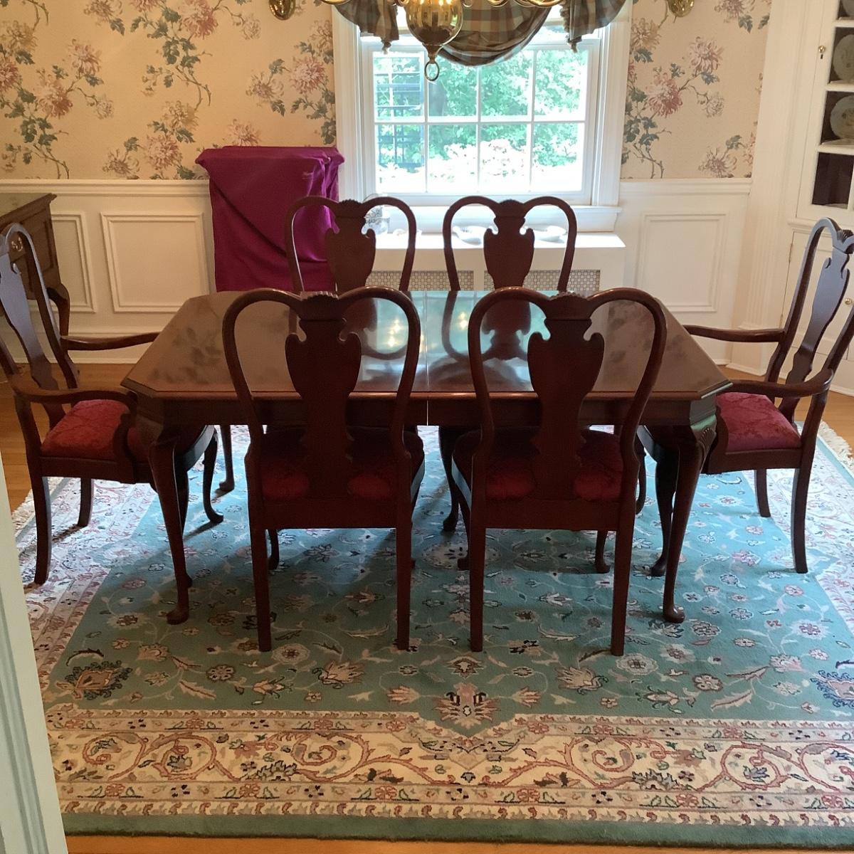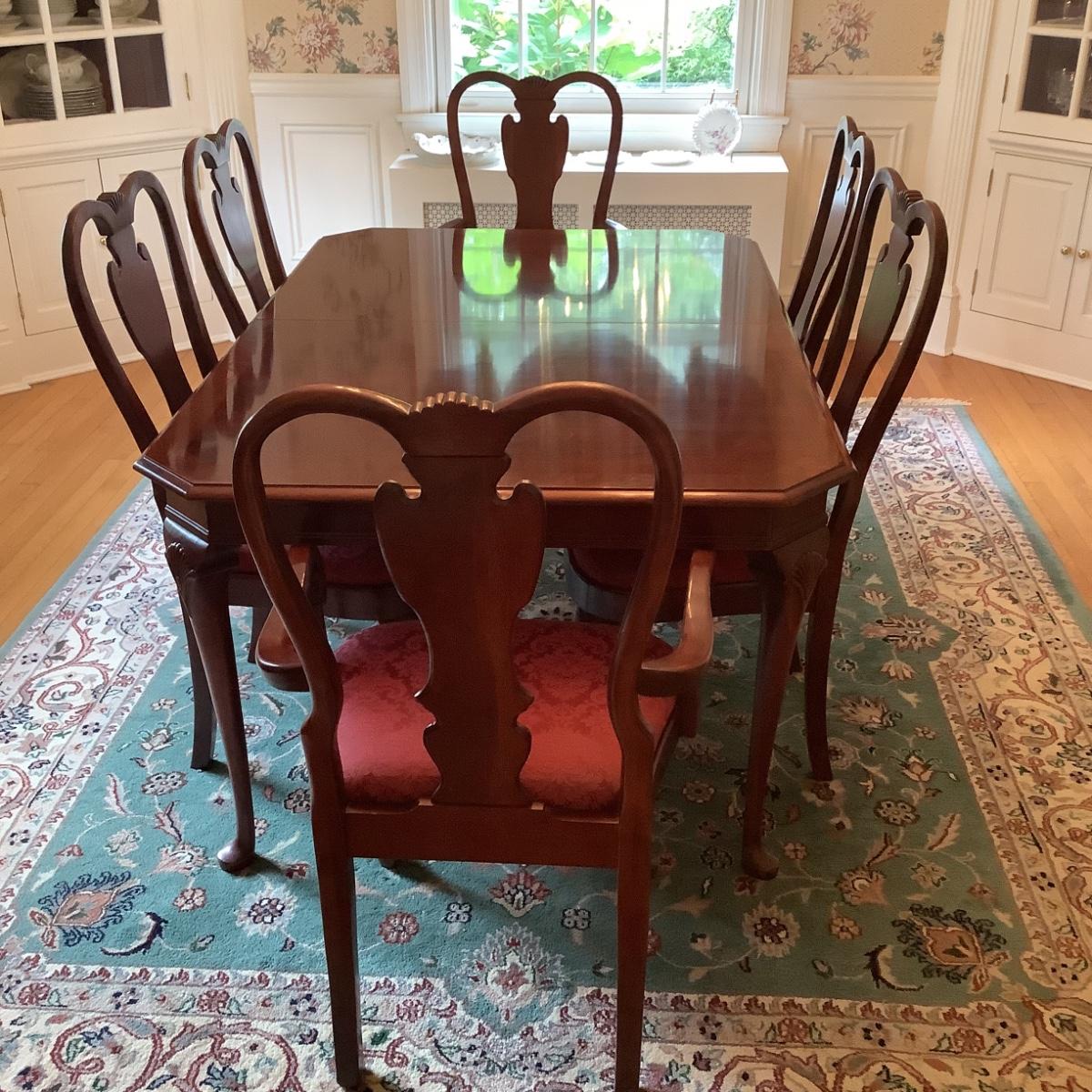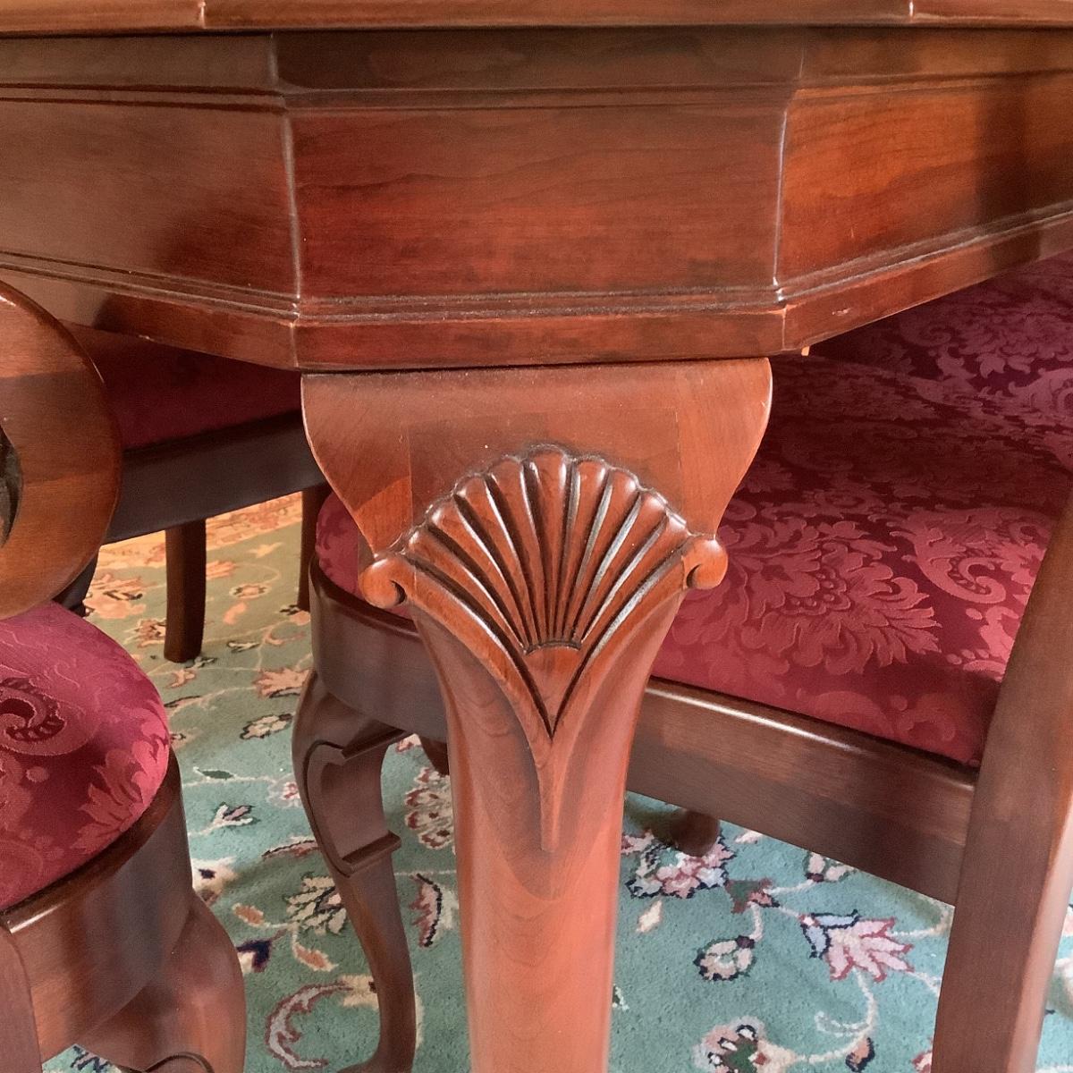 This Beautiful Pennsylvania House Cherry Dining Room Table with 6 Chairs is in excellent condition . This table comes with two (20" width) leaves. Two arm chairs and 4 sitting chairs , all in excellent condition with burgundy upholstery and padding for the table and the extra leaves