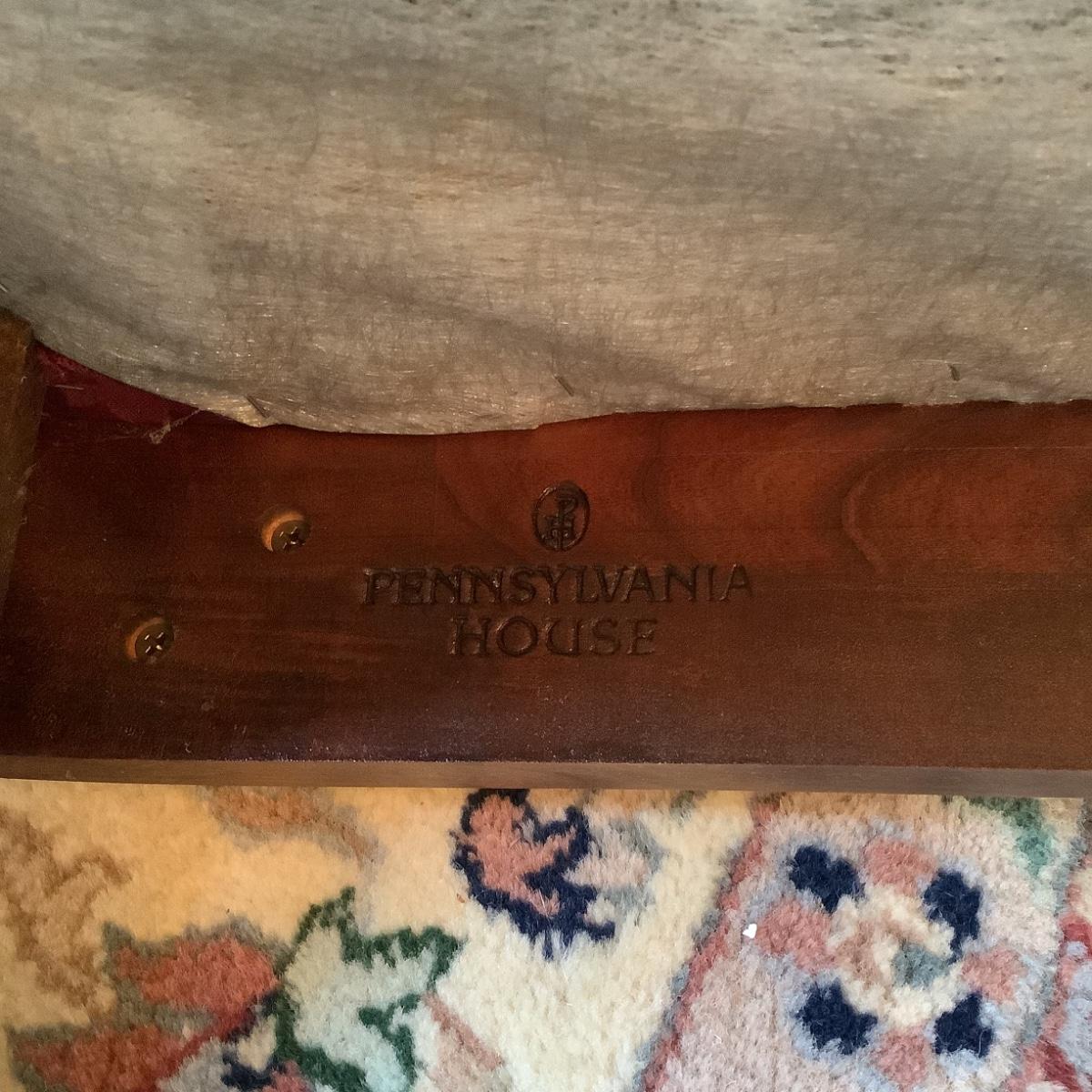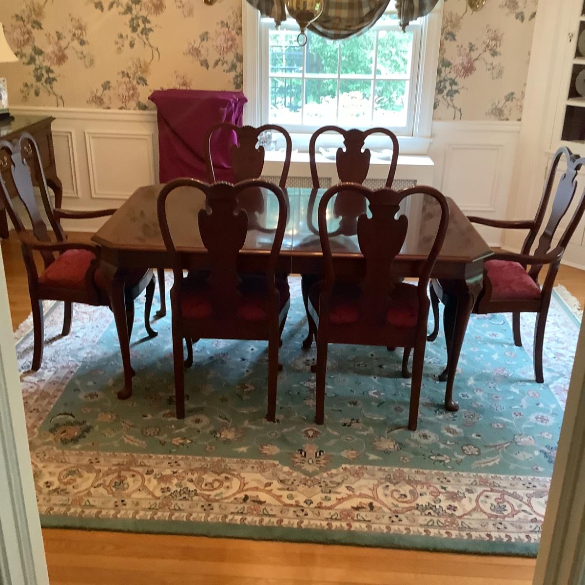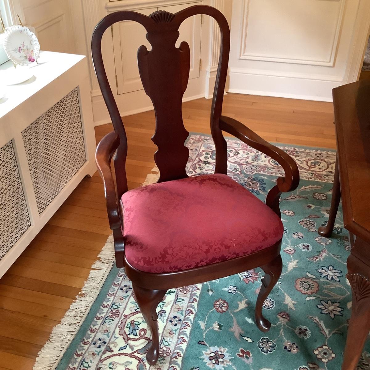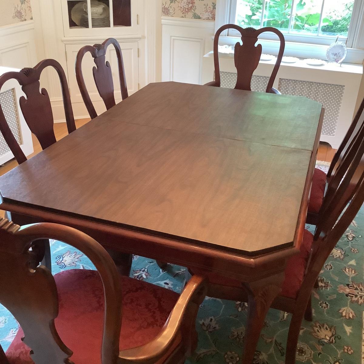 This Beautiful Pennsylvania House Cherry Dining Room Table with 6 Chairs is in excellent condition . This table comes with two (20" width) leaves. Two arm chairs and 4 sitting chairs , all in excellent condition with burgundy upholstery and padding for the table and the extra leaves