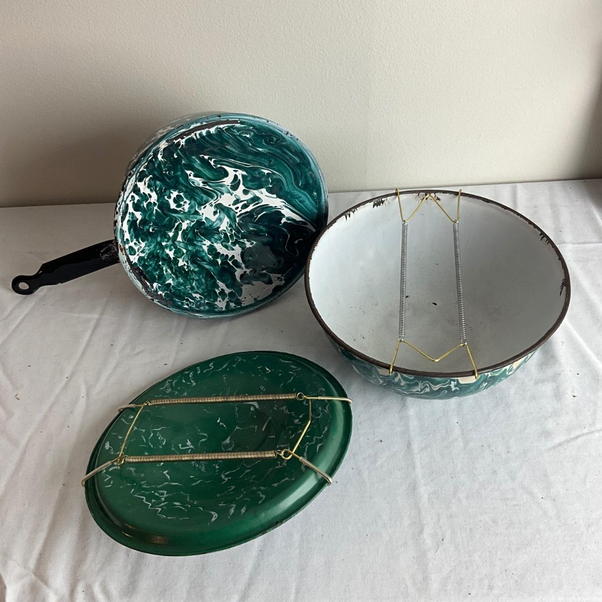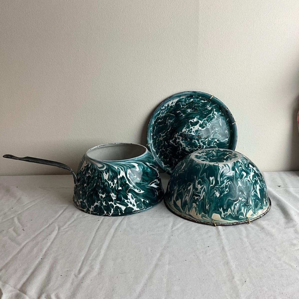 D1001 Antique 3pc Crysolite Green Swirl Bowl, Pot, and Lid Graniteware