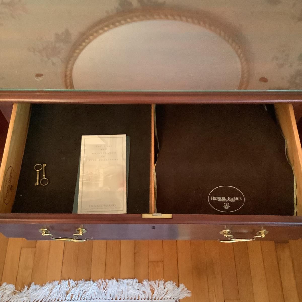 Beautiful condition Henkel Harris Cherry Sideboard. With 2 felt lined drawers and 2 doors , with brass knobs , pulls and glass top