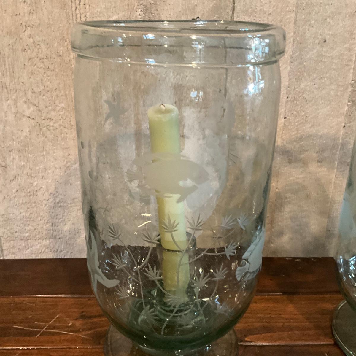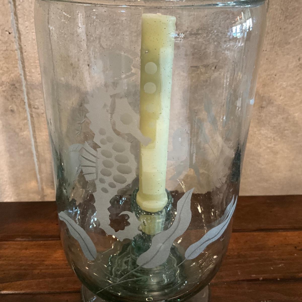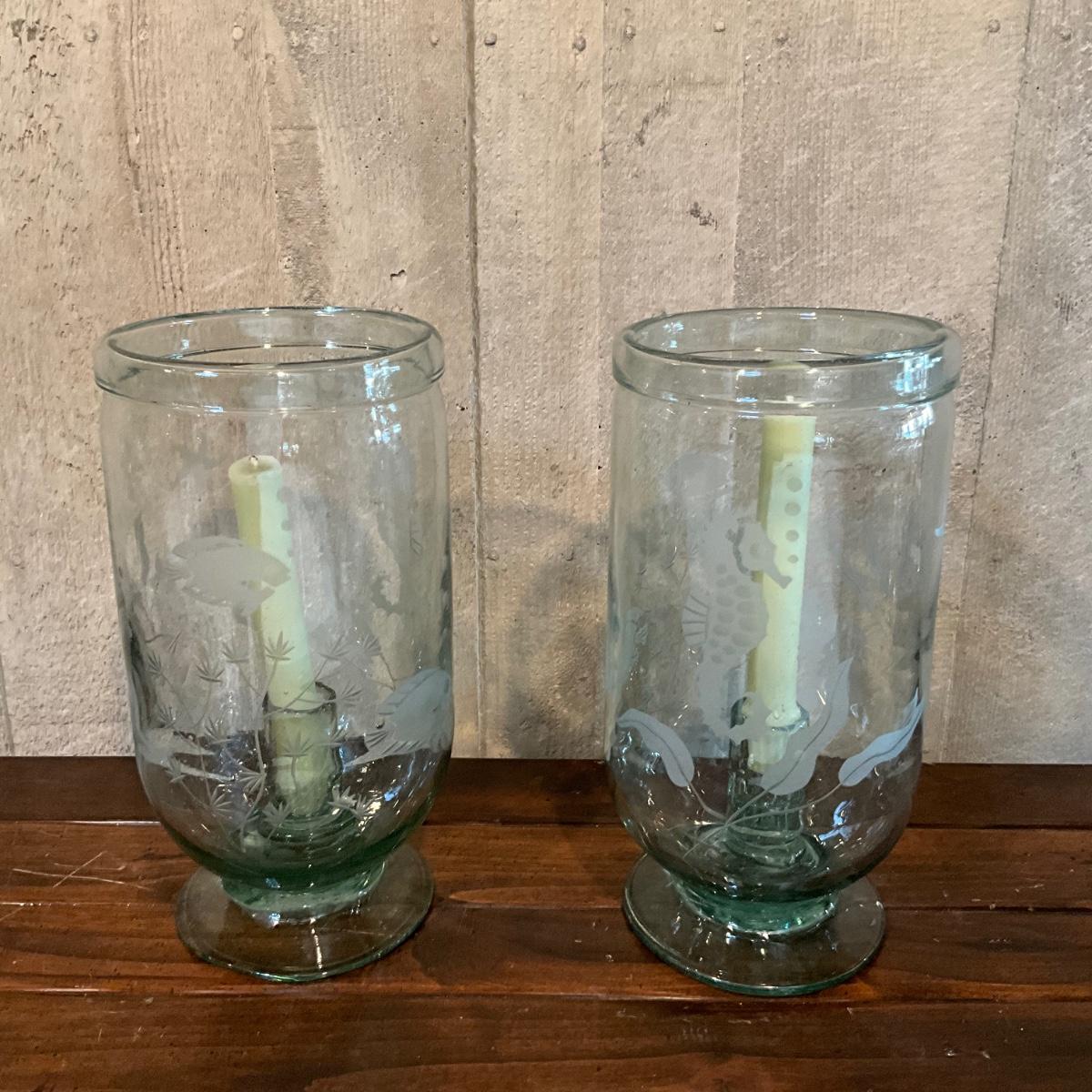 D1022 Pair of Etched Seahorse Nautical Hurricane Vases with Candles
