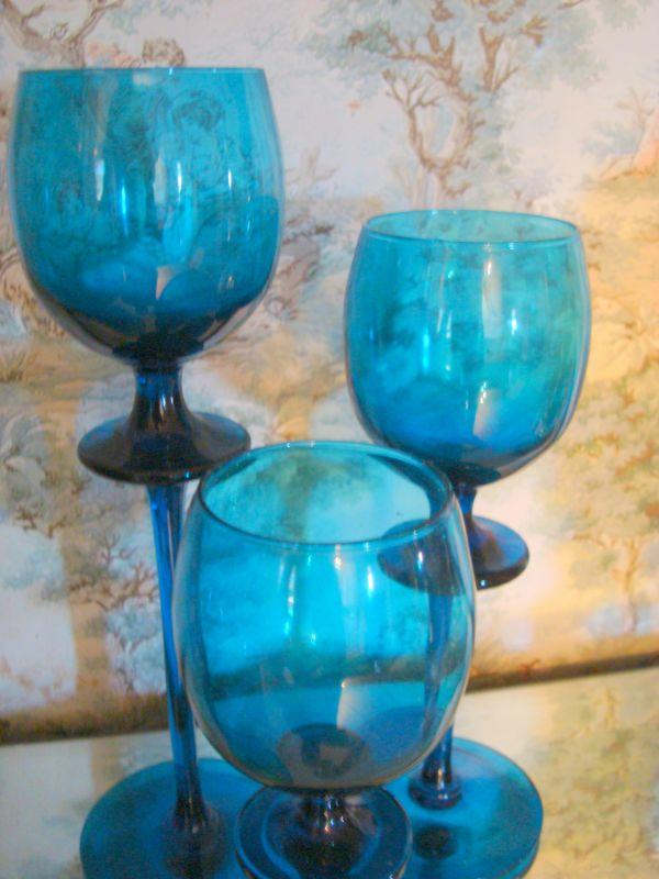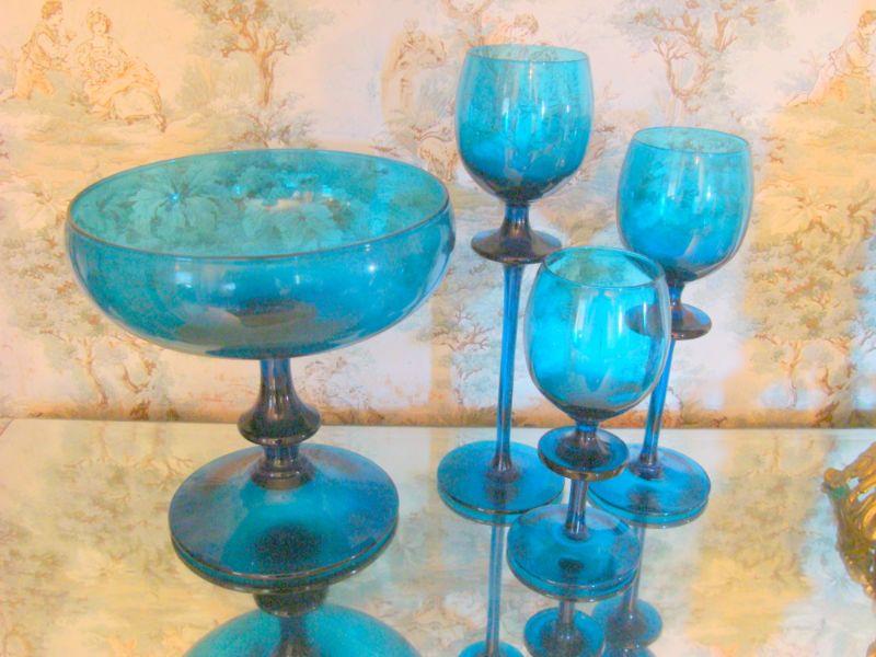 Set of blue dishes - I believe the tall stem items are candle votive and the large mouth dish might be a trinket bowl