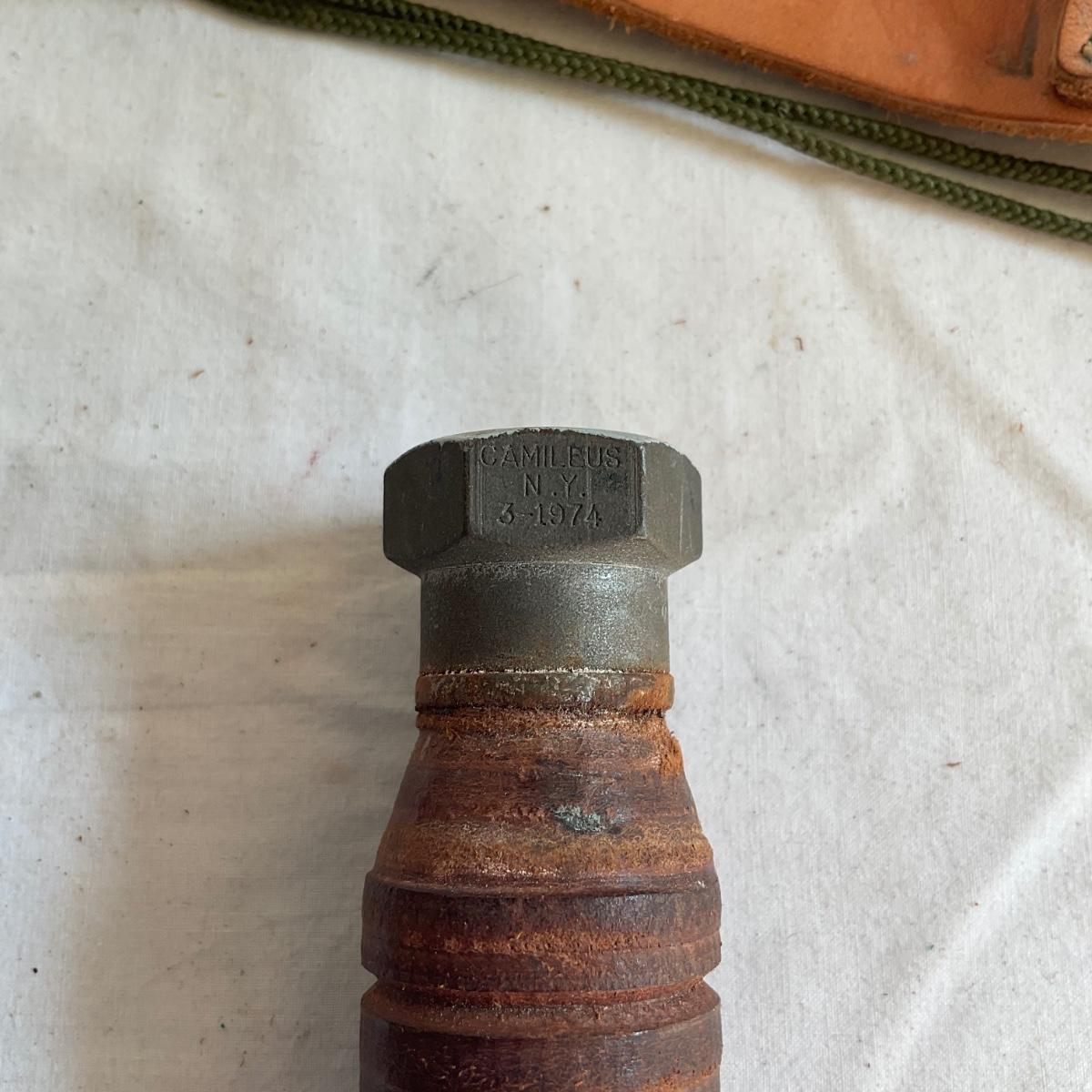 full tang measuring 9.5” long and sheath is leather with sharpening block