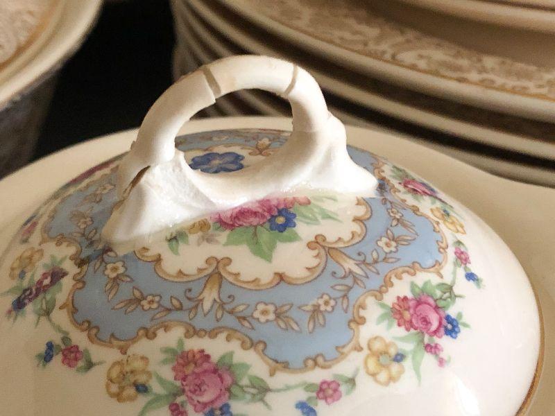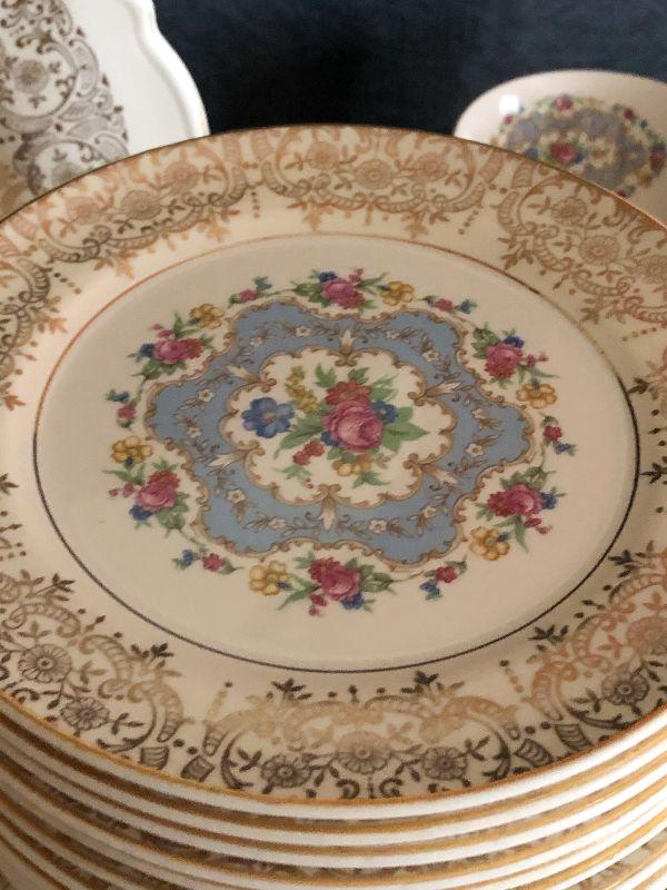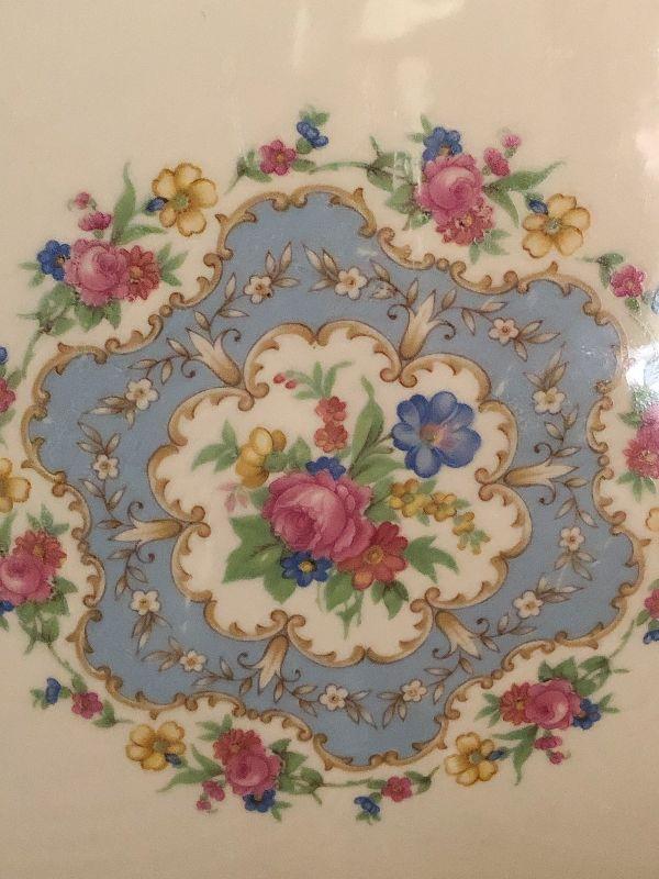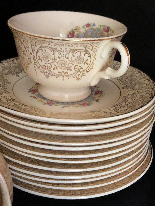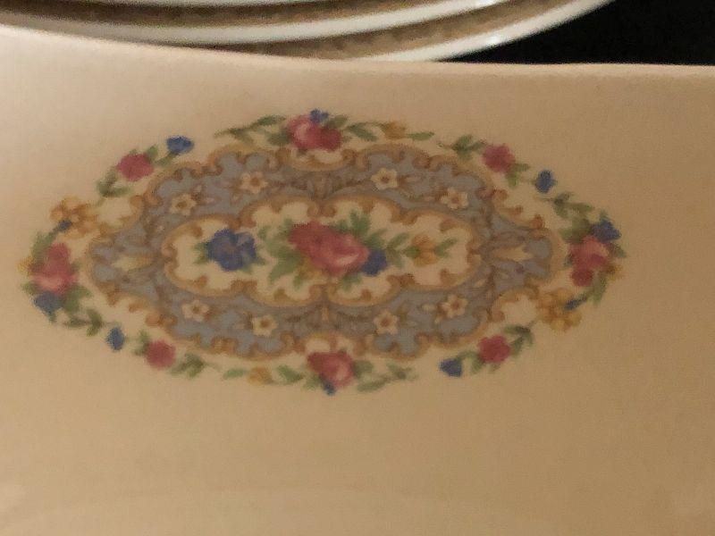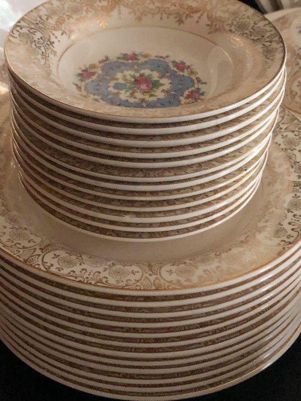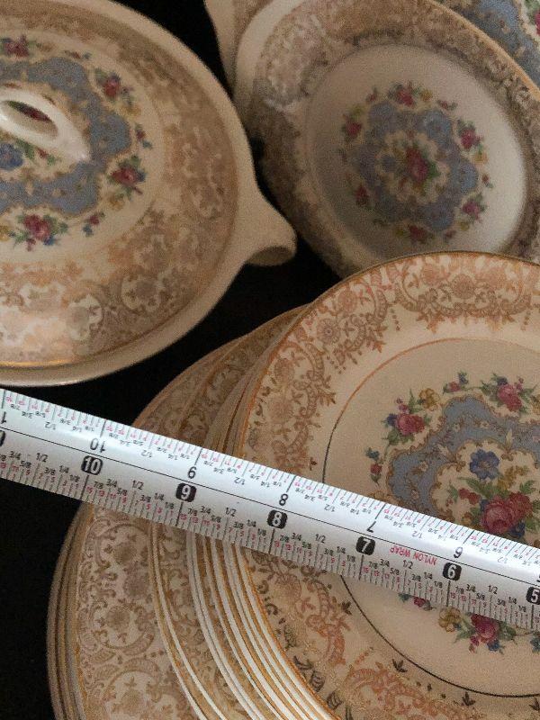 This is a beautiful set of Royal Limoges settings and serving pieces. 22k Gold gilded trim with pink and blue florals. Please see all pics for condition and what is included in the serving pieces. Large platters and serving pieces for entertaining and more! Some items do show wear, but most are in excellent pre-owned condition. Gorgeous set!