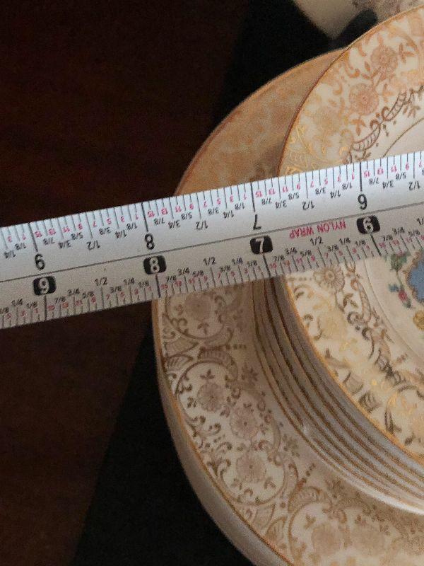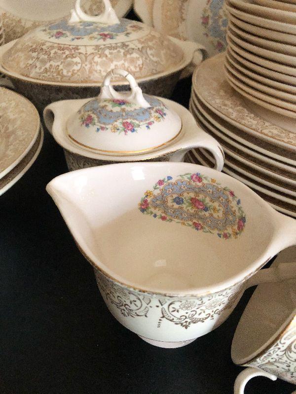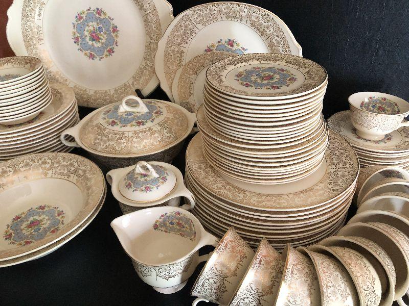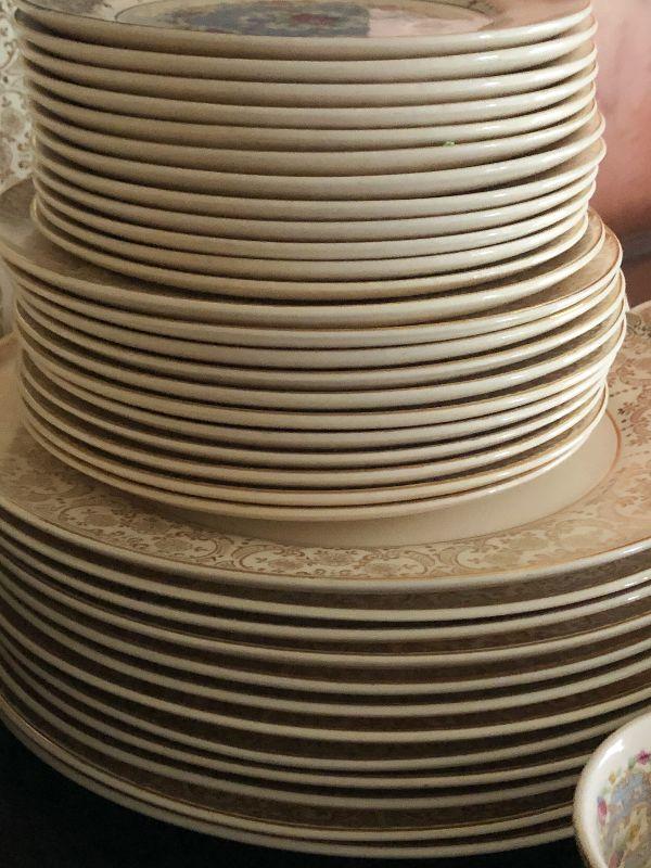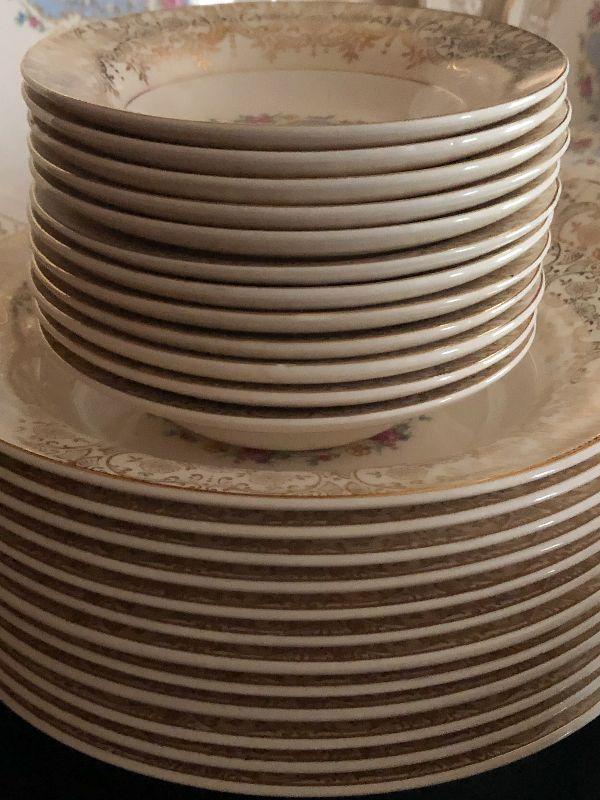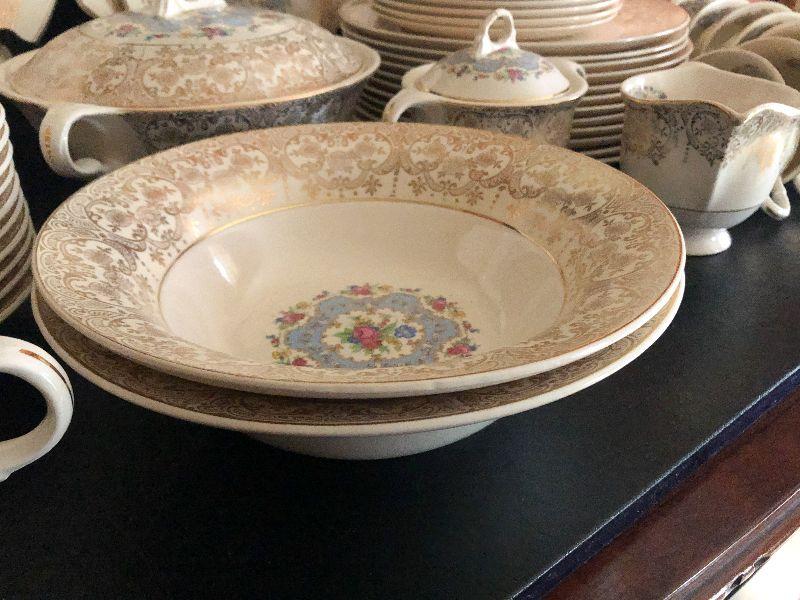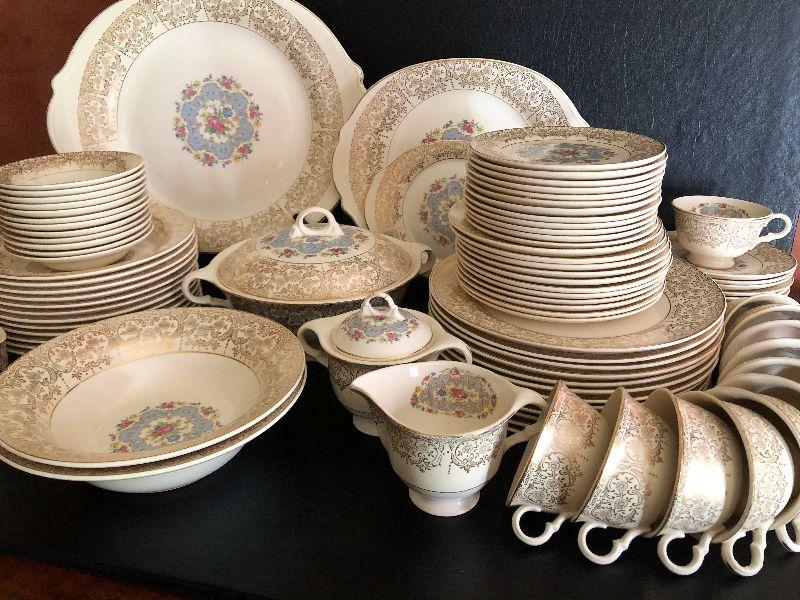 This is a beautiful set of Royal Limoges settings and serving pieces. 22k Gold gilded trim with pink and blue florals. Please see all pics for condition and what is included in the serving pieces. Large platters and serving pieces for entertaining and more! Some items do show wear, but most are in excellent pre-owned condition. Gorgeous set!