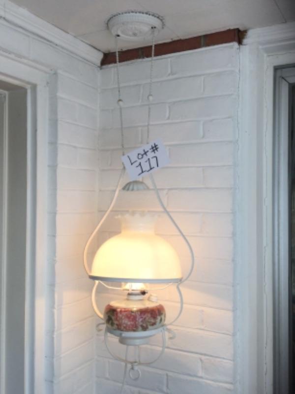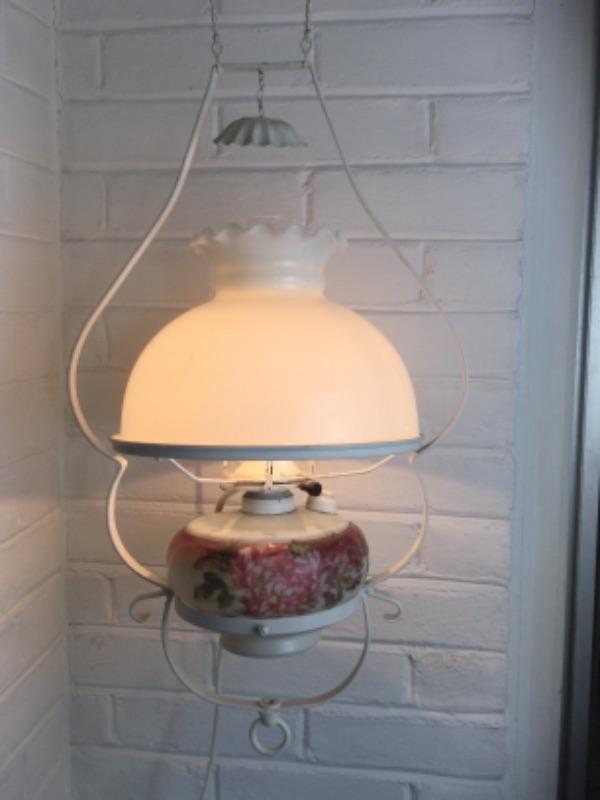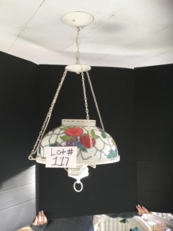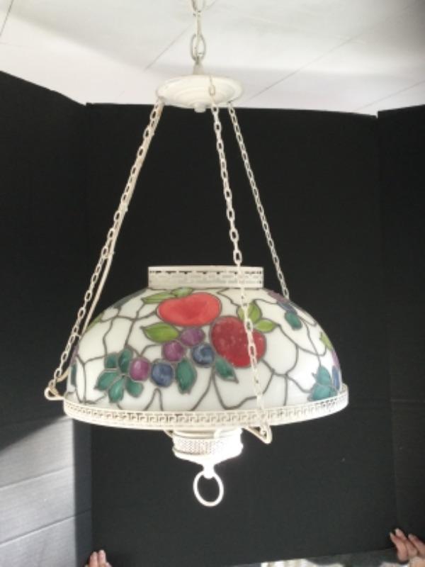 Glass Tiffany style hanging lamp 29” long and 16” wide. Oil lamp converted into electric 28” long and 13” wide