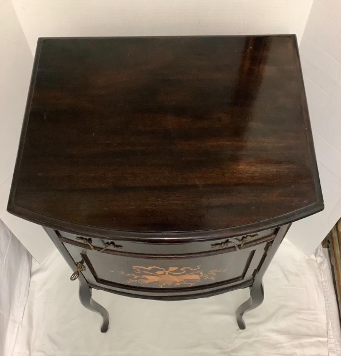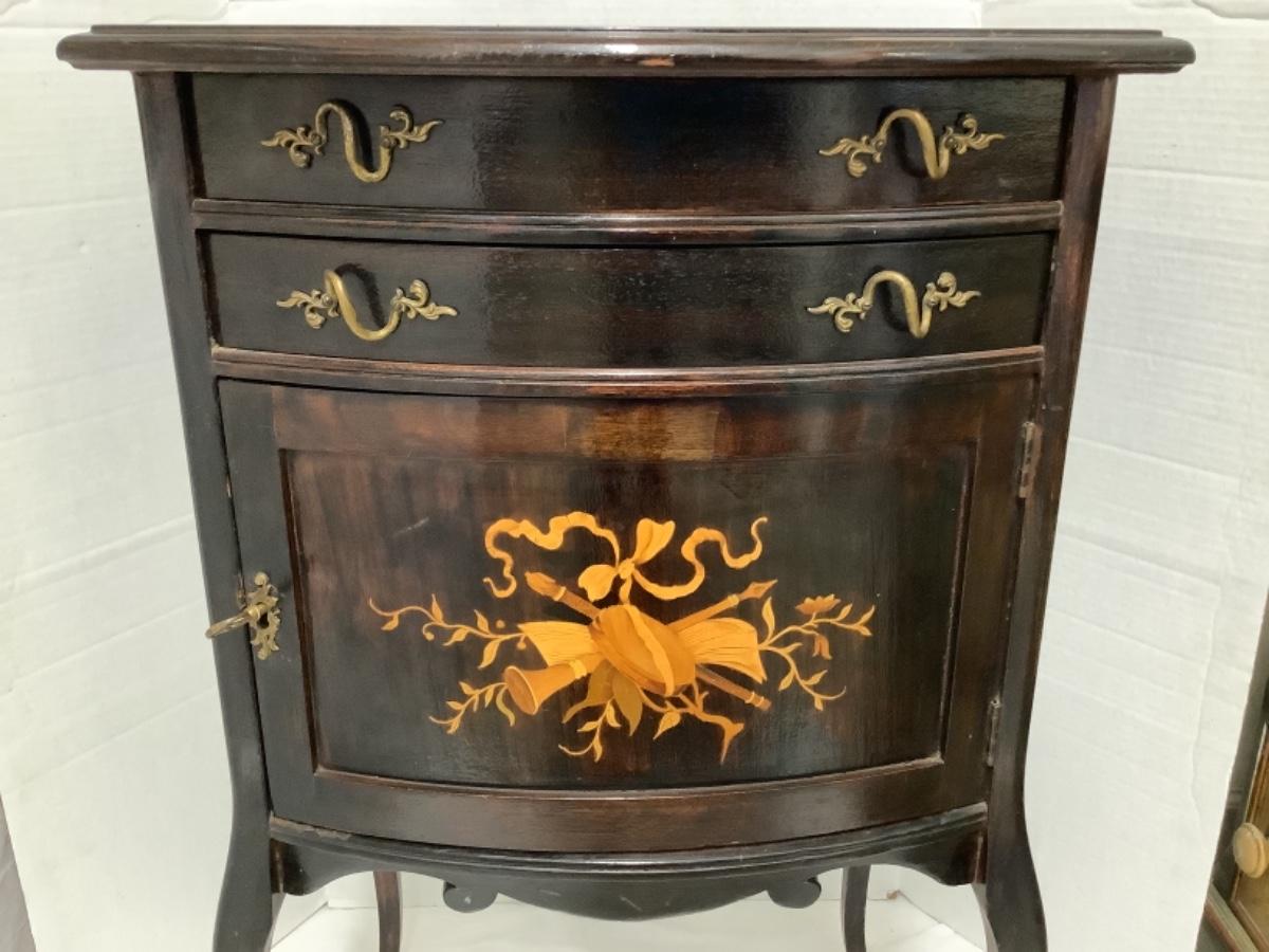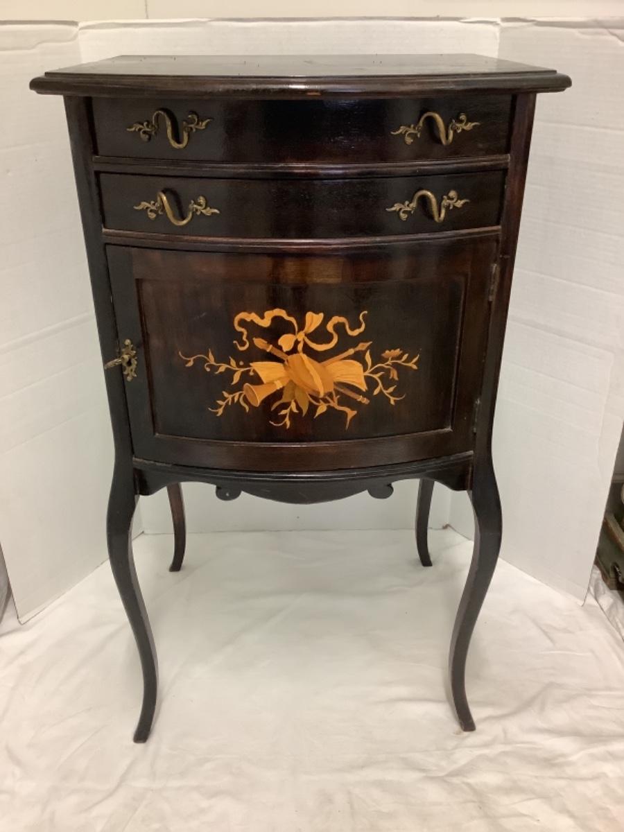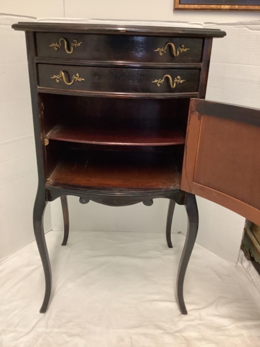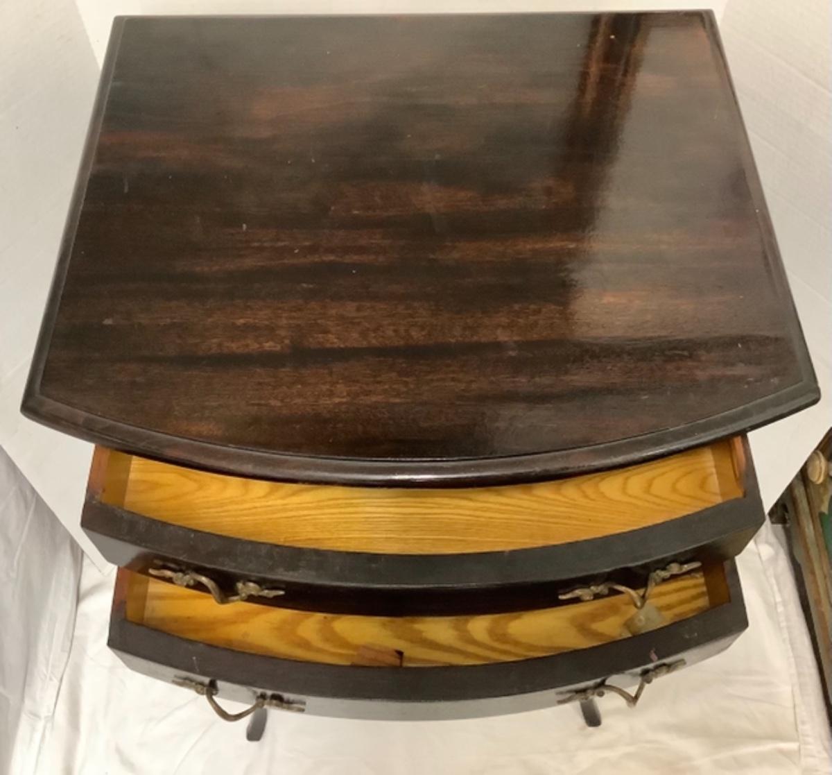 J. Horner Furniture Co. vintage bow front stand with two drawers and cabinet that locks, key included, brass drawer pulls, has a small chip on front top (see photos), measures 34-1/2” high 20” wide and 17-1/2” deep