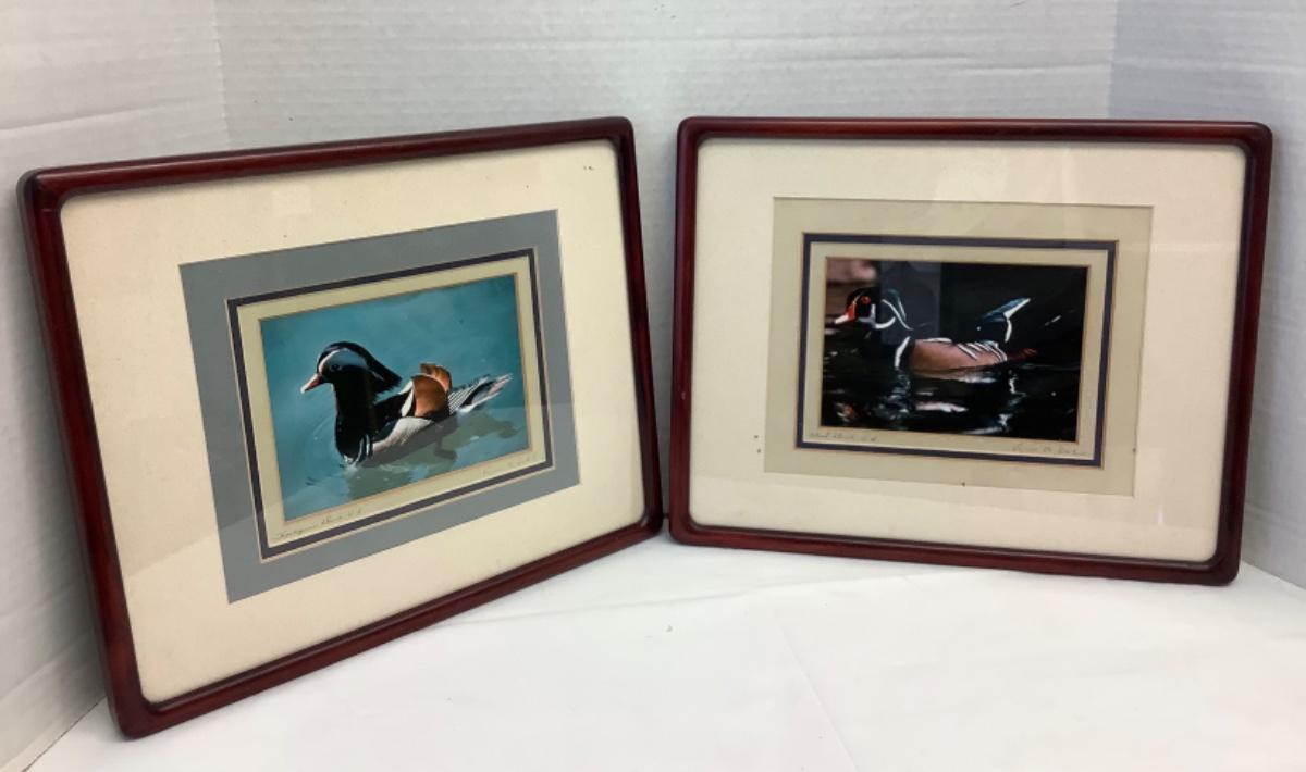D1182 Two Signed Framed Harlequin Duck and Wood Duck Photographs