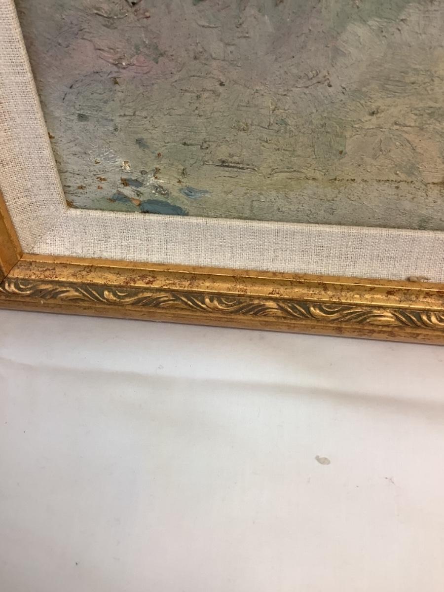 Painting has some damage (see photos), frame measures 20” x 23-1/2”
