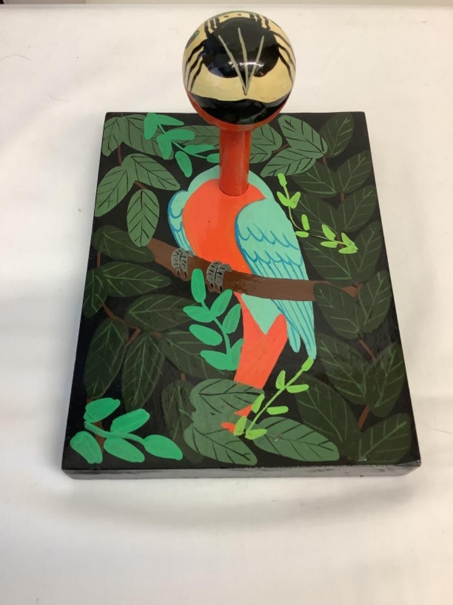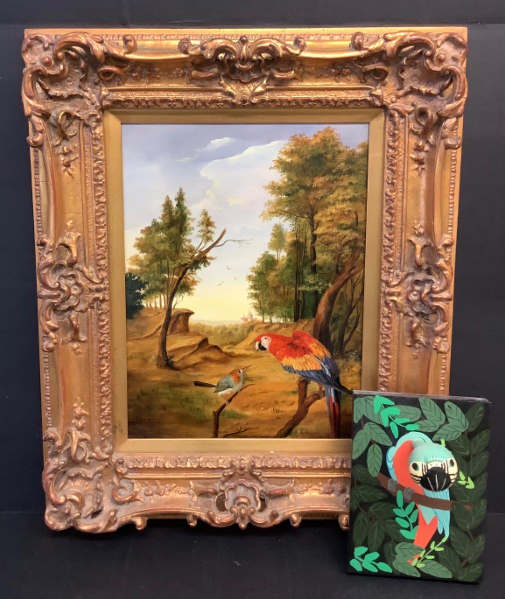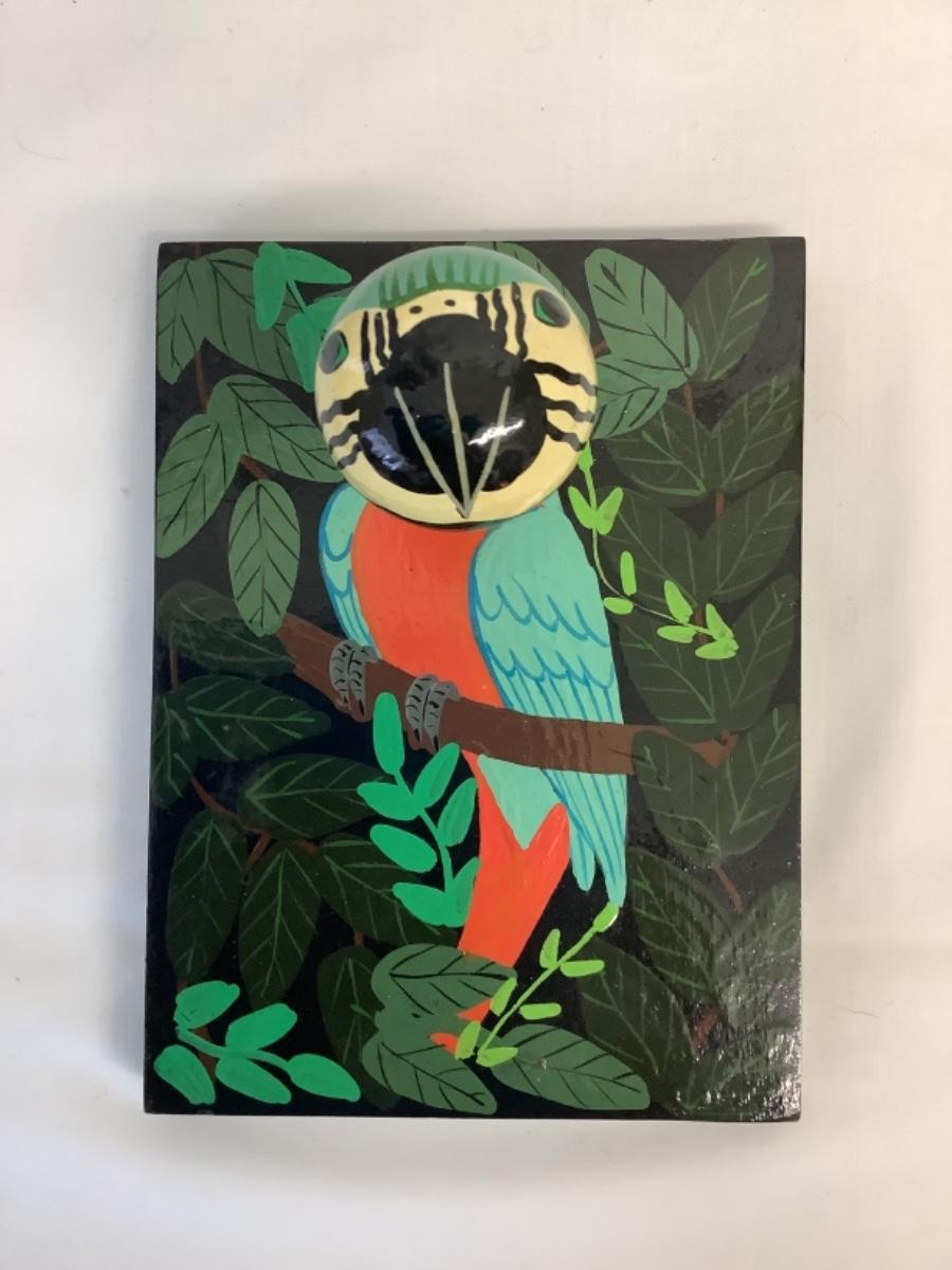 Framed parrot still life measures 20” x 23”, Small 3D parrot wall hanging measures 8” x 6”