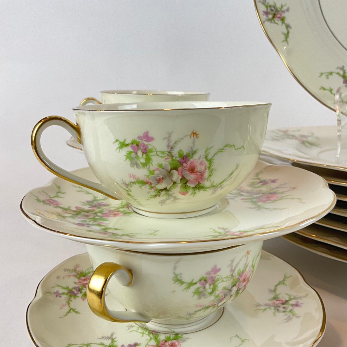 8 dinner plates, 7 salad plates, 7 bread and butter plates, 8 cups and saucers