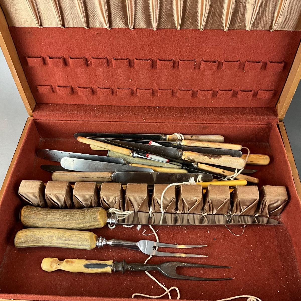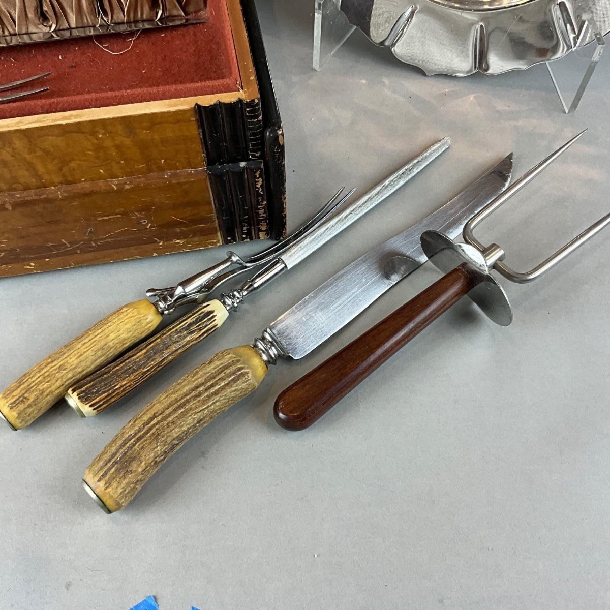 D1423 Lot of Antique Bone Handled Knives with Art Deco Box and Carving Tray and Knife Set
