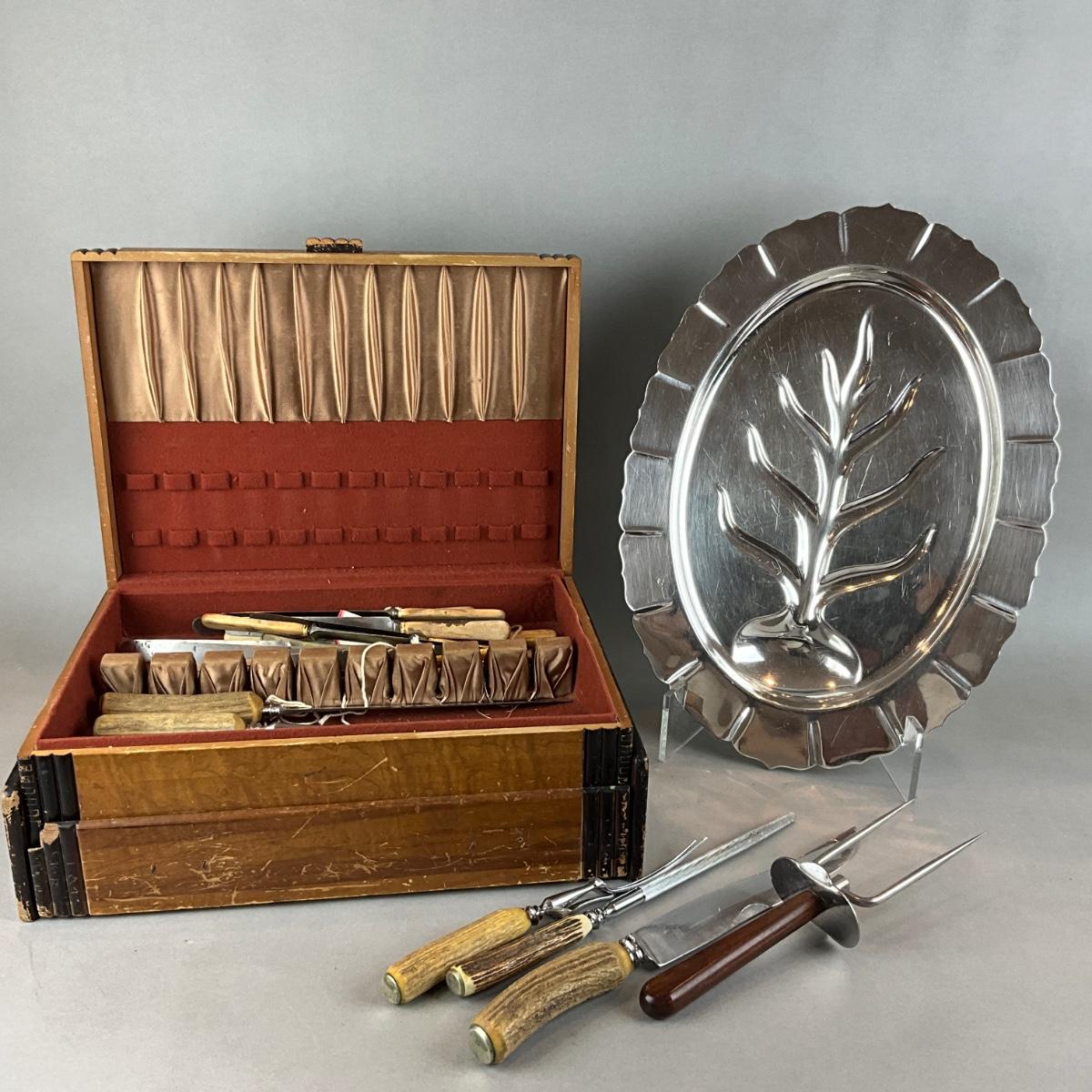 Antique art deco style flatware box with silverplate carving tray and horn handled carving knife set