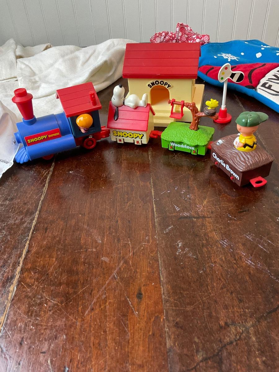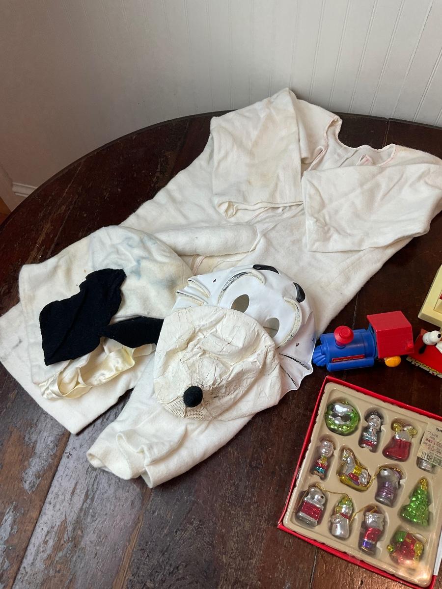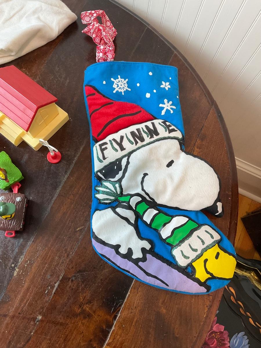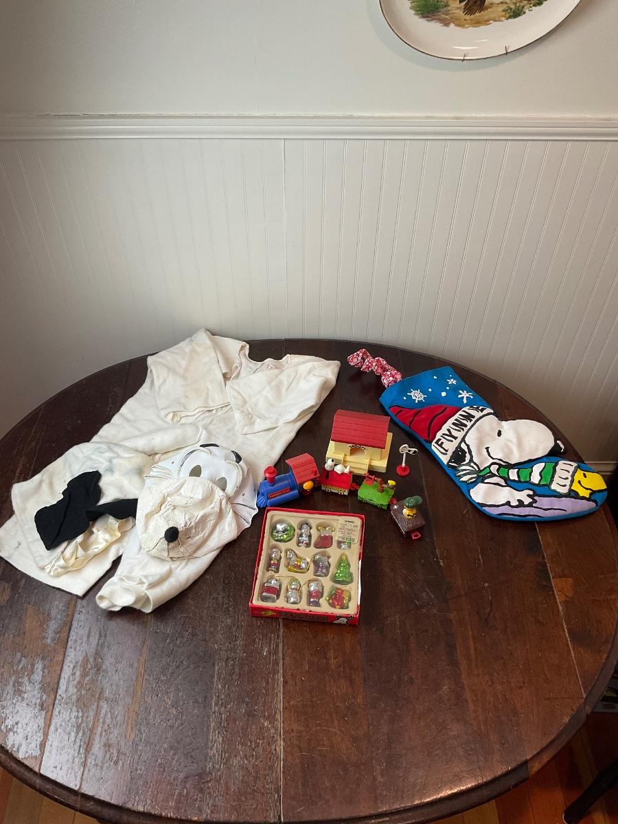 Snoopy costume, snoopy train with station, ornaments, stocking.