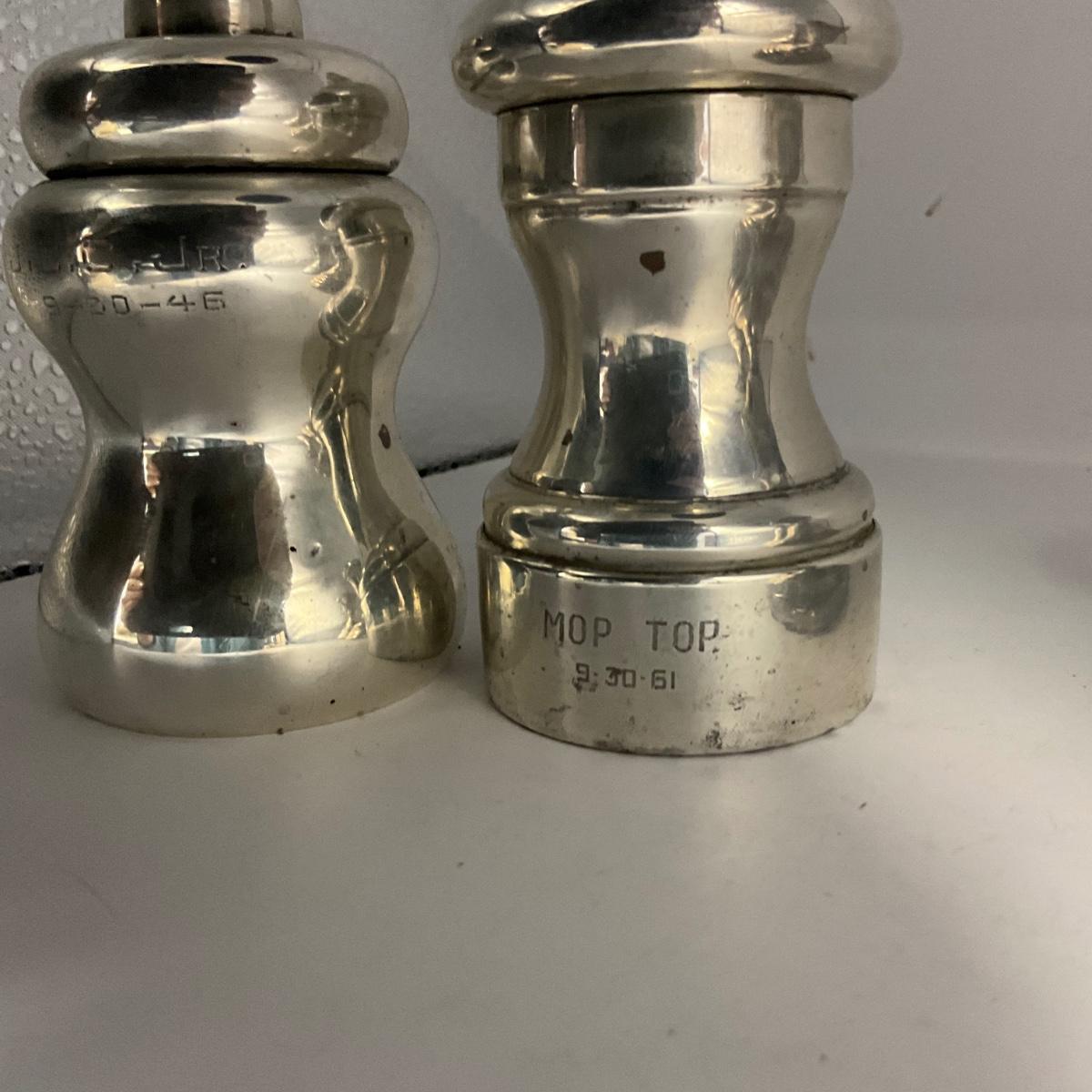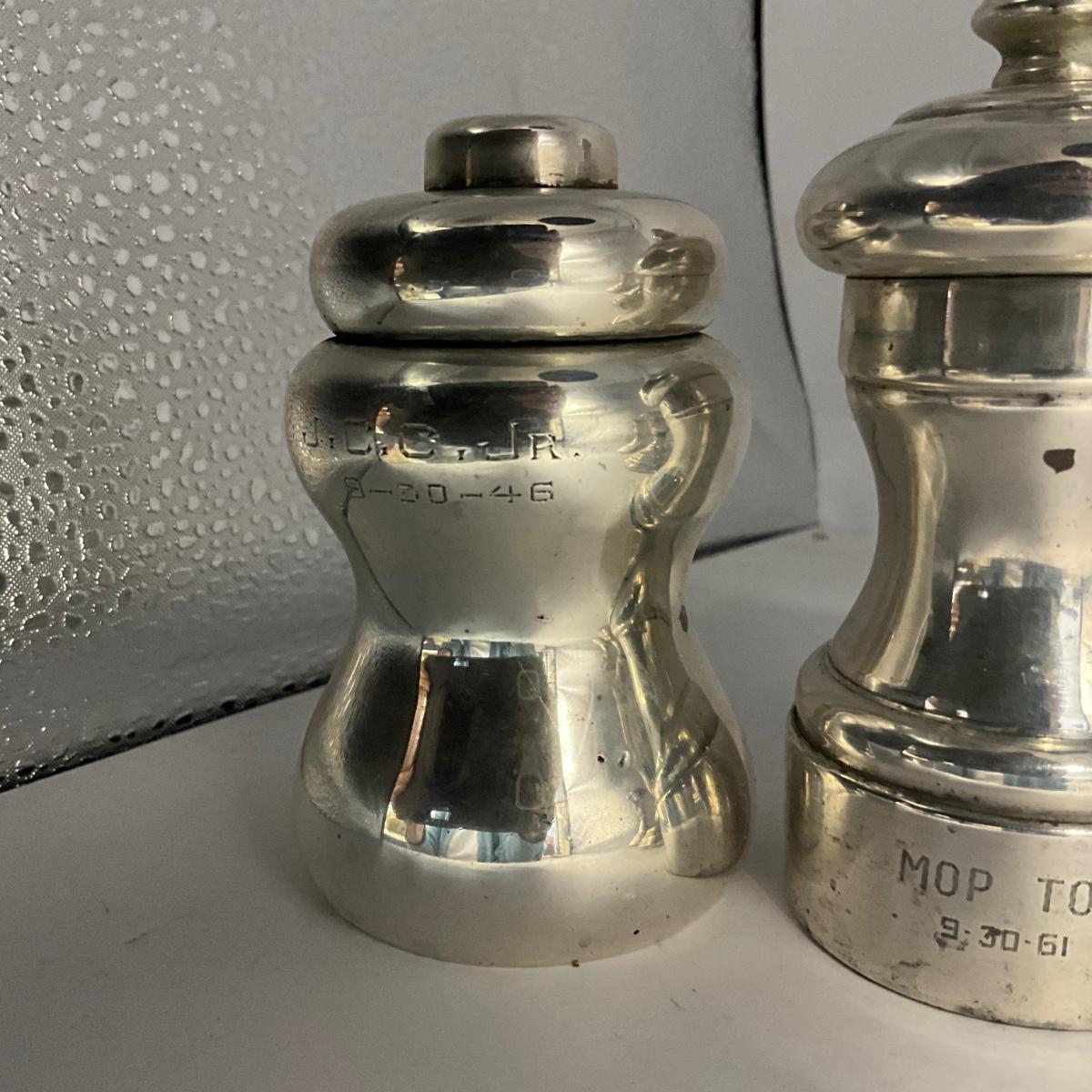Salt and pepper grinders have monograms and are 3.5" high and 4" high