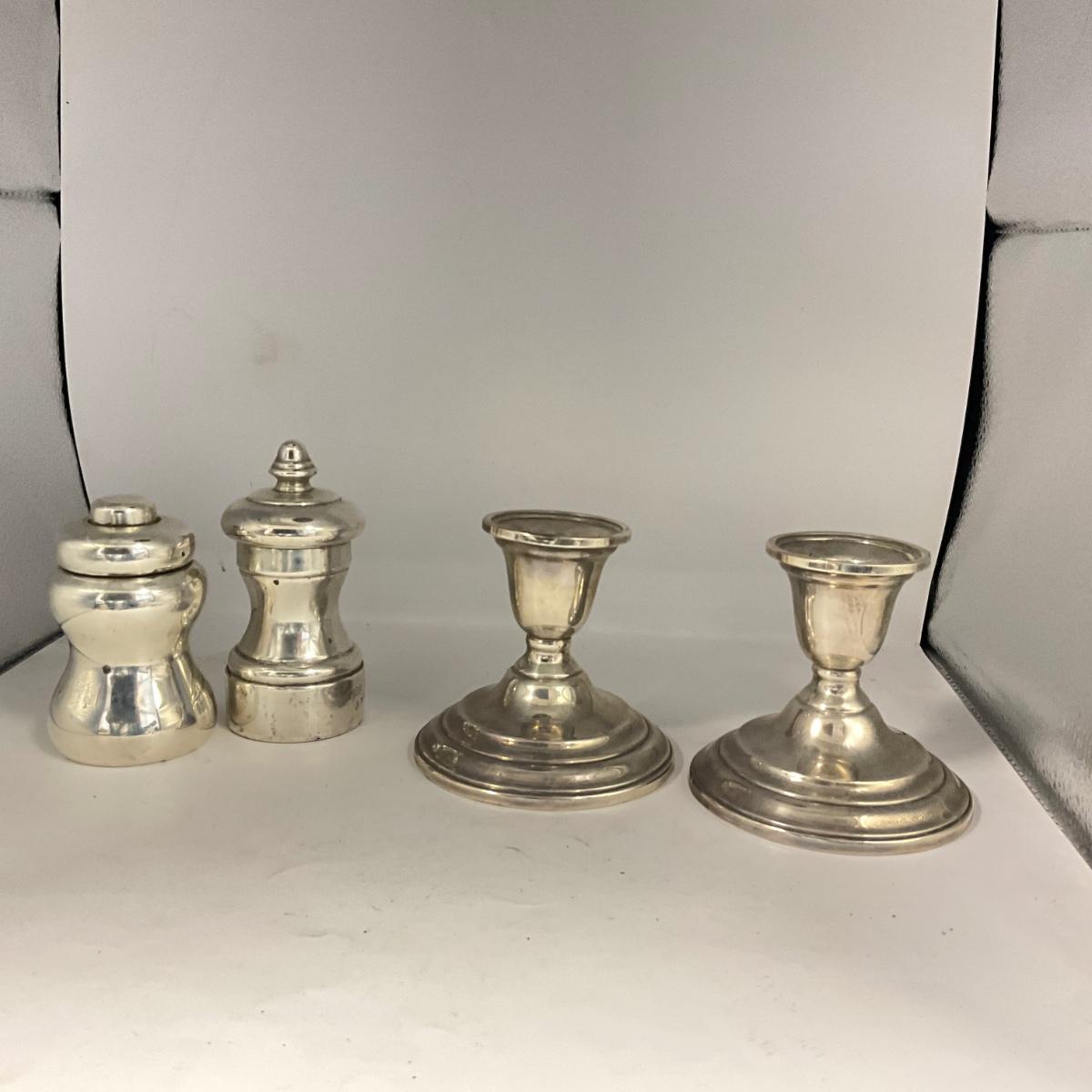 D1568 Pair of Weighted Sterling Silver Candlesticks & Salt Pepper Grinders
