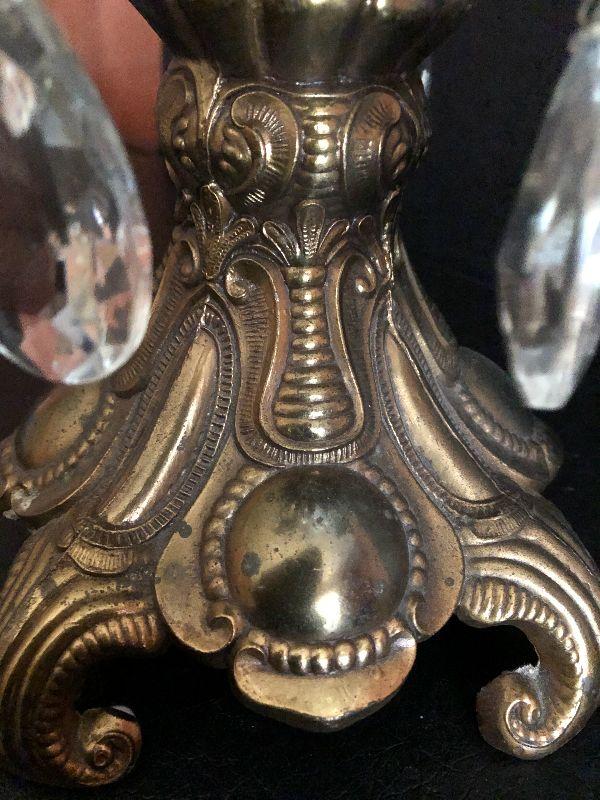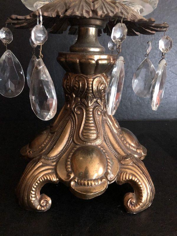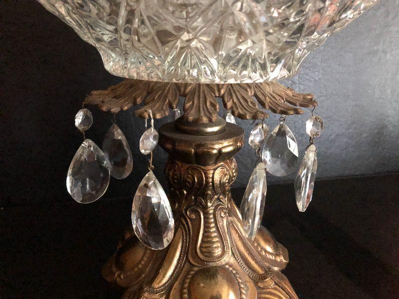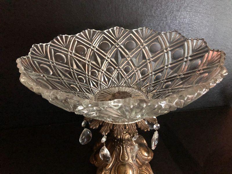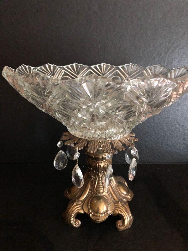 This cut glass centerpiece is on a brass stand and adorned with hanging prisms. Perfect for a centerpiece, or fruit compote! Please see pics for sizing and condition. The matching candlesticks are in a separate listing and look stunning as a set! Bid on both for the perfect dining table setting!