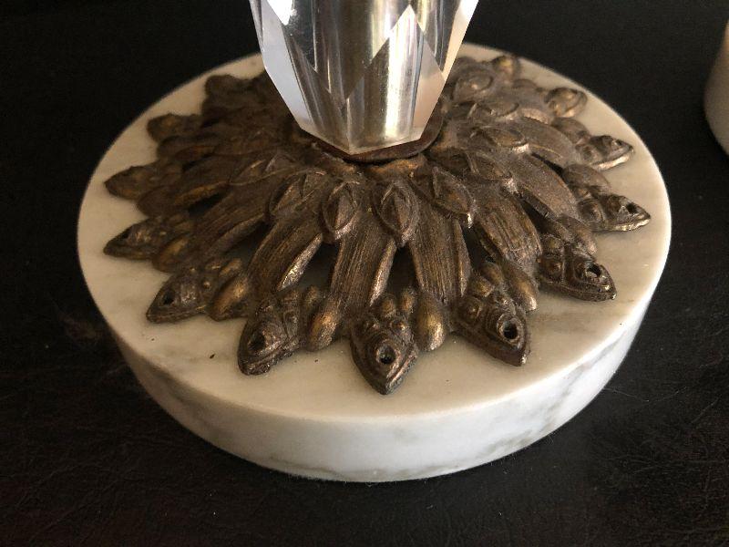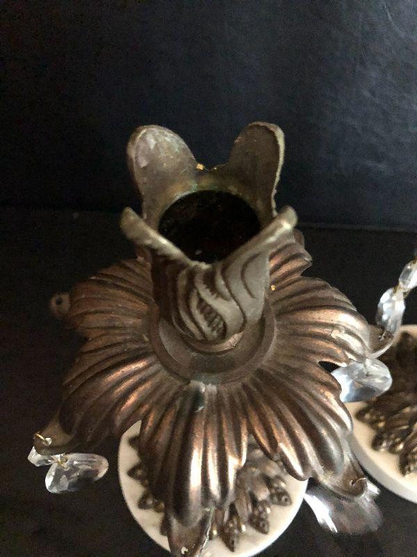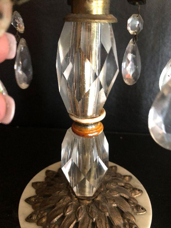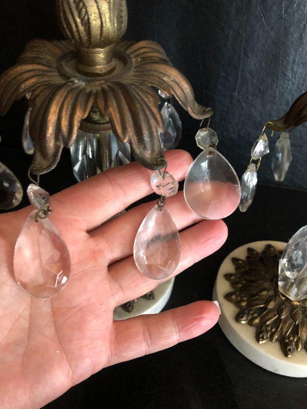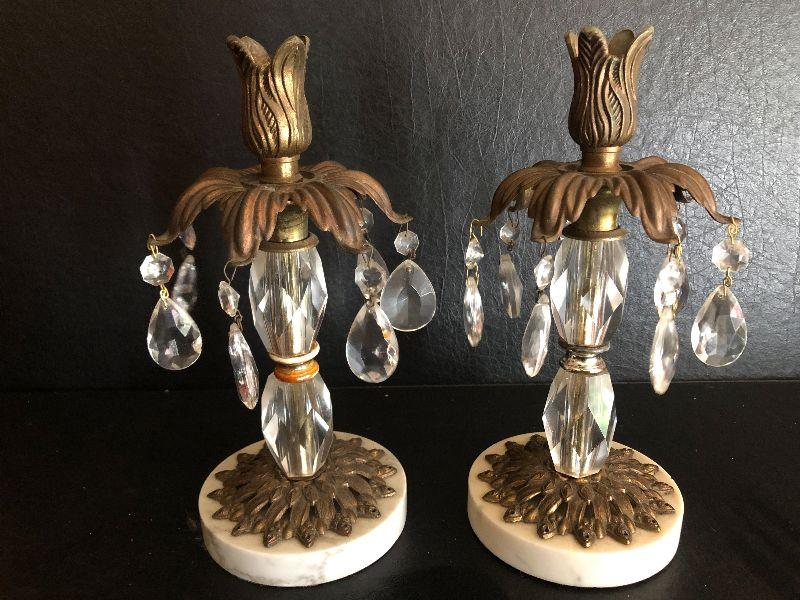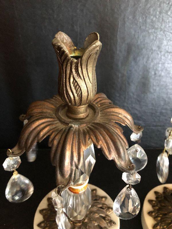 Set of ornate marble and brass candlesticks with crystal drops. These lovely candlesticks match a centerpiece in a separate listing. Perfect alone or as a set! Measuring at around 10 inches tall. Please see pics for sizing and condition on this unique set.