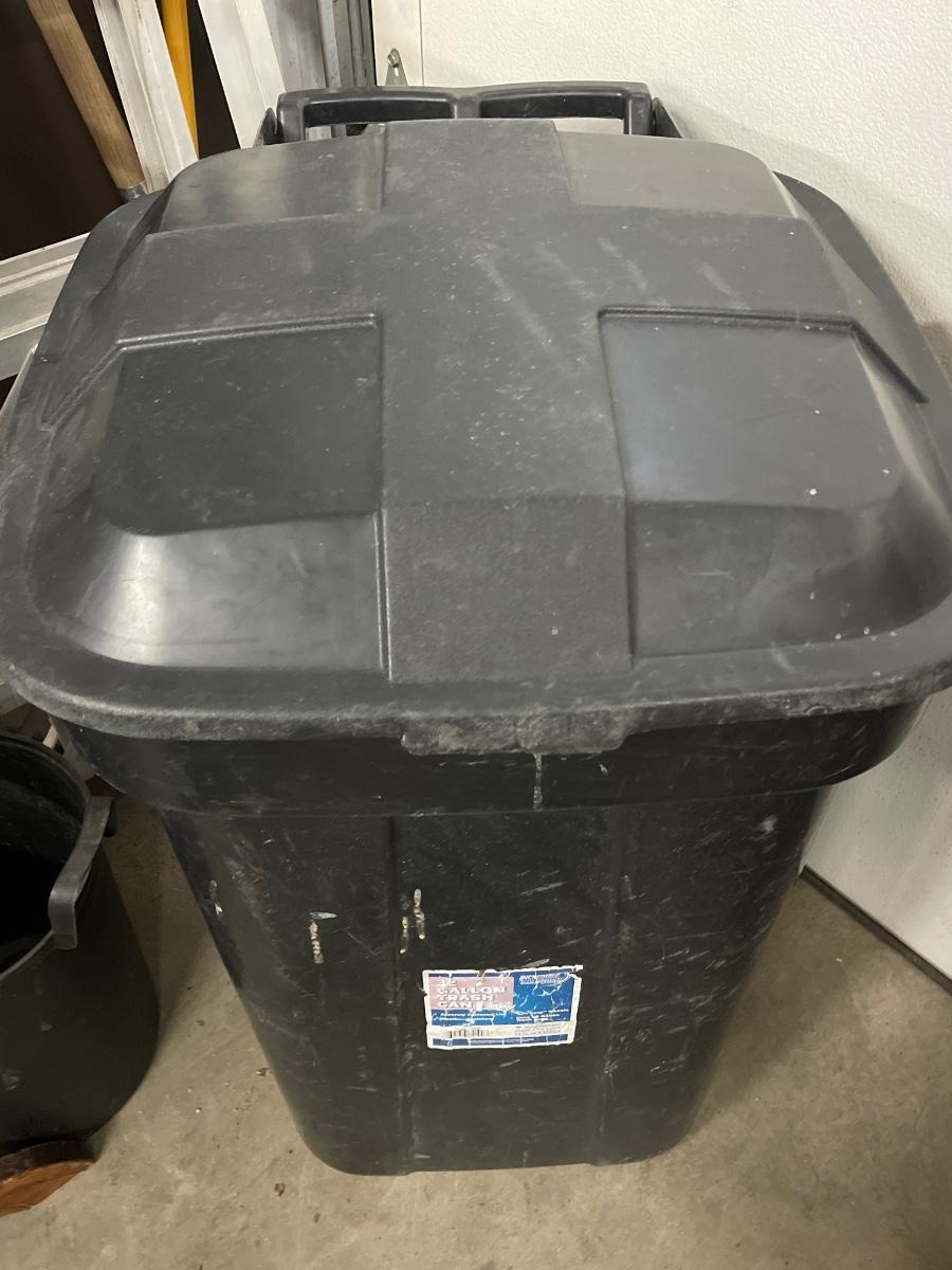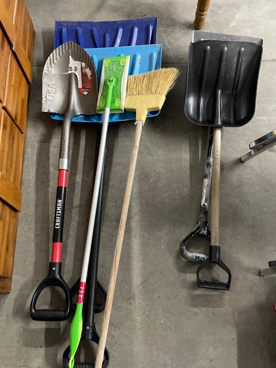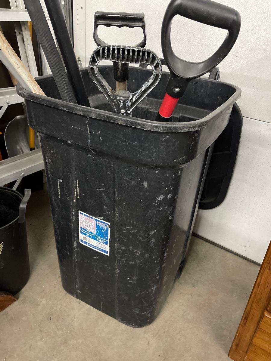 D21- Garbage can with attached lid and various yard tools/cleaning tools