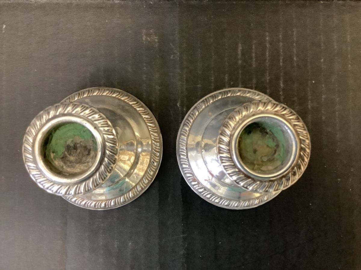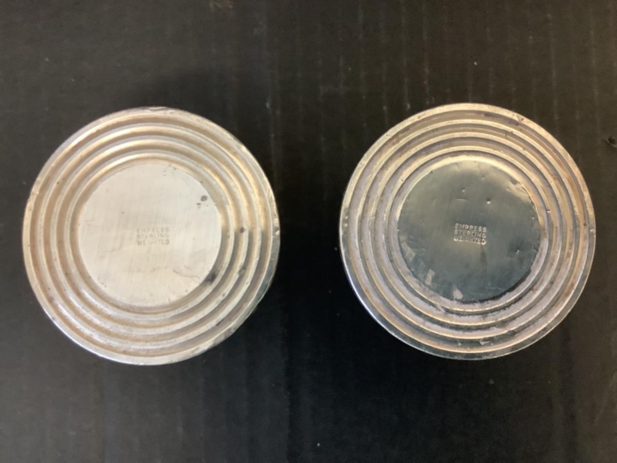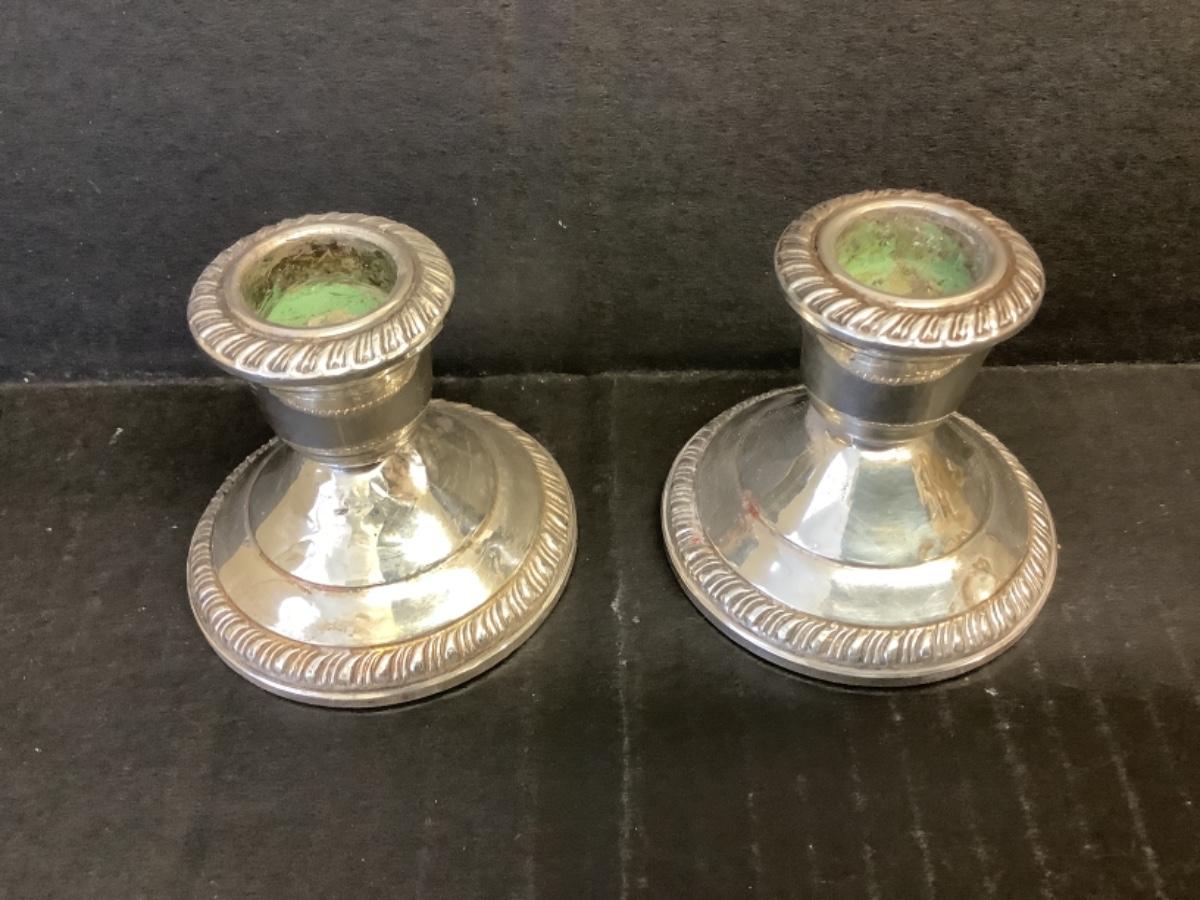 Pair of Empress Weighted Sterling Silver Candlesticks measuring 2-1/2” tall, both have a few dings in them