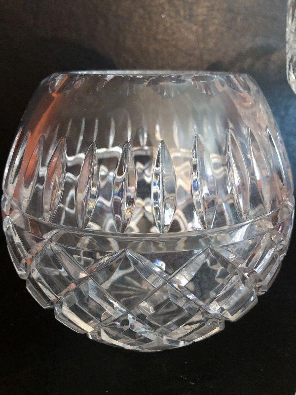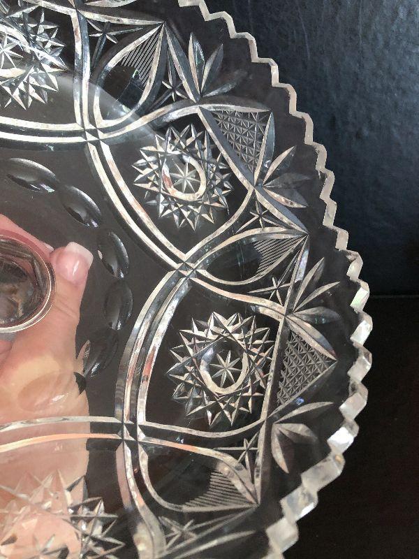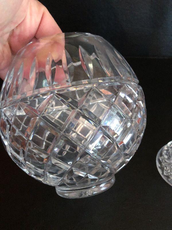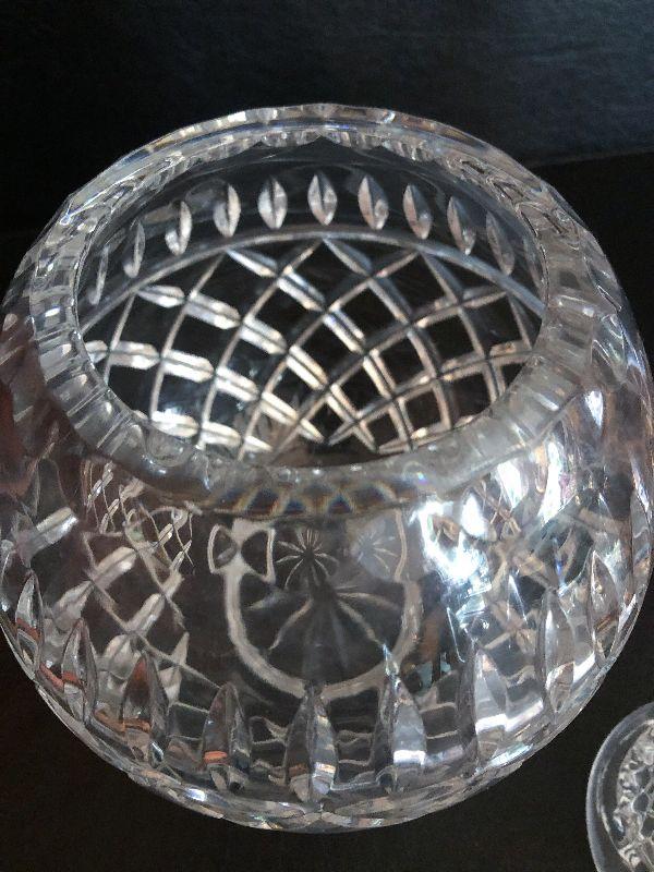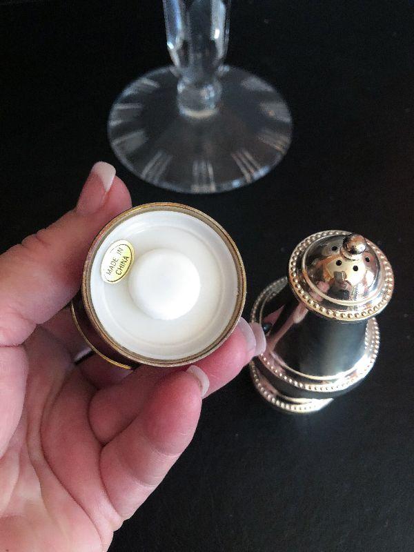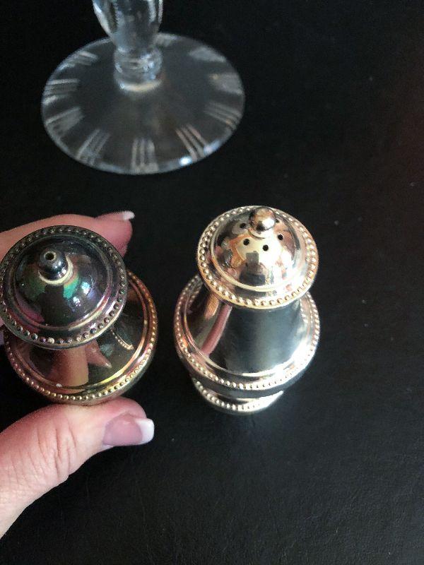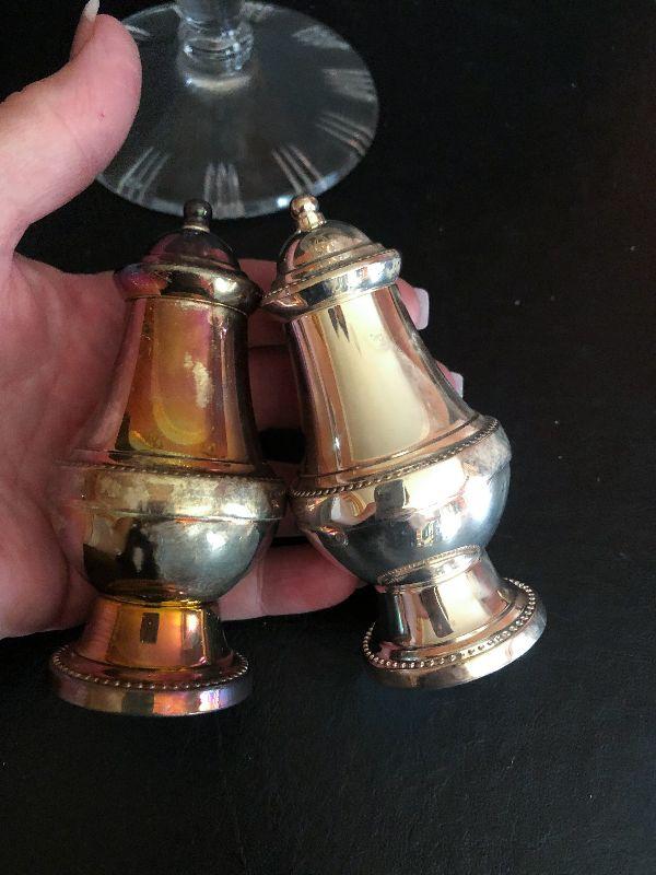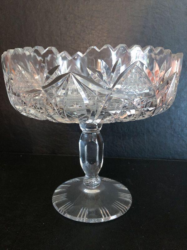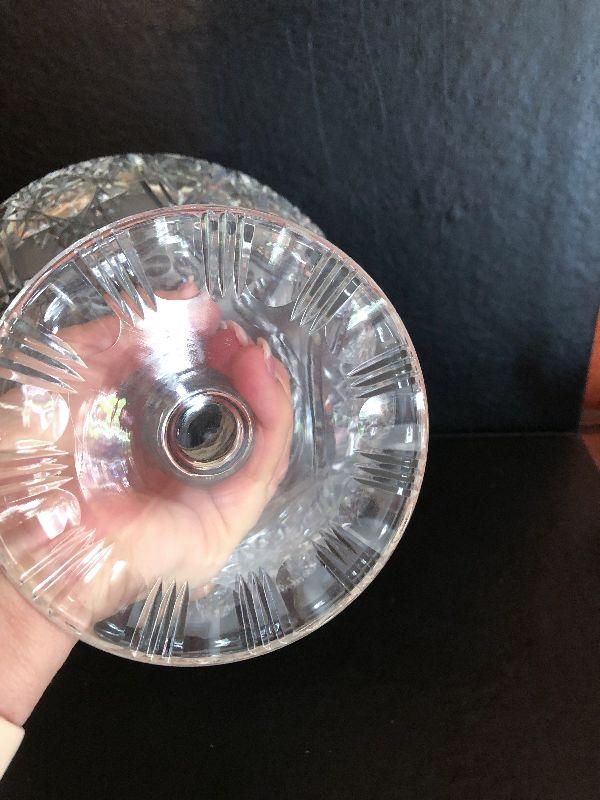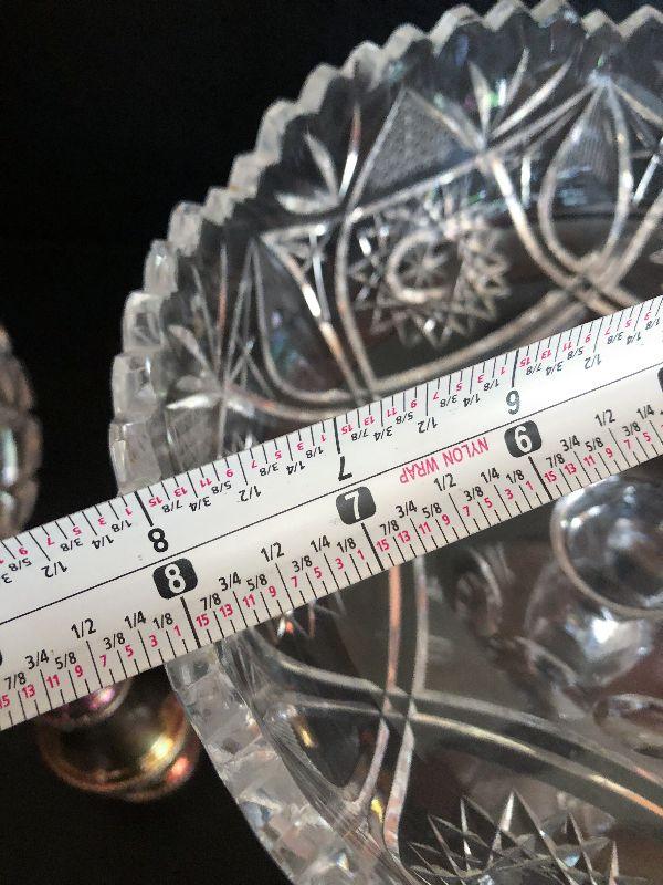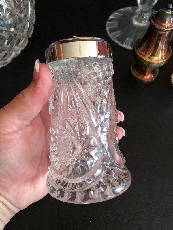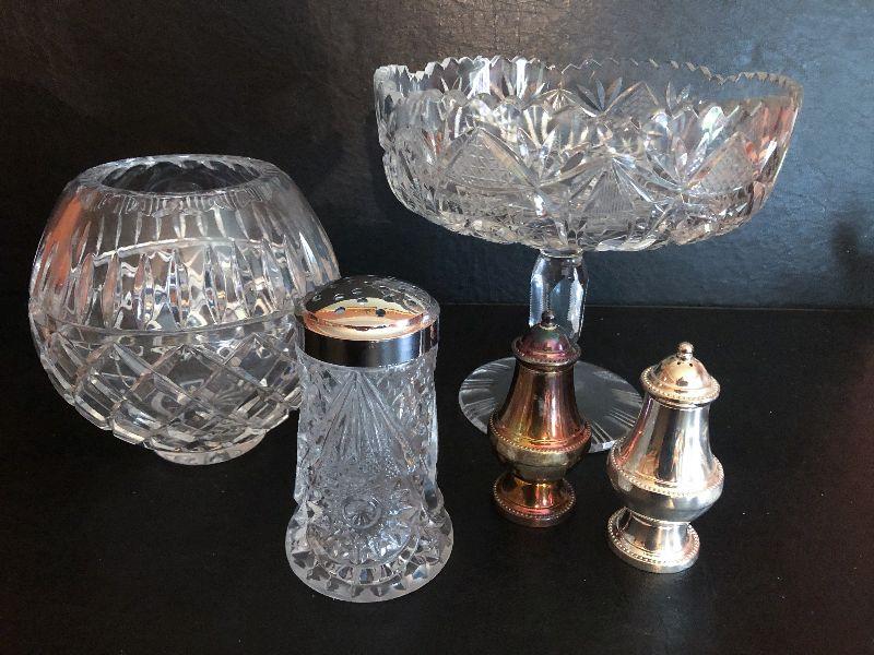 Crystal footed compote, crystal candy, silver plated footed salt and pepper, and a cut glass shaker. Please see pics for sizes and condition