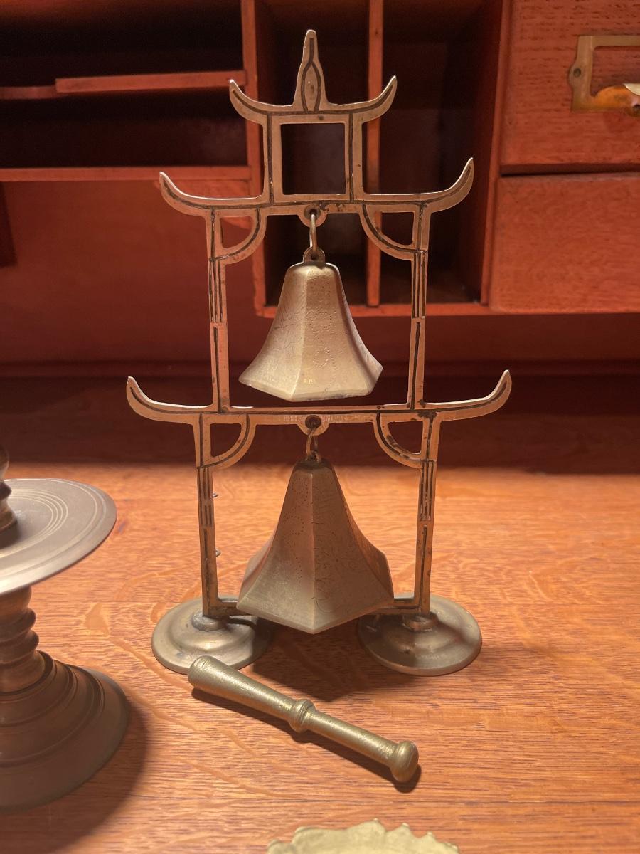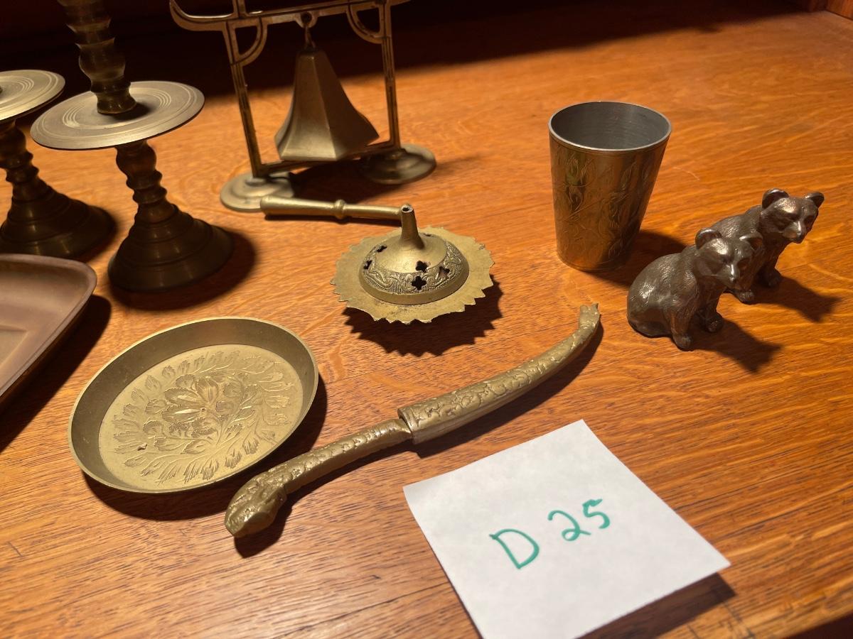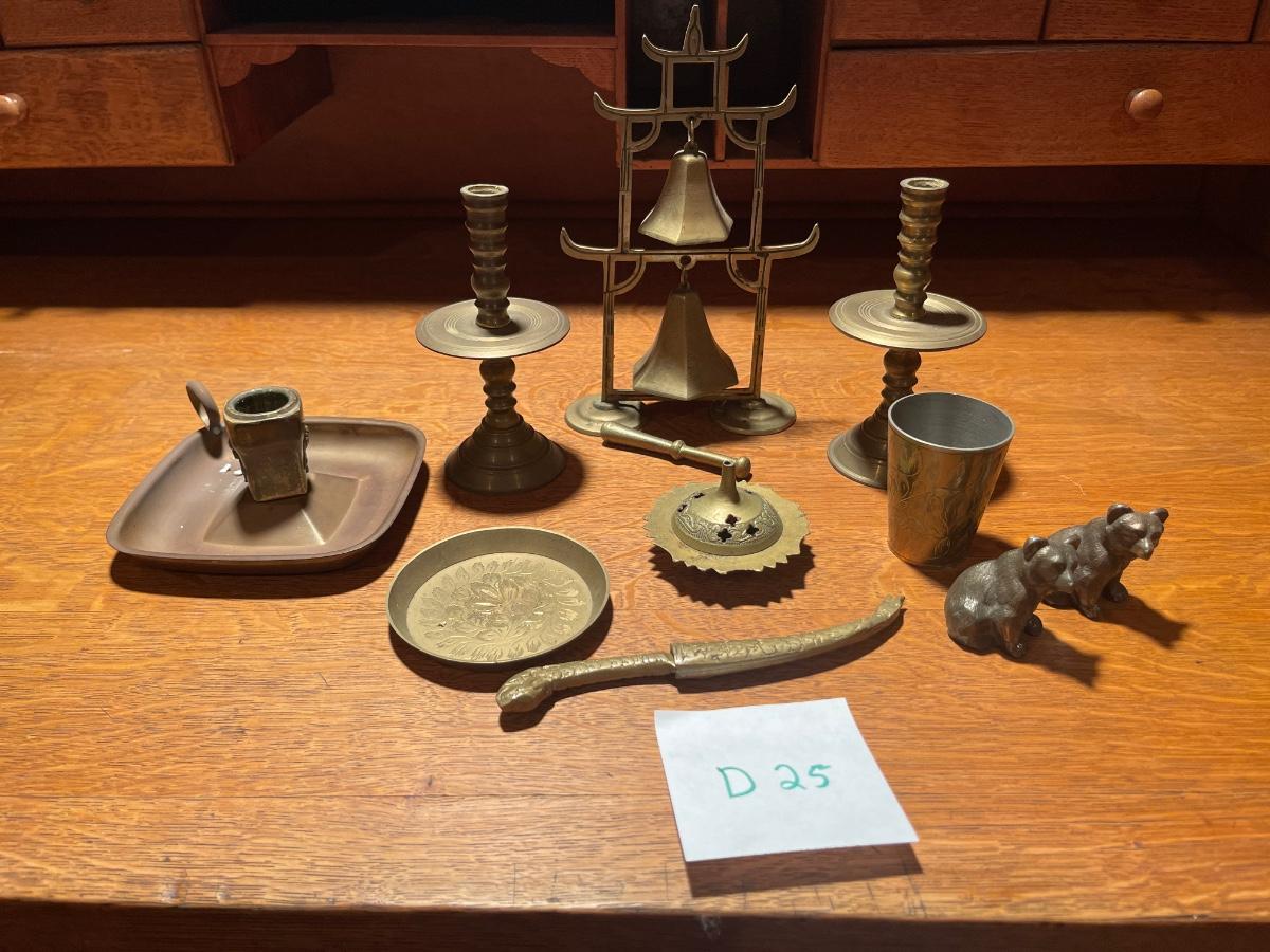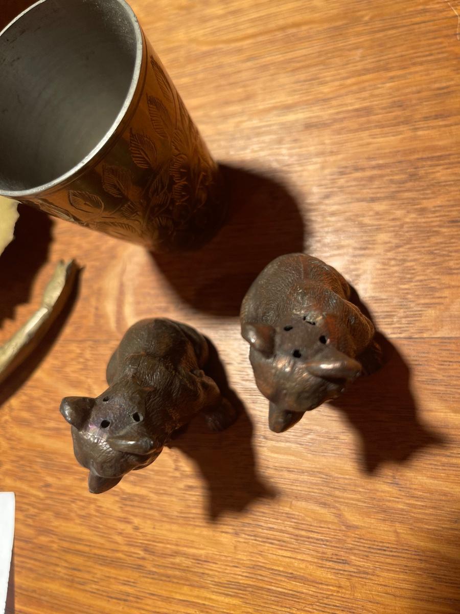 Bear salt and pepper shakers, brass items, candleholders, bell with mallet, etc.