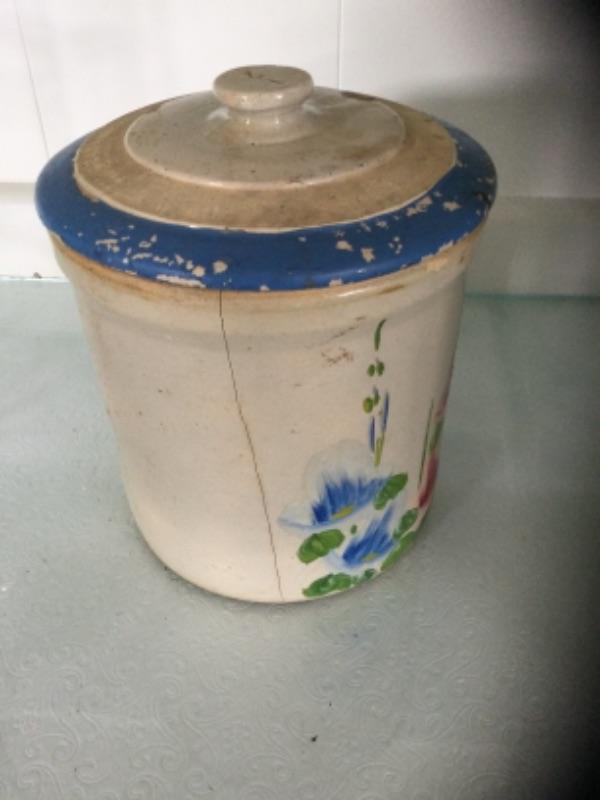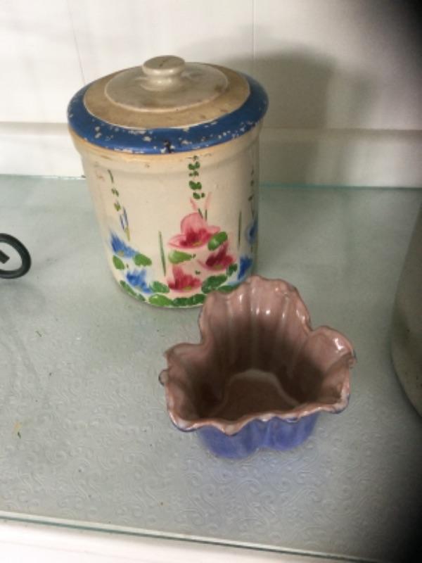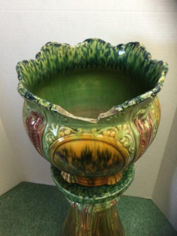 Majolica Jardinere with base, base 20” jardinere 10” tall and 10.5” round. Small Stangl pottery bowl. Large Salt Glazed crock. Small hand painted crock with lid, has a crack on side (see photos)