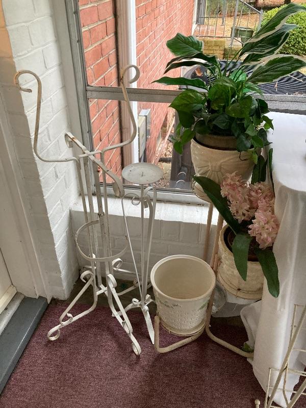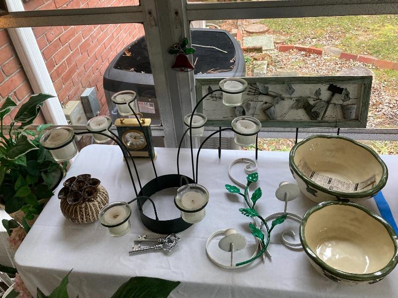 Pair of Roseville ceramic bowls, four plant stands, candle holders and more