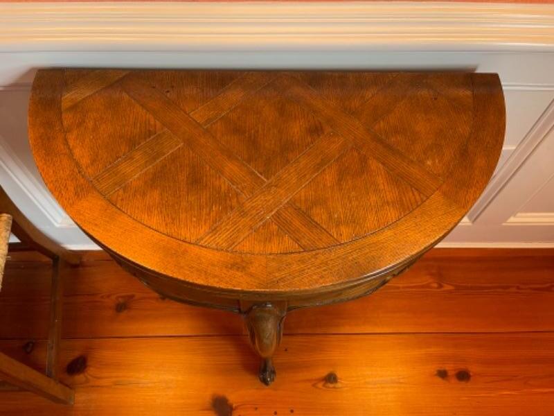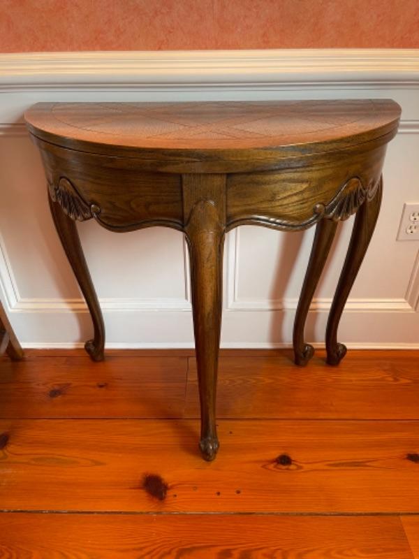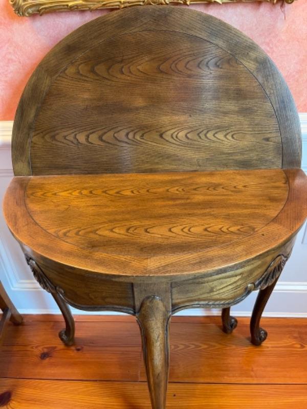 Queen Anne Style Game Table with Shell Motif measures 16” deep x 32” round folded out