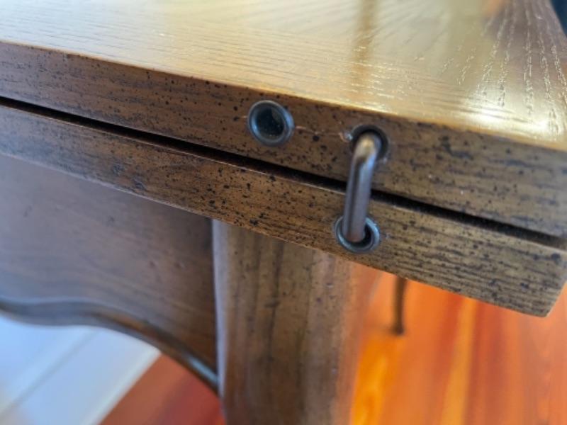 This table has a locking feature on the side and has light wear on the top