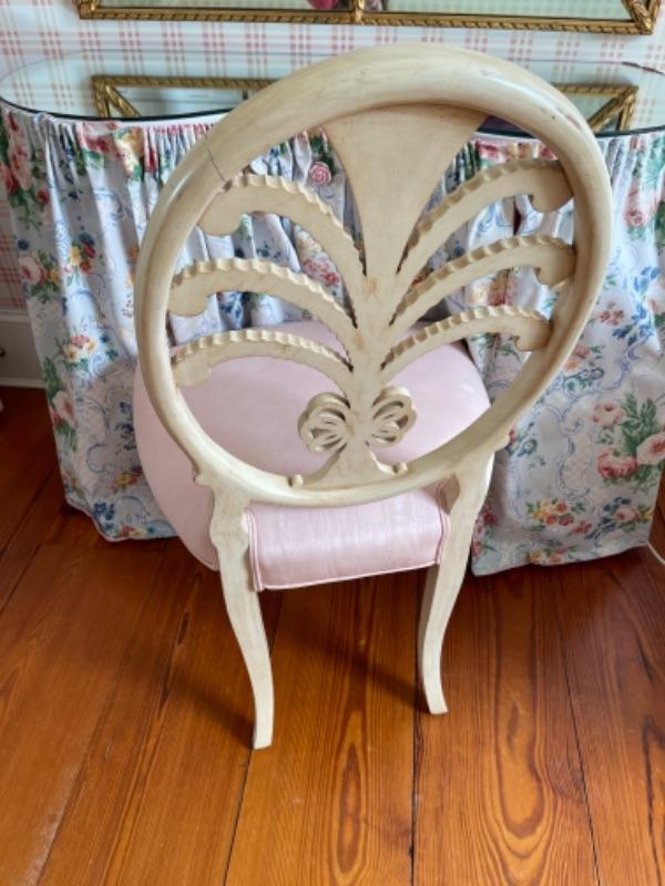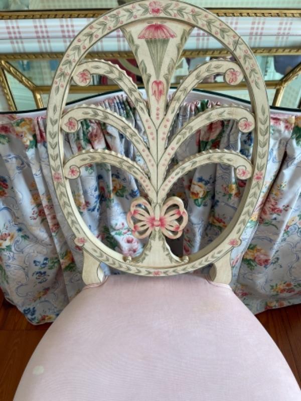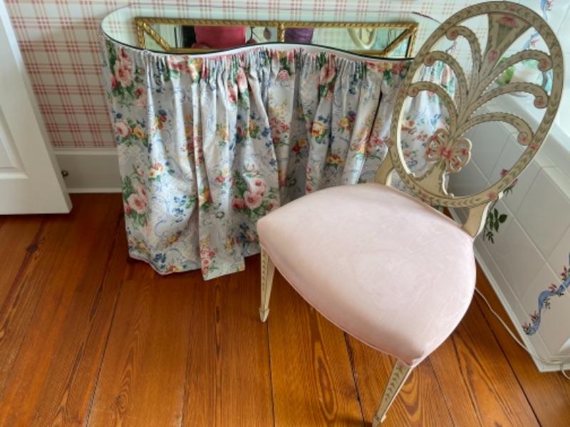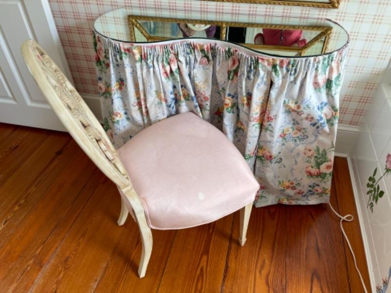 D314 Mirrored Top Kidney Shaped Skirted Vanity with Decorative Chair