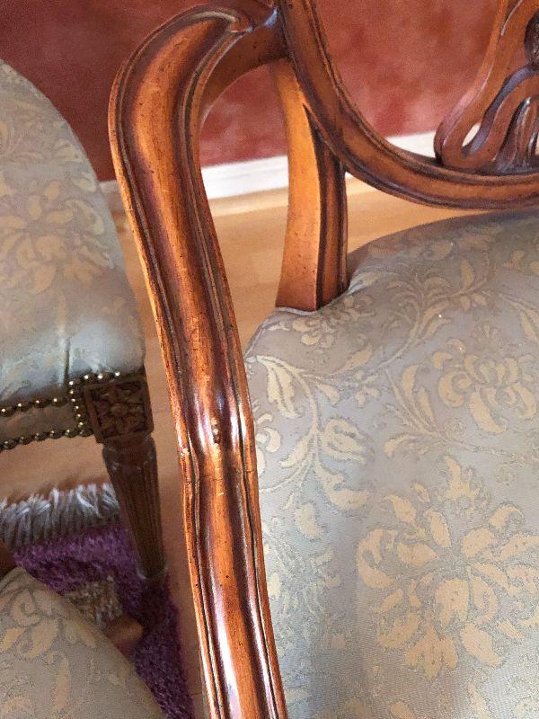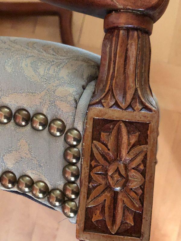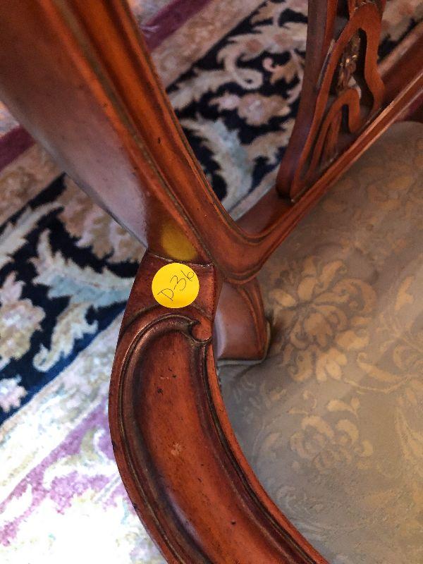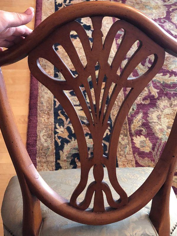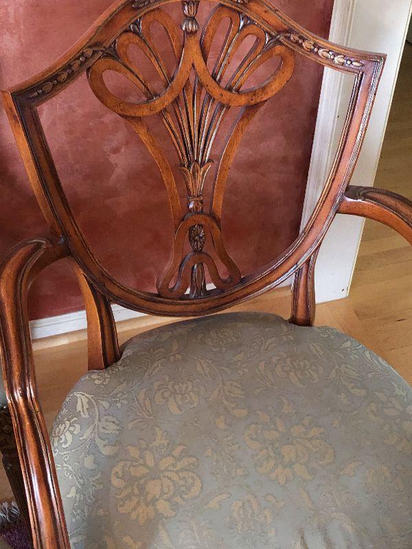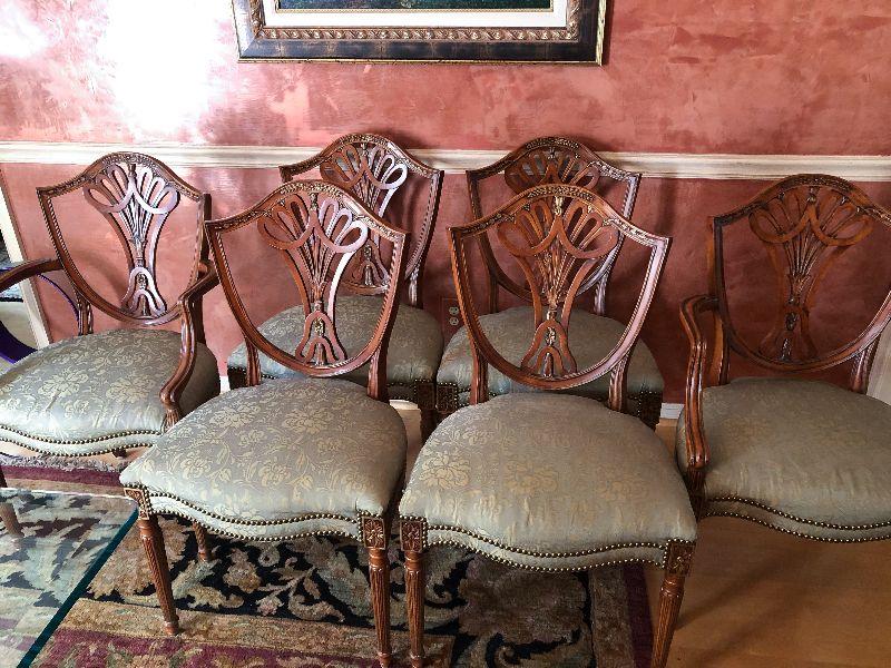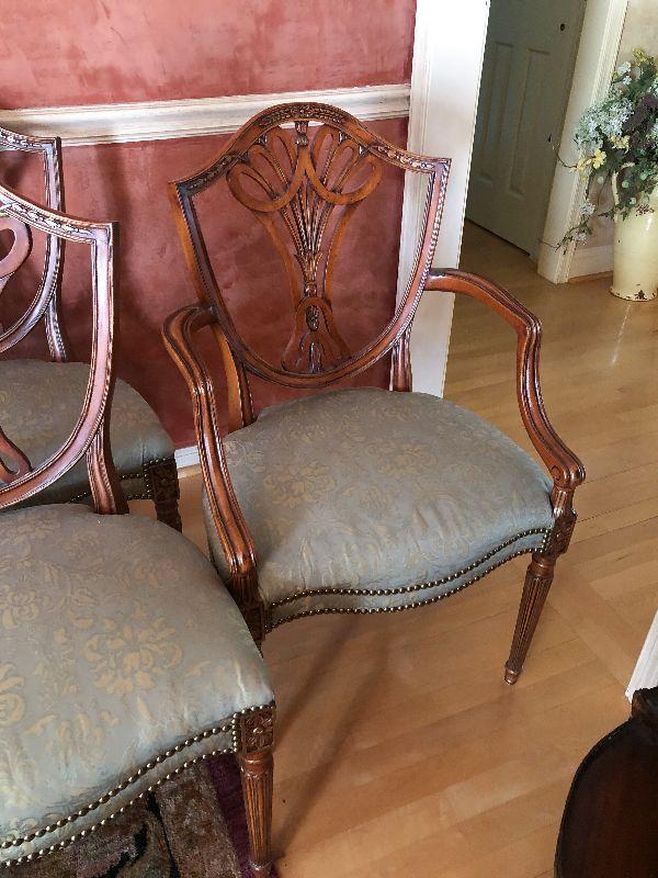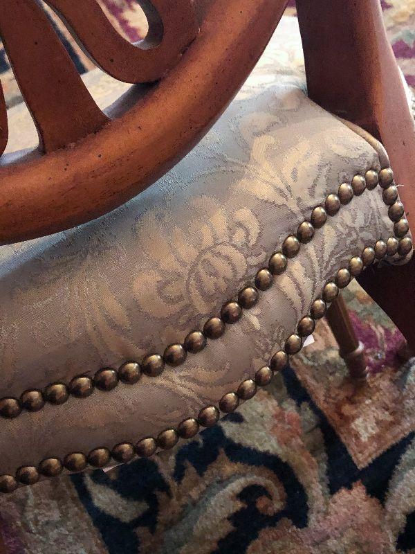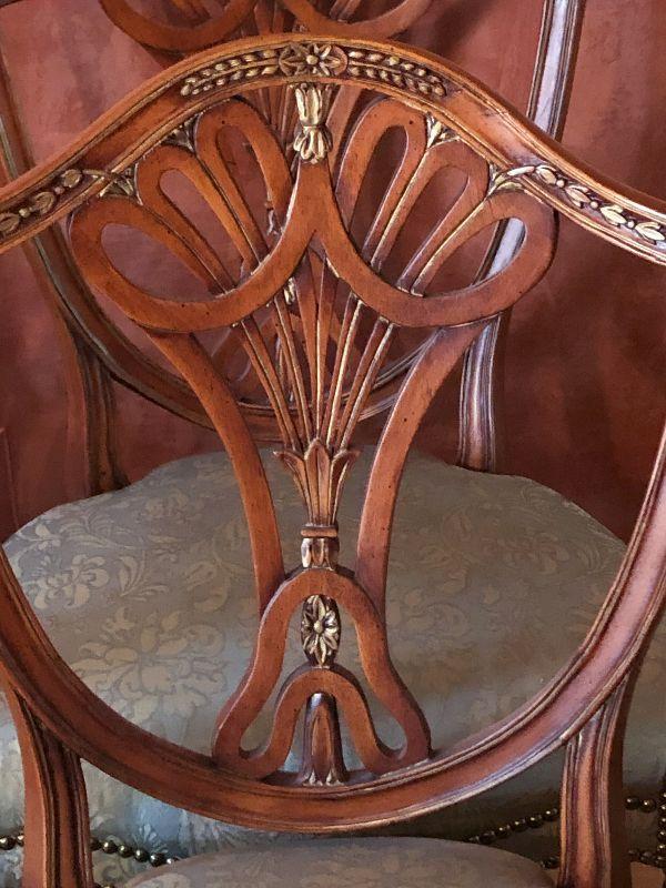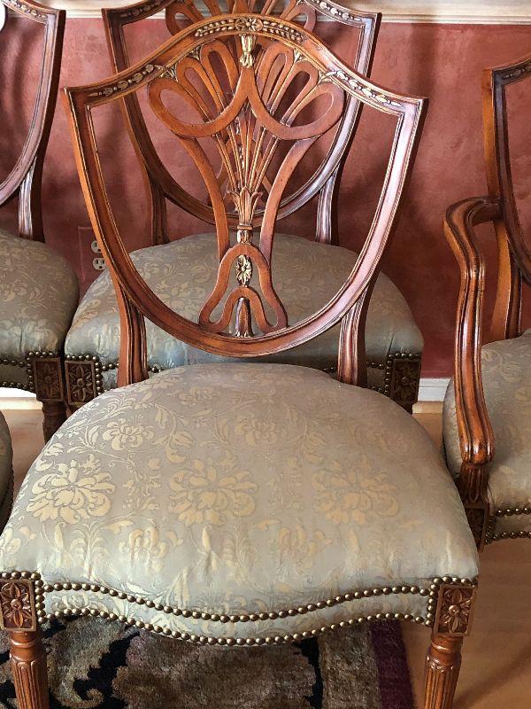 This is a beautiful set of dining chairs by Thomasville of NC. The quality is evident! The carved wood backs with gold hints, and brass studded seats! These chairs would make an excellent addition to any table, and make perfect accents in any room. Please see pics for sizing and condition. My client paid $8,000 for these gorgeous chairs, so don't be shy with those bids! Absolute stunning set of solid and beautiful chairs, worth every penny! Once in a lifetime chance to own $8,000 chairs for a song! Good luck with your bidding!
