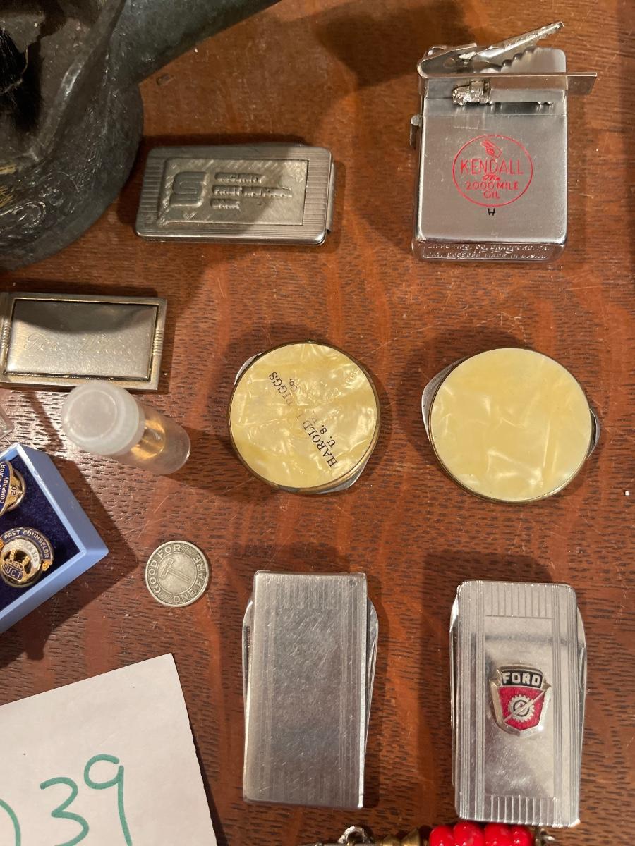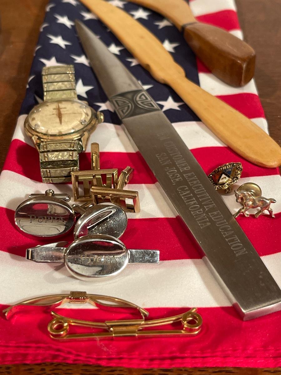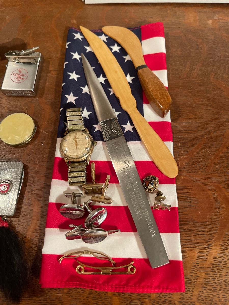 Tie clips, cufflinks, openers, pins, Belova watch, plus miscellaneous