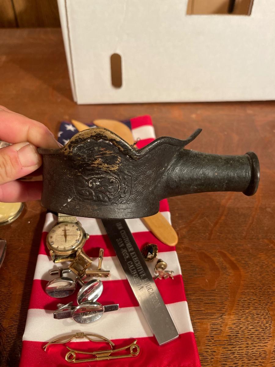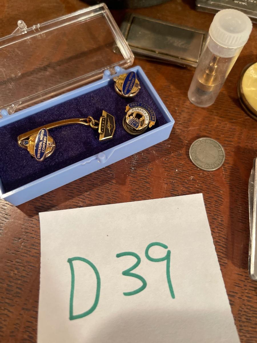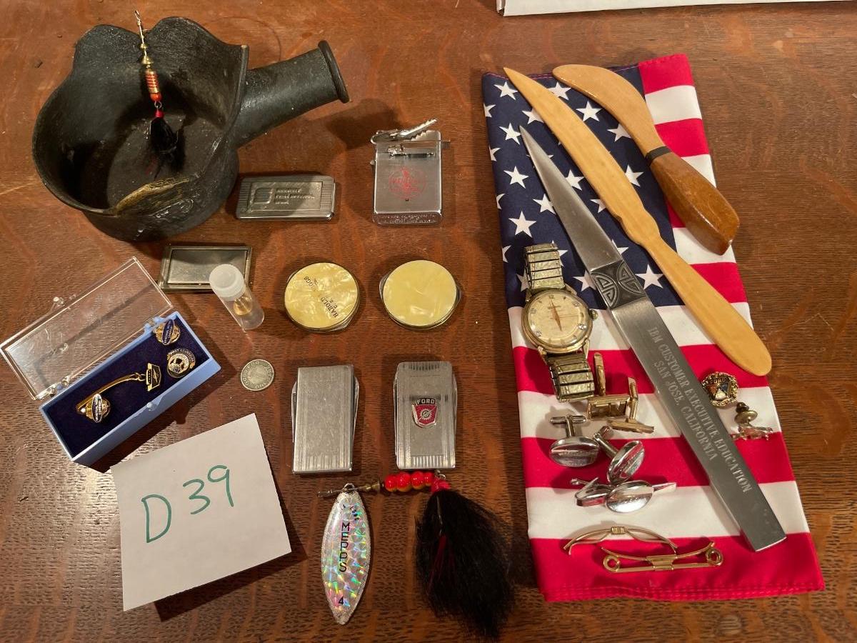 Tie clips, cufflinks, openers, pins, Belova watch, plus miscellaneous