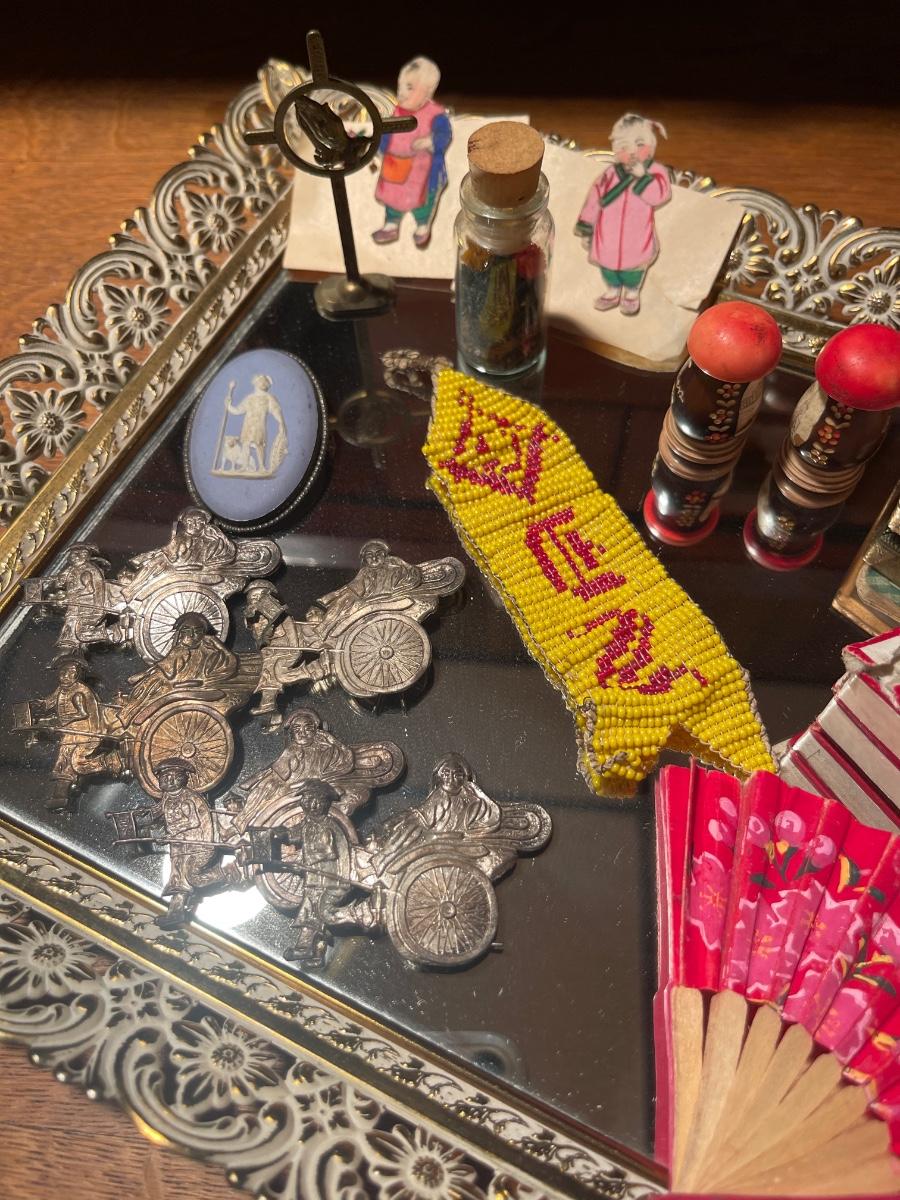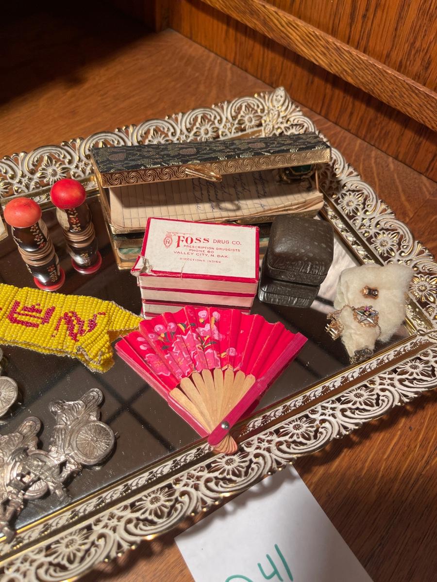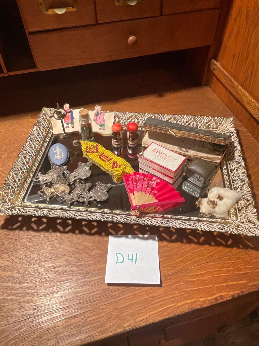 D41-Mirrored Tray, beadwork, pin, etc