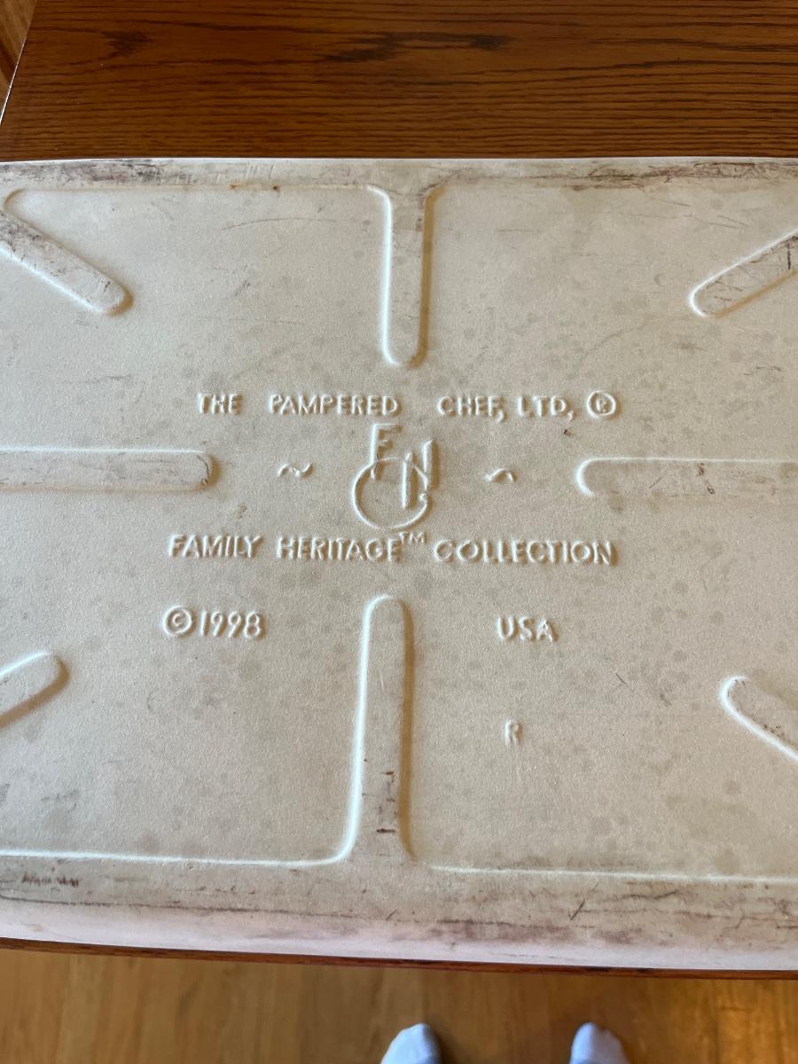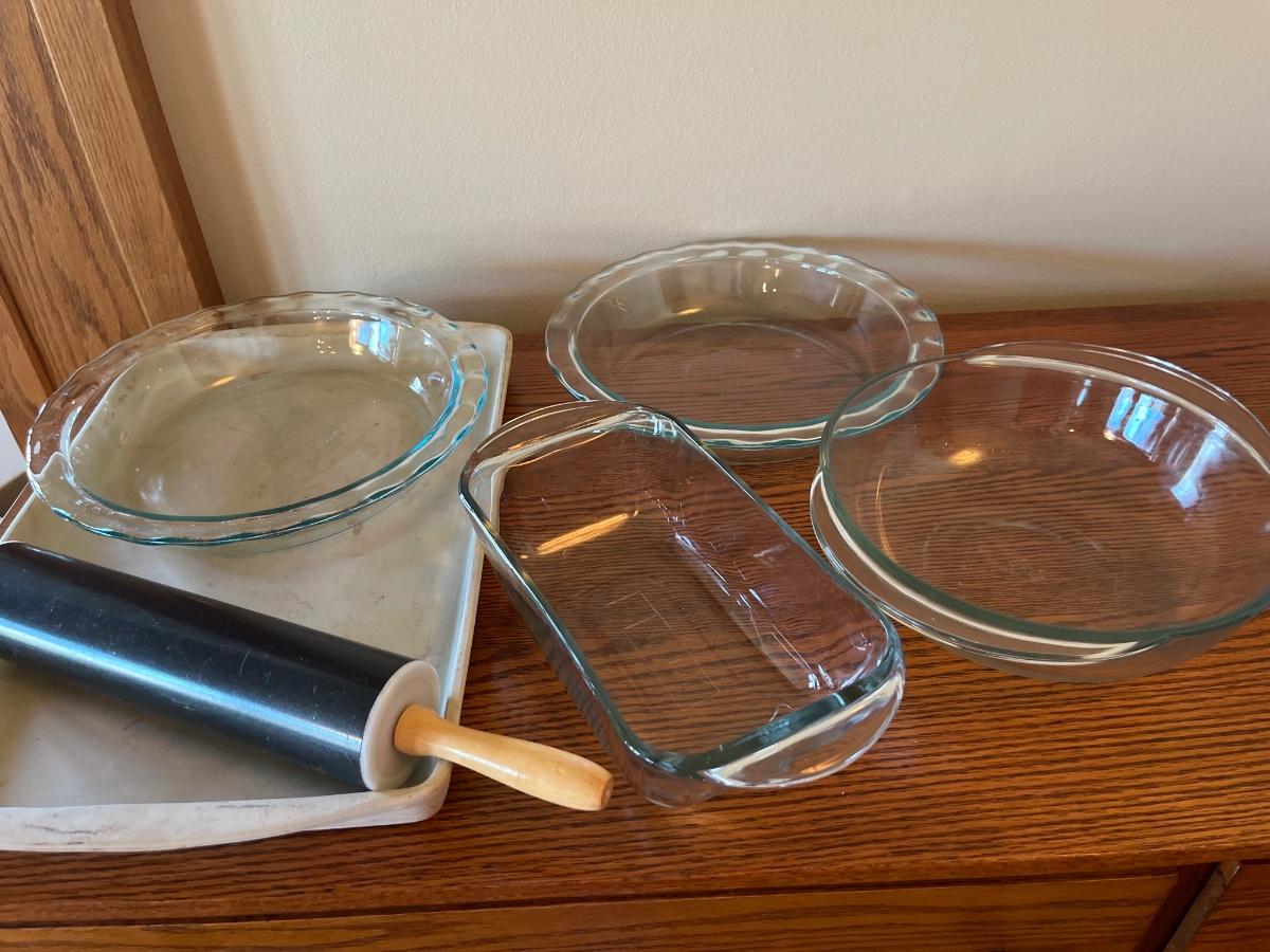 Pampered chef, baking pan, rolling pan, two pie plates, bread, pan, glass bowl