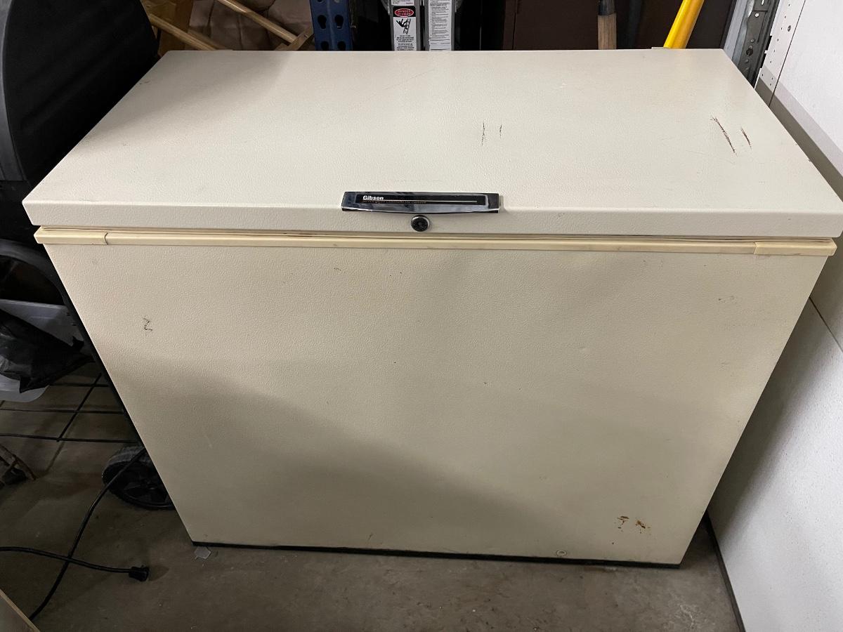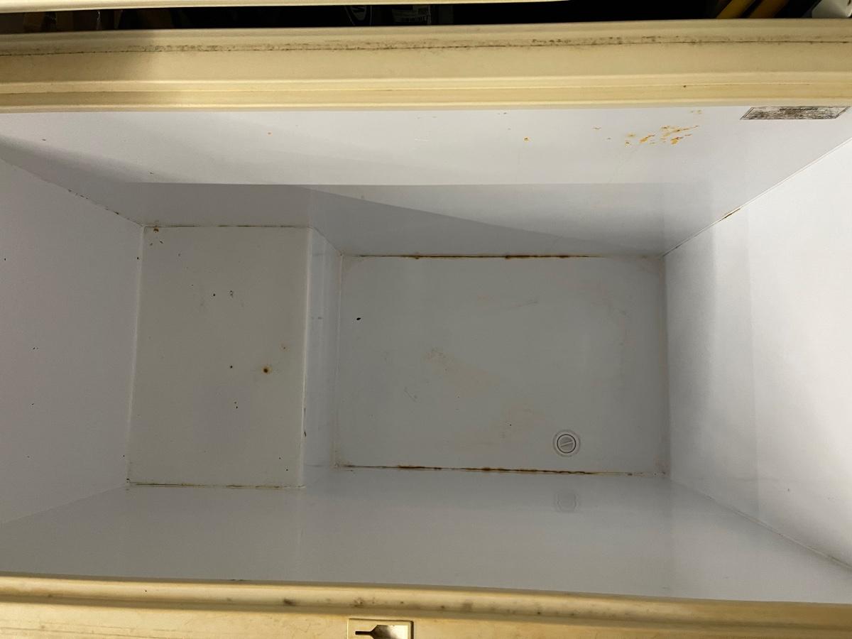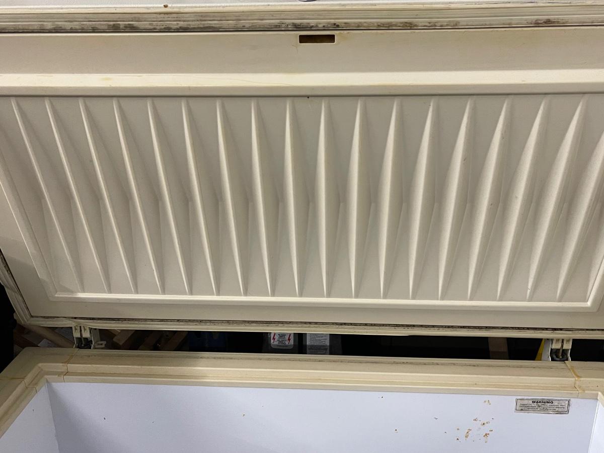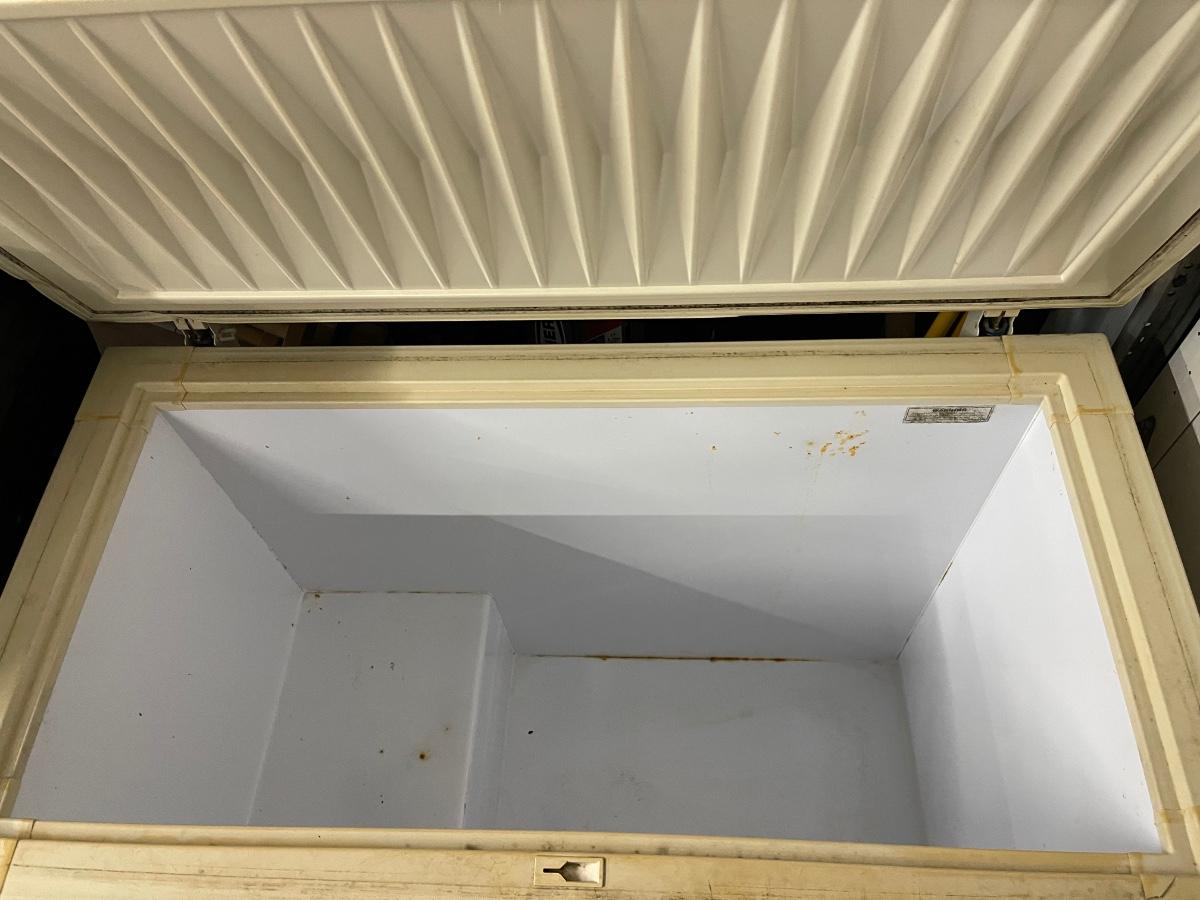 D5 deep freezer, seal needs cleaning and top lining is sagging, but works well. 21.5 d, 41” w, 34.5 tall