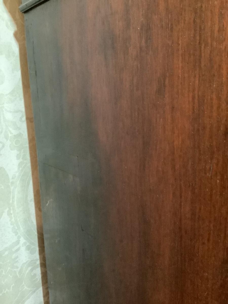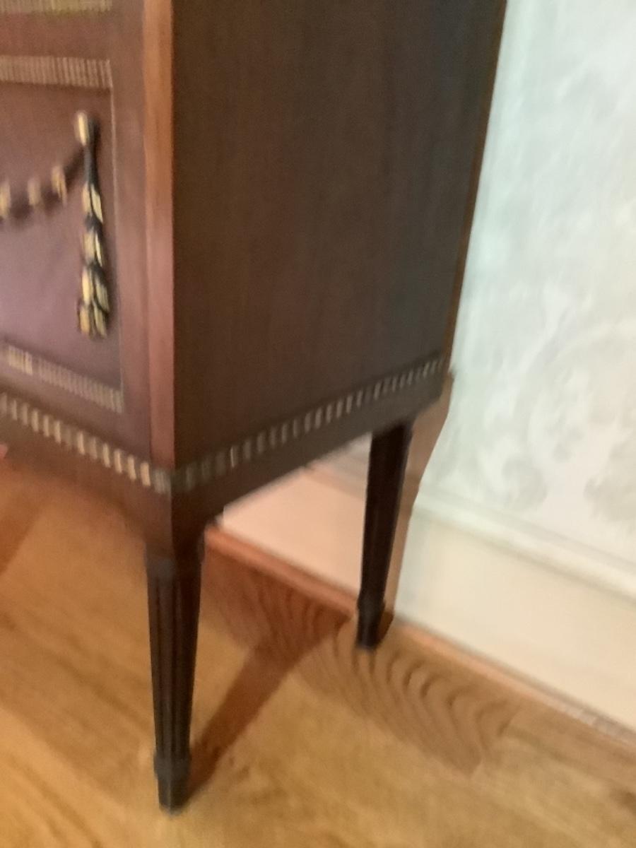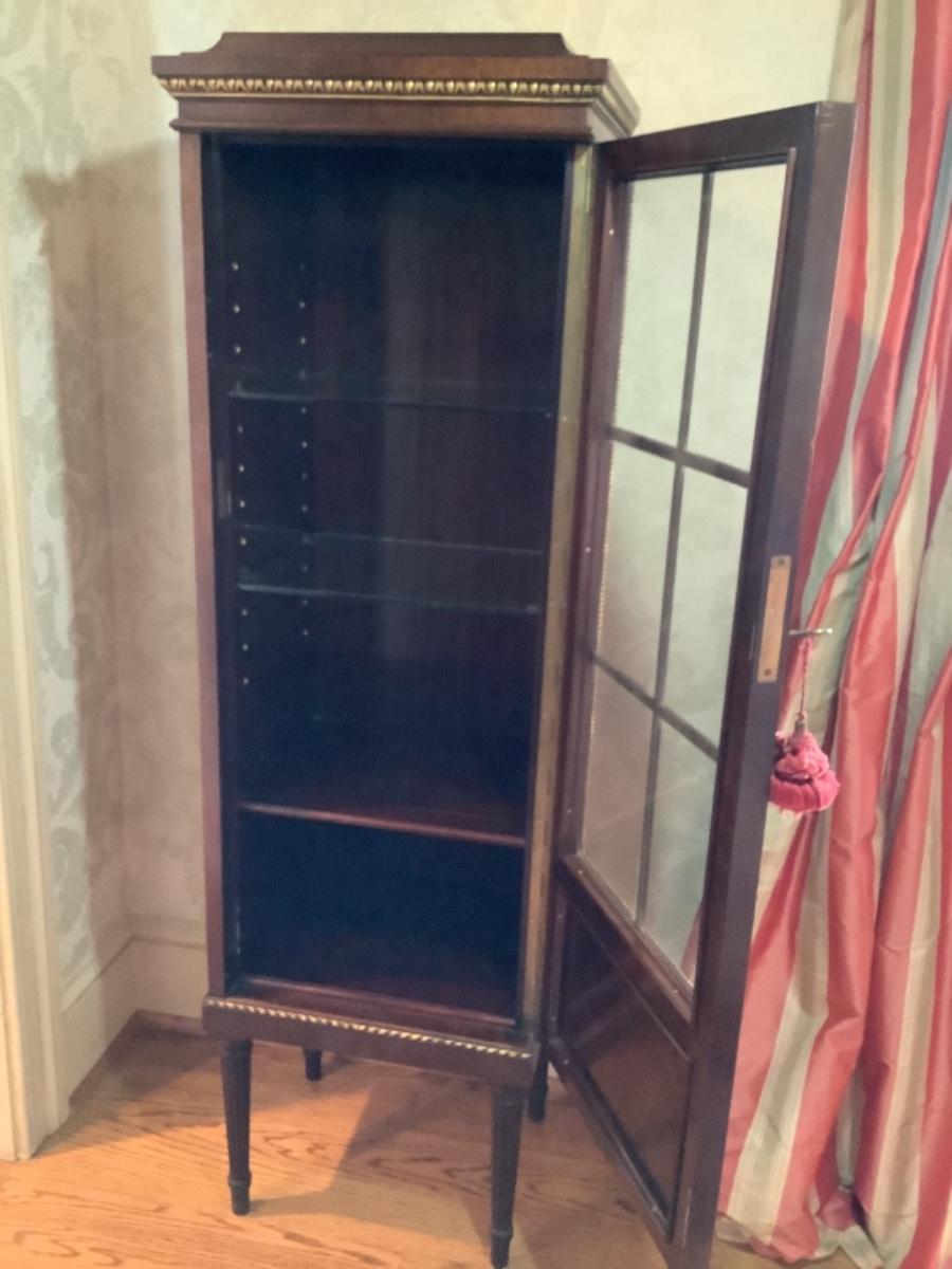 Antique French style mahogany glass cabinet with 2 adjustable glass shelves and repair on right side