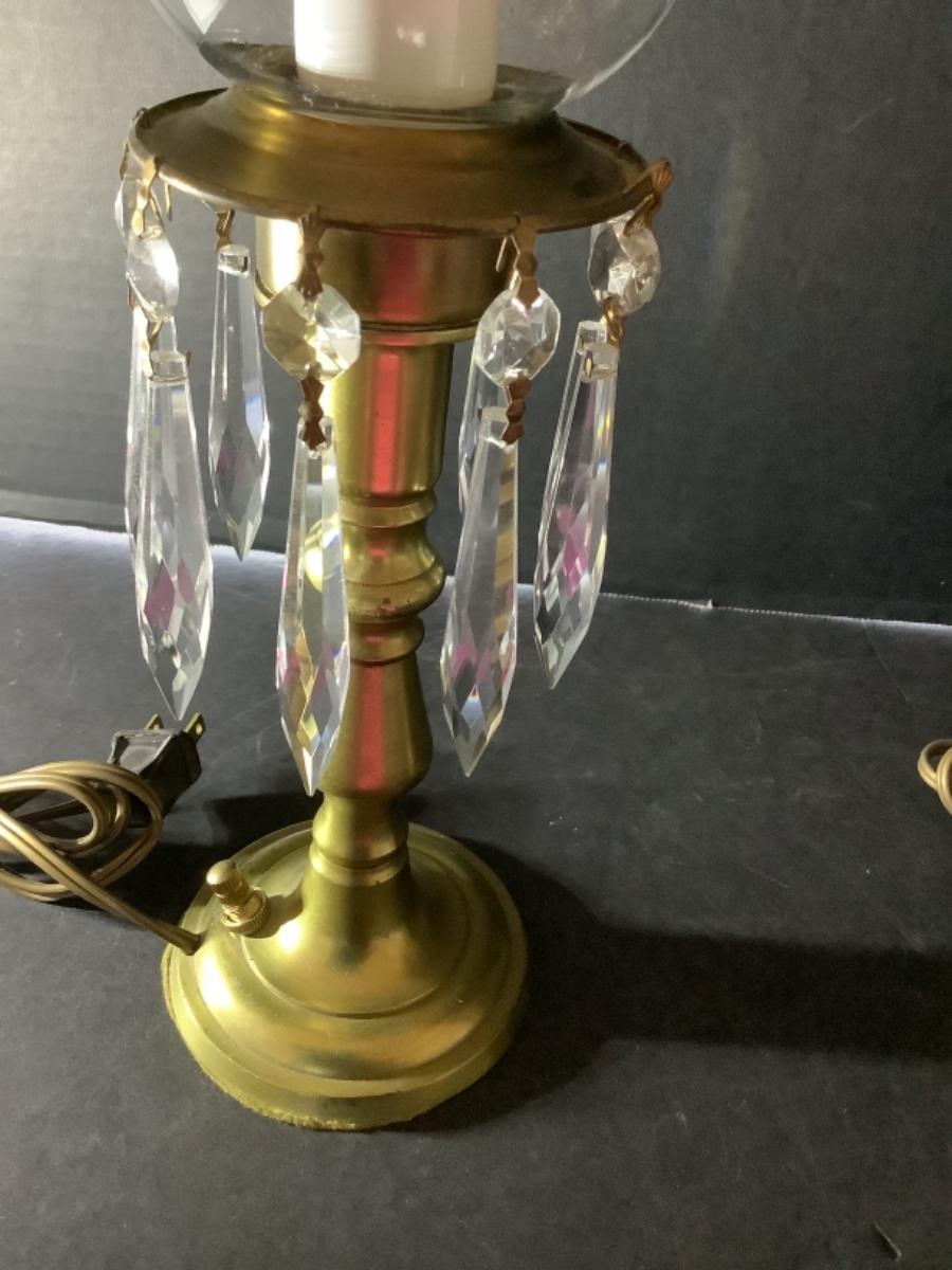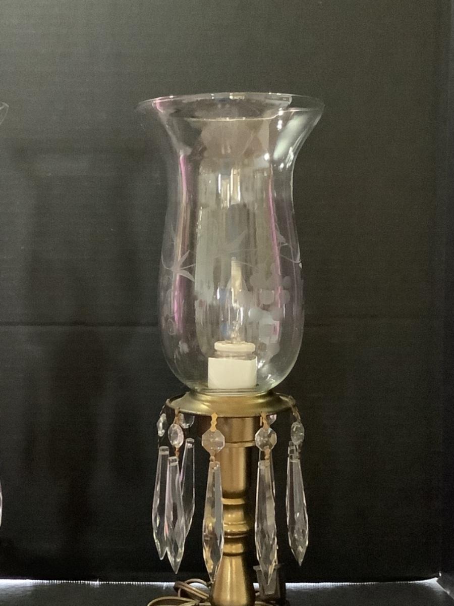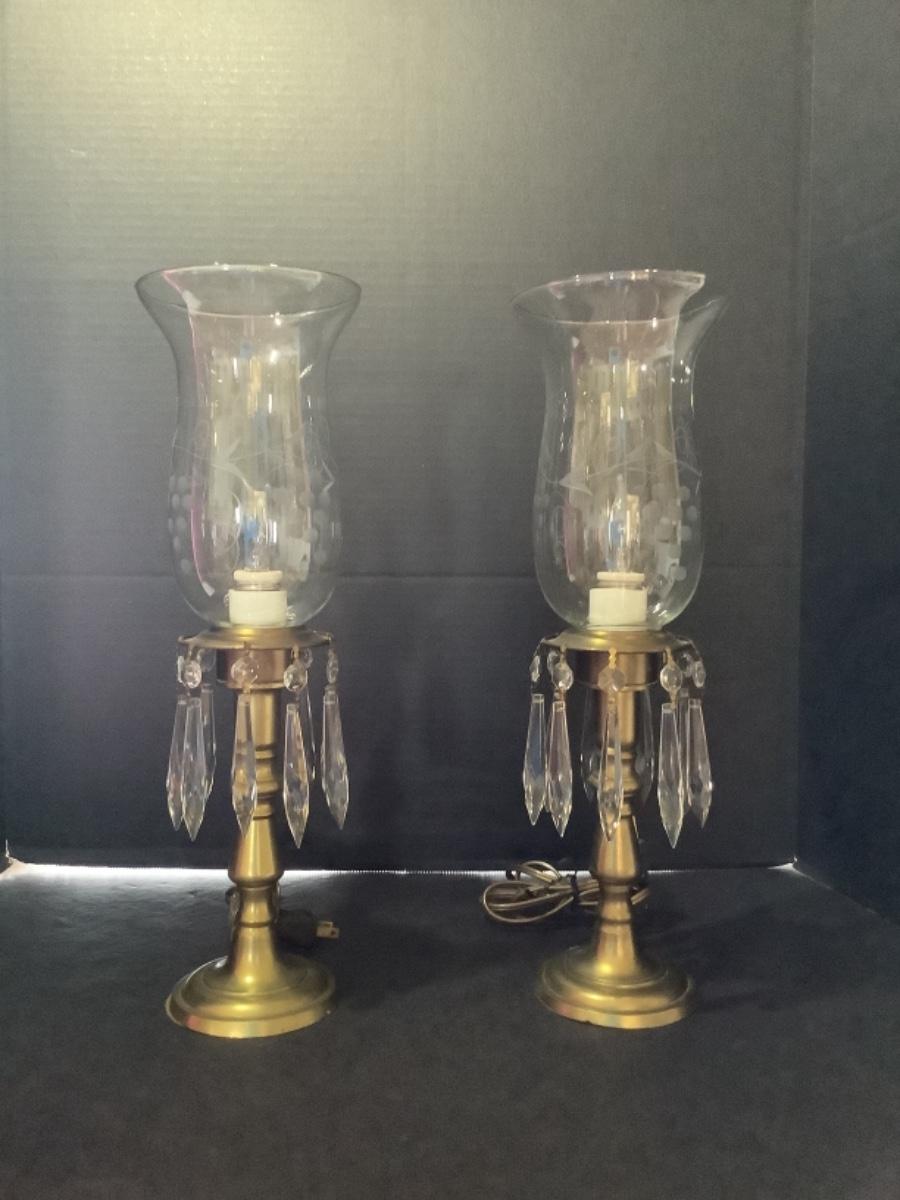 D523 Pair of Brass Mantel Lamps with Etched Glass Globes and Prisms