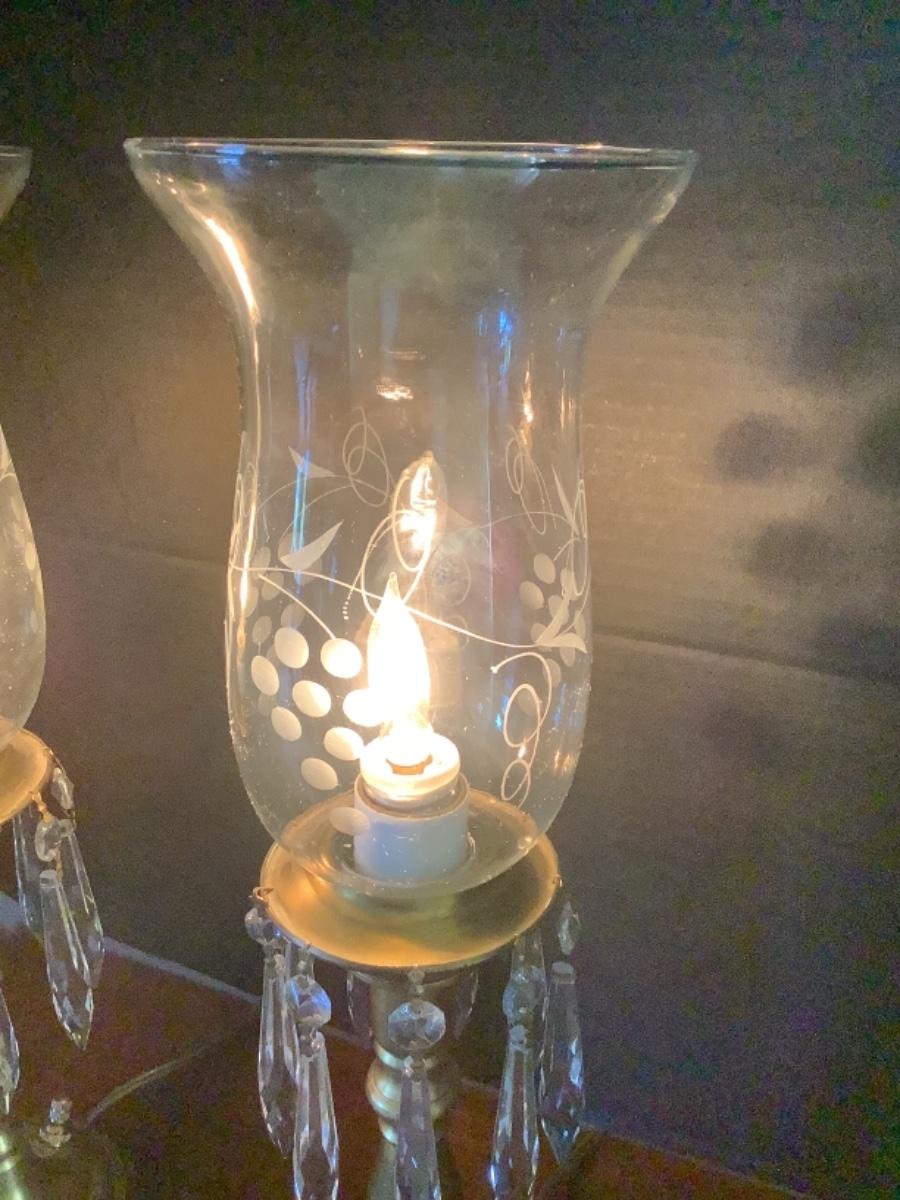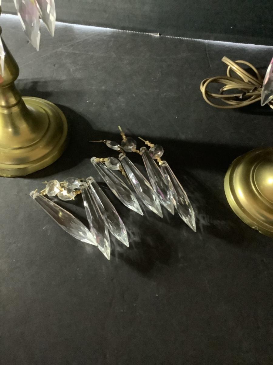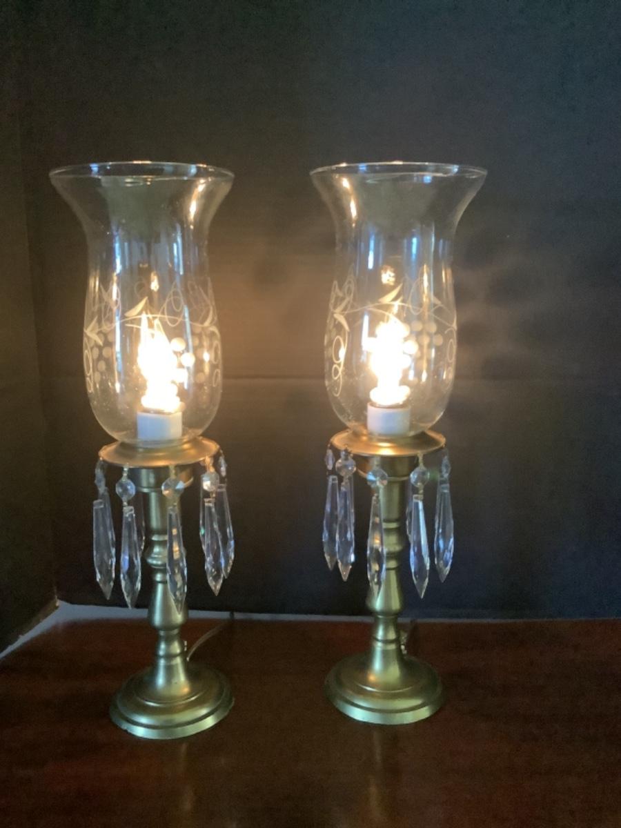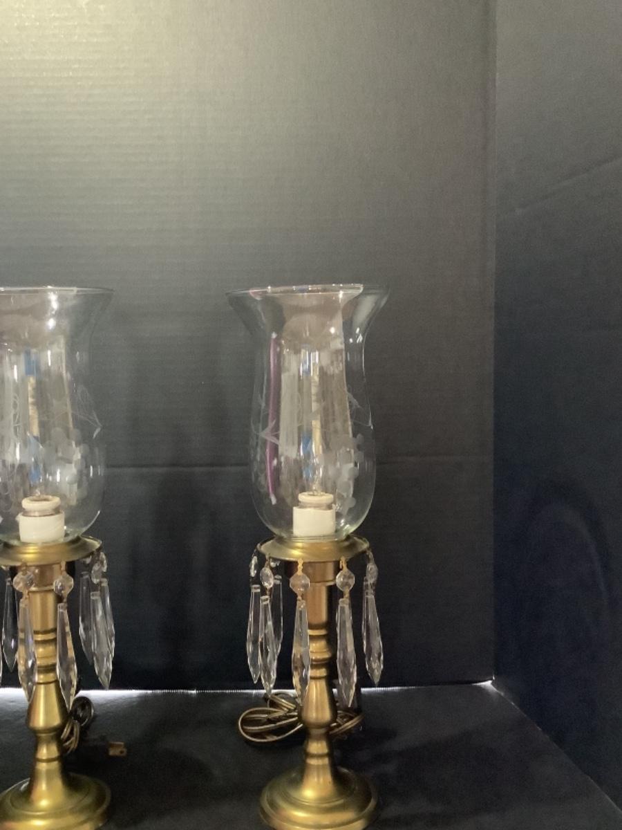 D523 Pair of Brass Mantel Lamps with Etched Glass Globes and Prisms