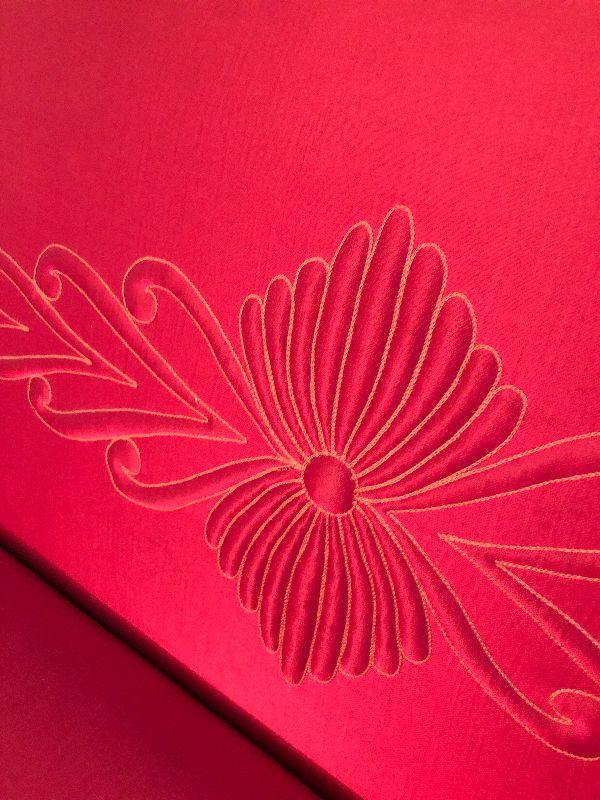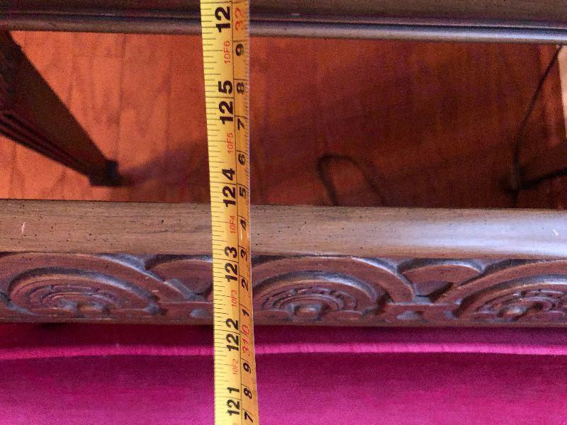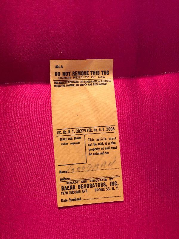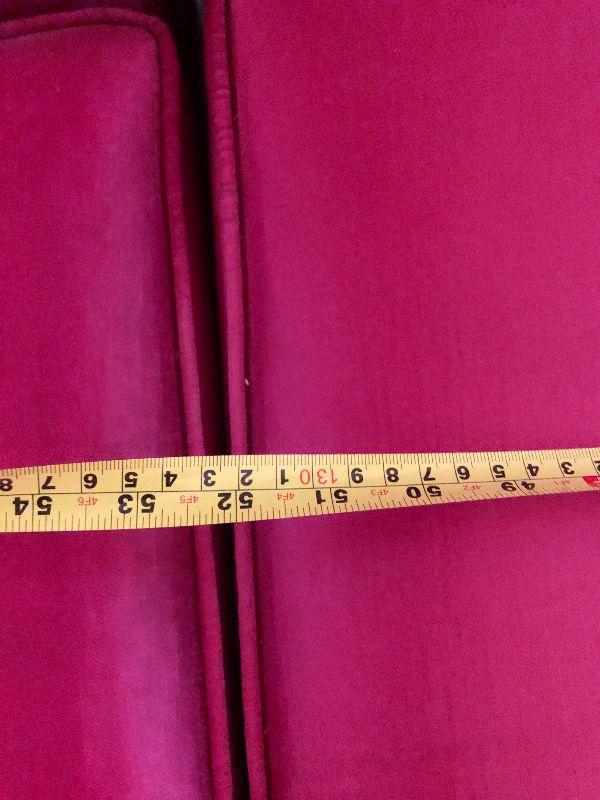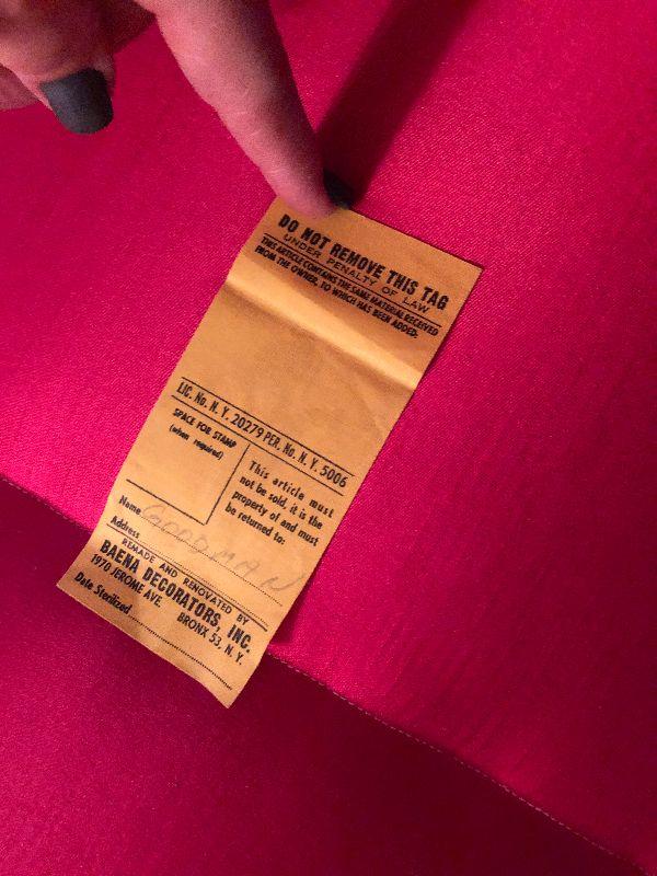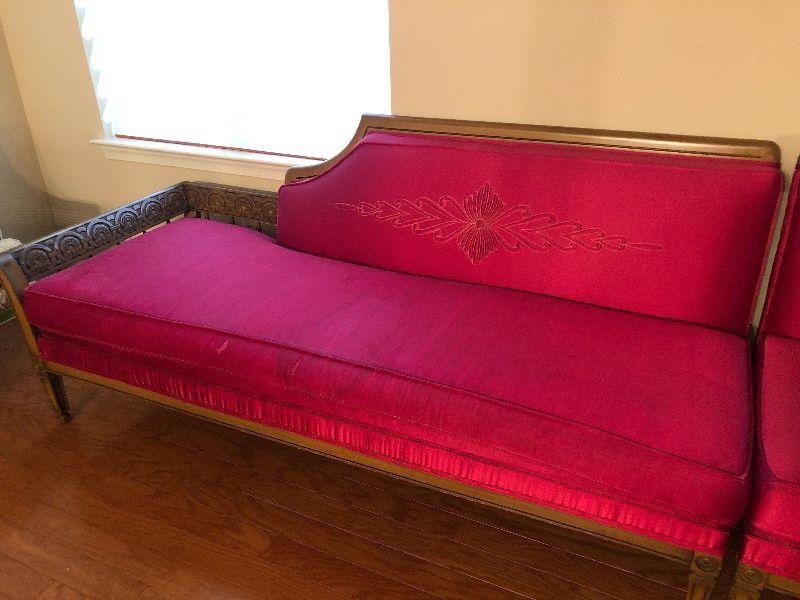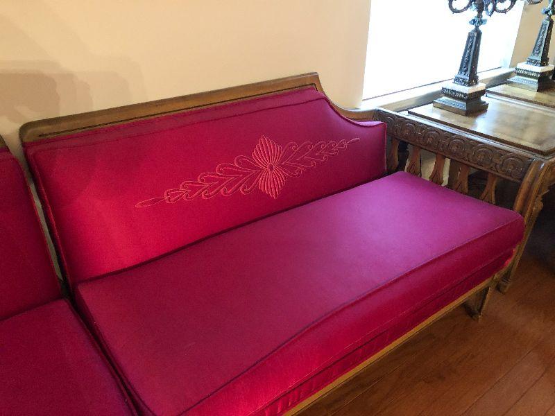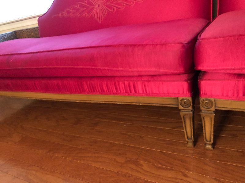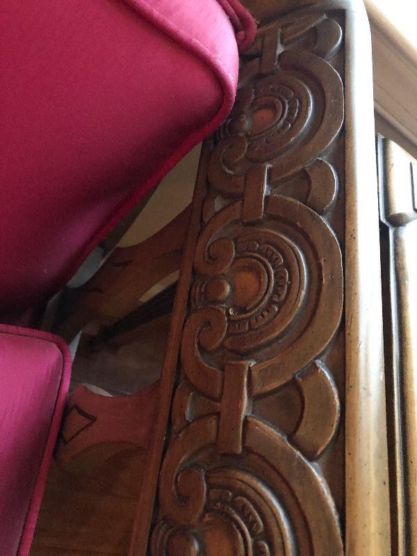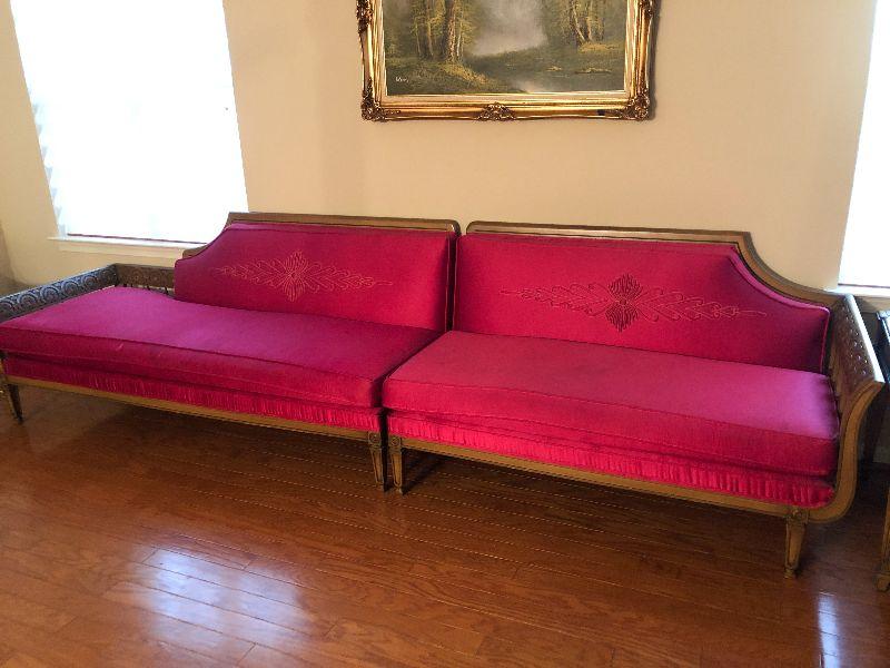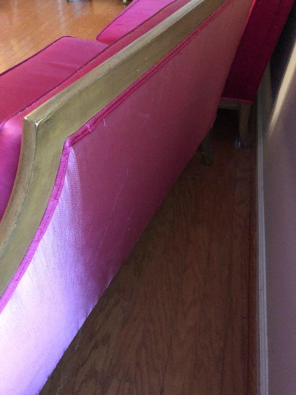 With a bit of an Asian flare, this beautiful 10' sofa is a statement piece. Is two pieces so could be configured several ways. The filling in the bottom cushions is starting to harden and will need replacing. And the fabric needs cleaning. This was purchased in New York mid-century from a furniture restorer.