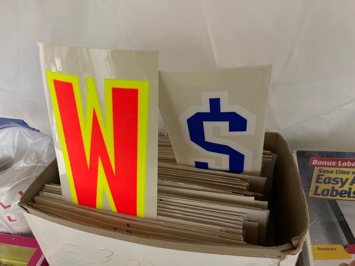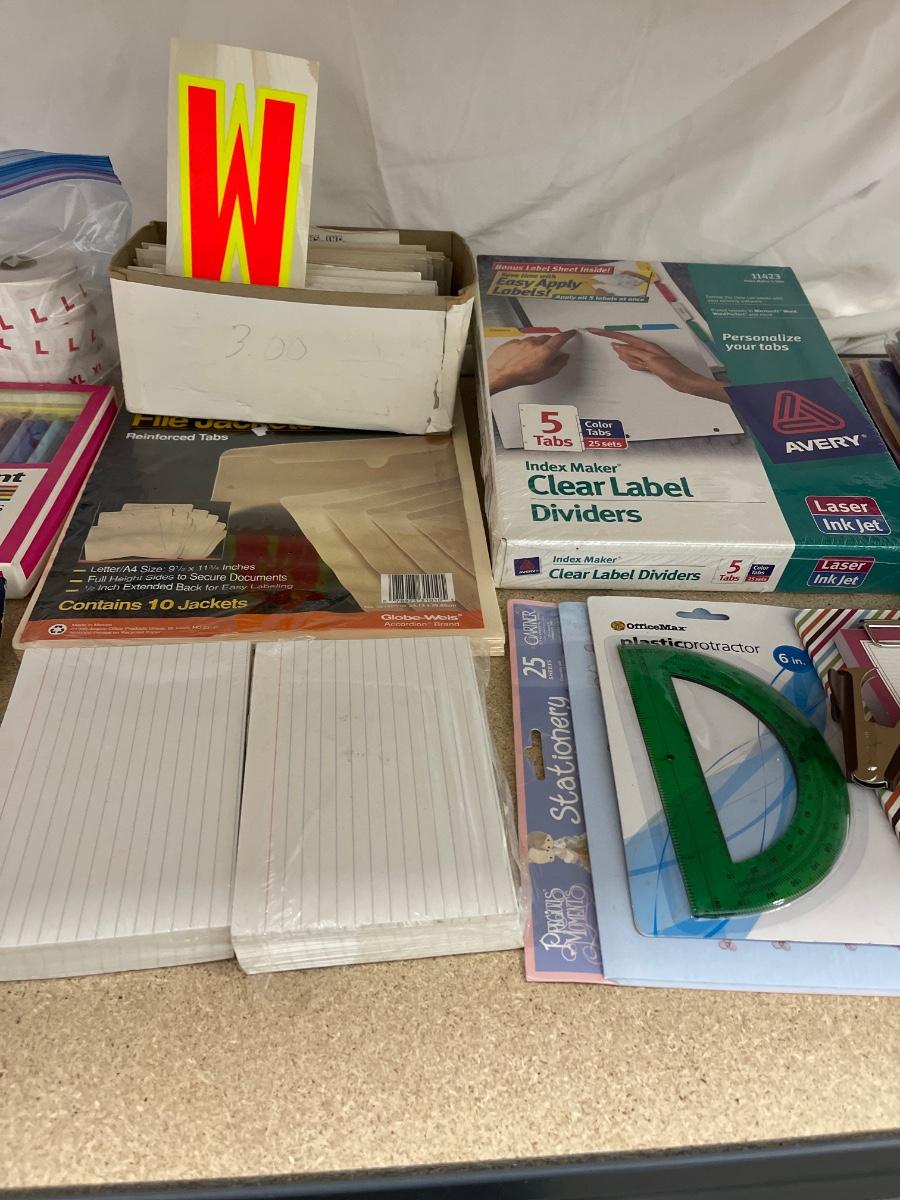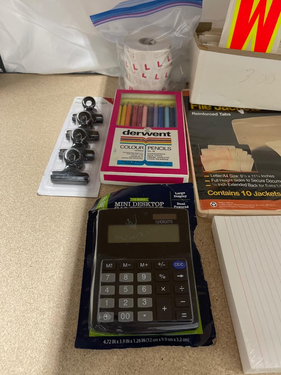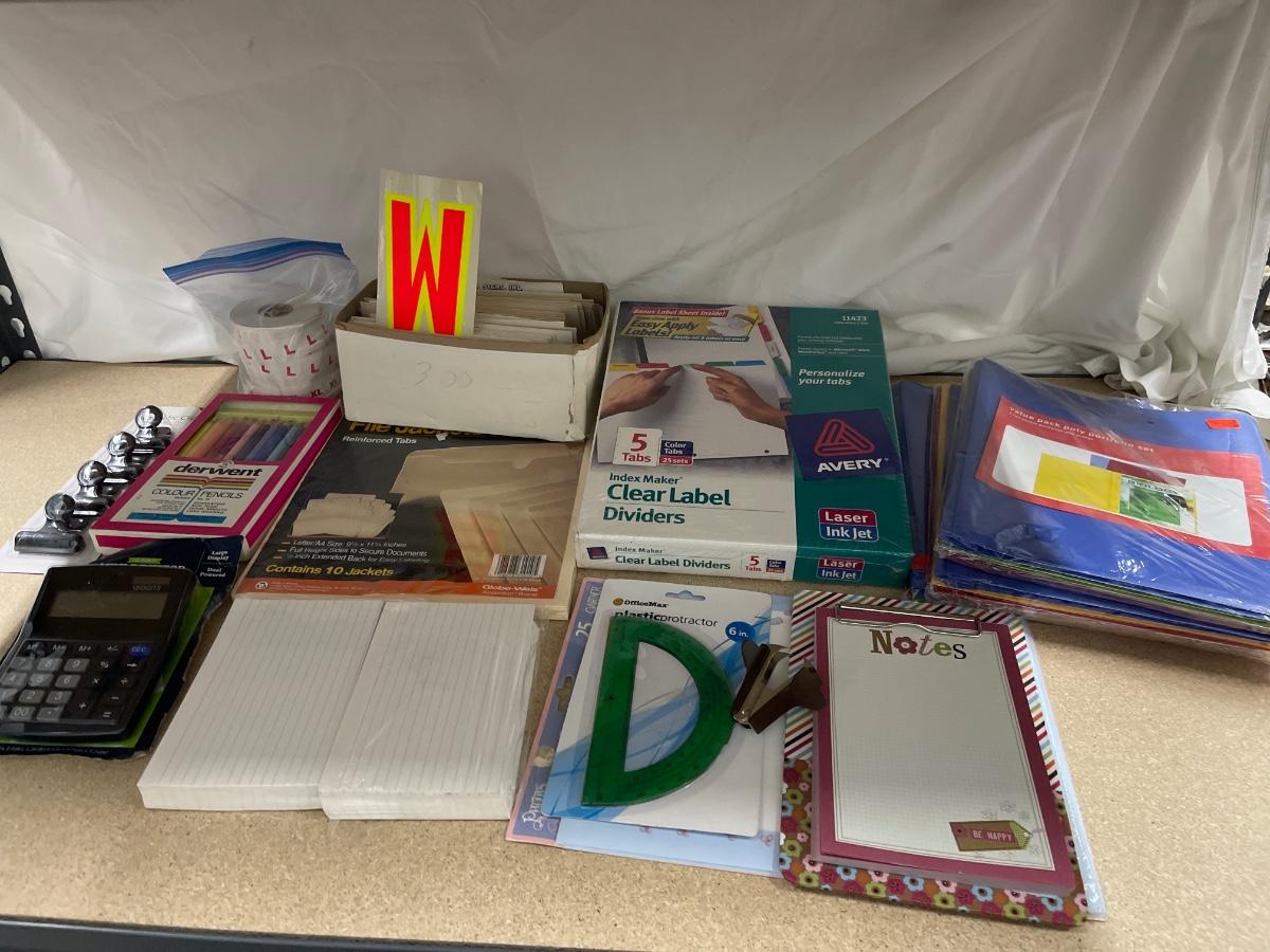 Mini calculator, colored pencils, magnetic clips, sizing stickers, manila file jackets, large index cards, plastic protractor, staple remover, small clipboard with notepad, stationery, clear label dividers, folders, window cling letters/numbers/symbols.