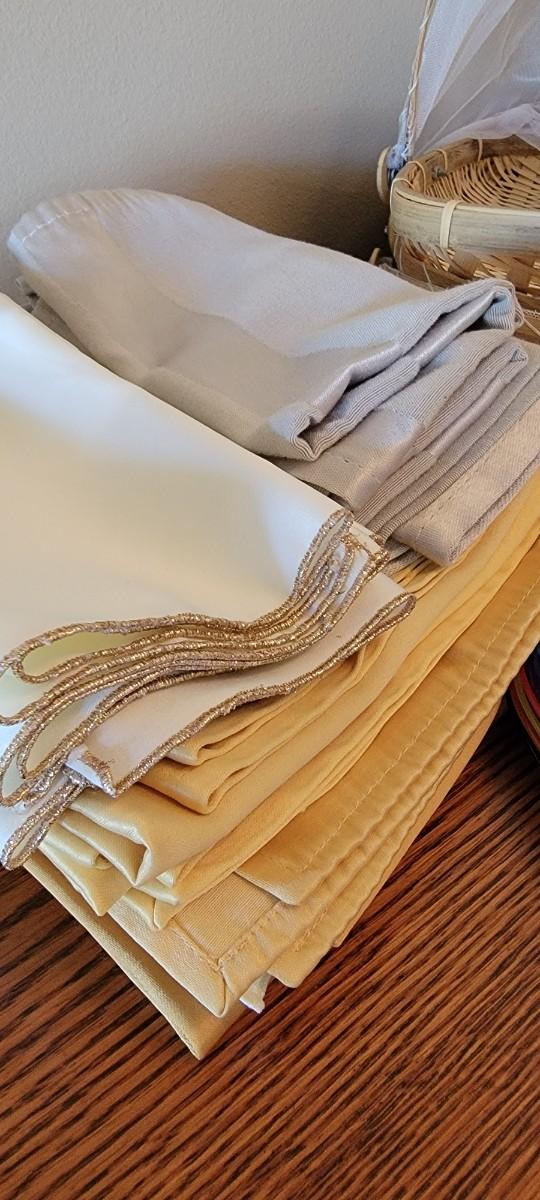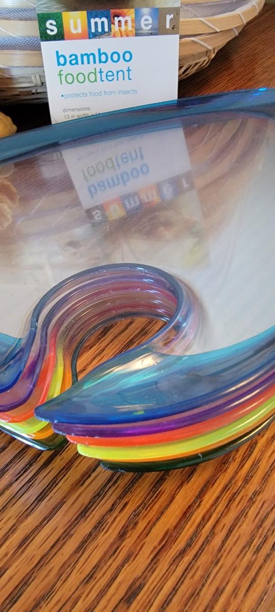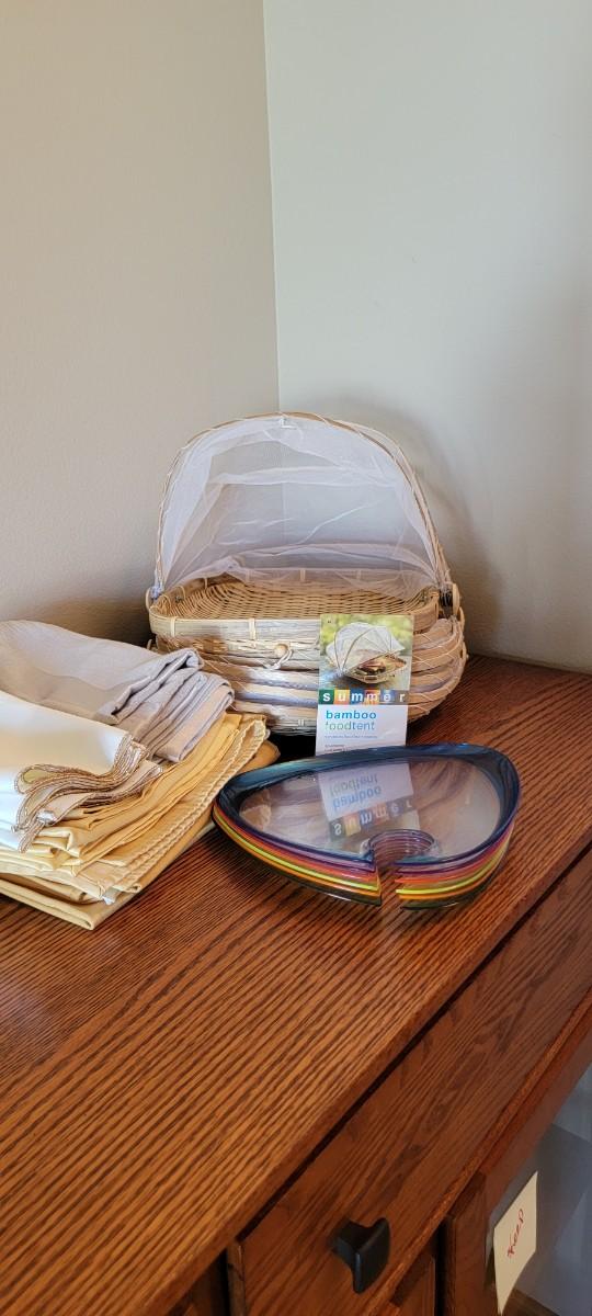 D-56 Six plastic serving plates, three bamboo food tents, assorted cloth napkins