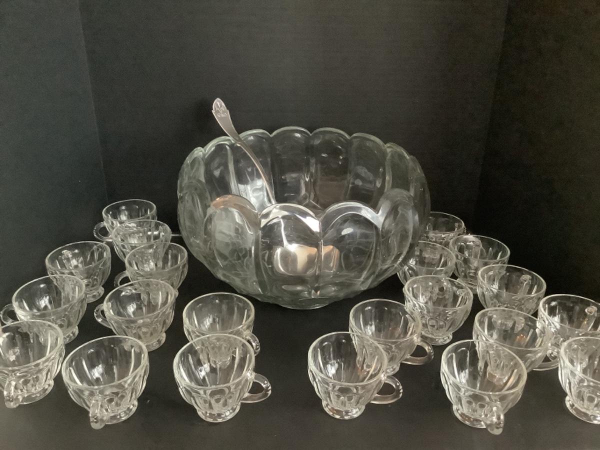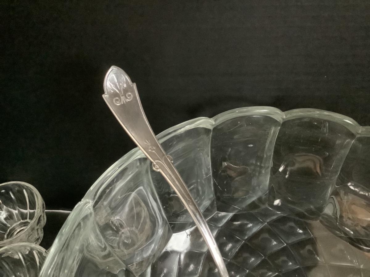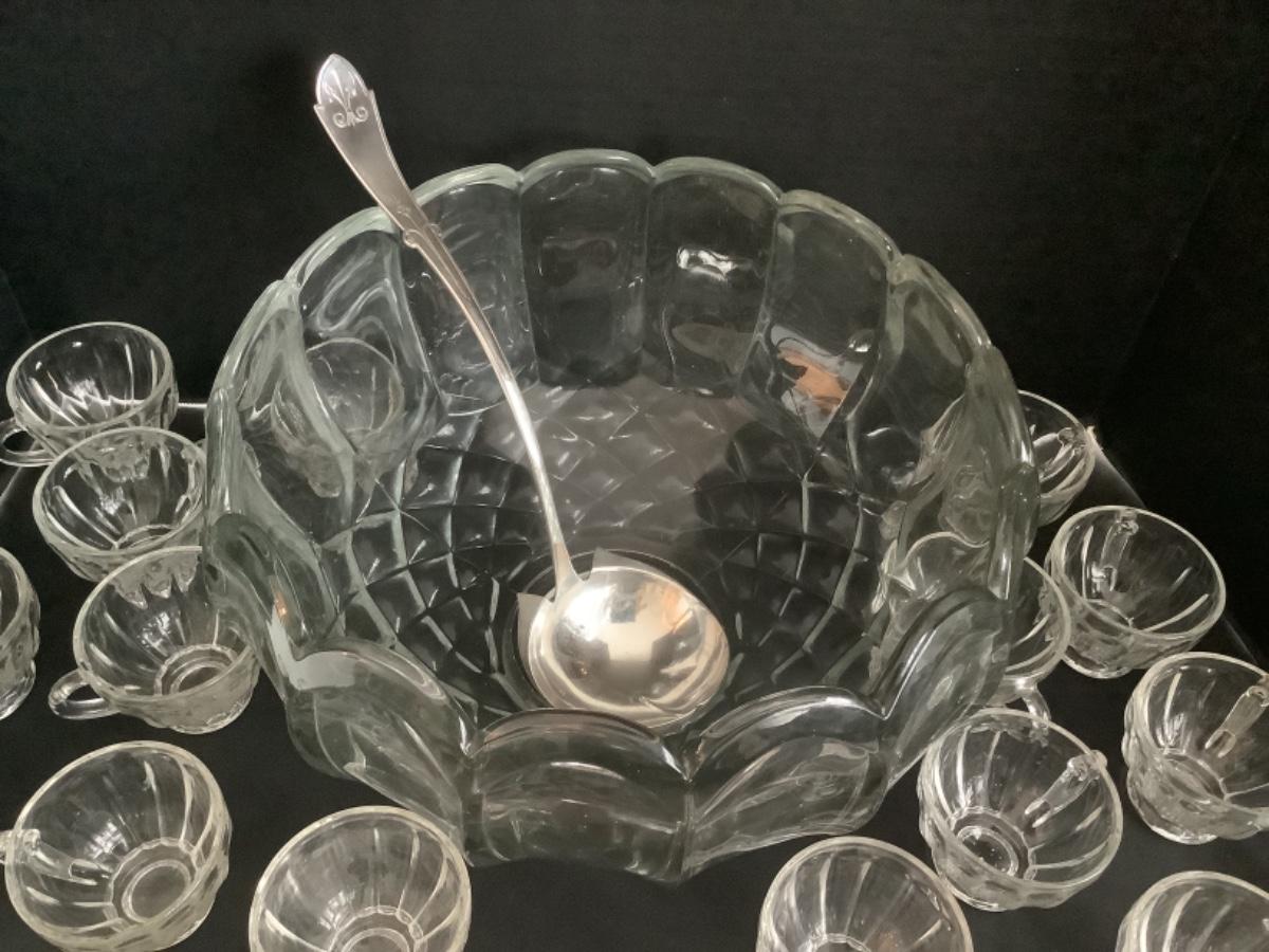 D572 Vintage Glass Punch Bowl with Cups and Ladle